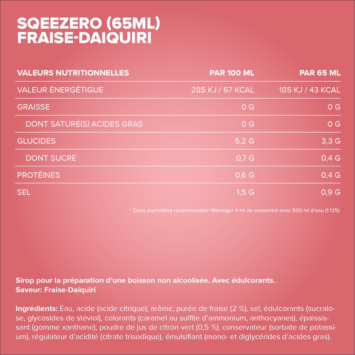 Water, zuurteregelaar (citroenzuur), aroma, aardbeienpuree (2%), zout, zoetstoffen (sucralose, steviolglycosiden uit stevia), kleurstoffen (ammoniumsulfietkaramel, anthocyanen), verdikkingsmiddel (xanthaangom), limoensappoeder (0,5%), conserveermiddel (kaliumsorbaat), zoetstof (natriumsaccharine), emulgator (mono- en diglyceriden van vetzuren).
