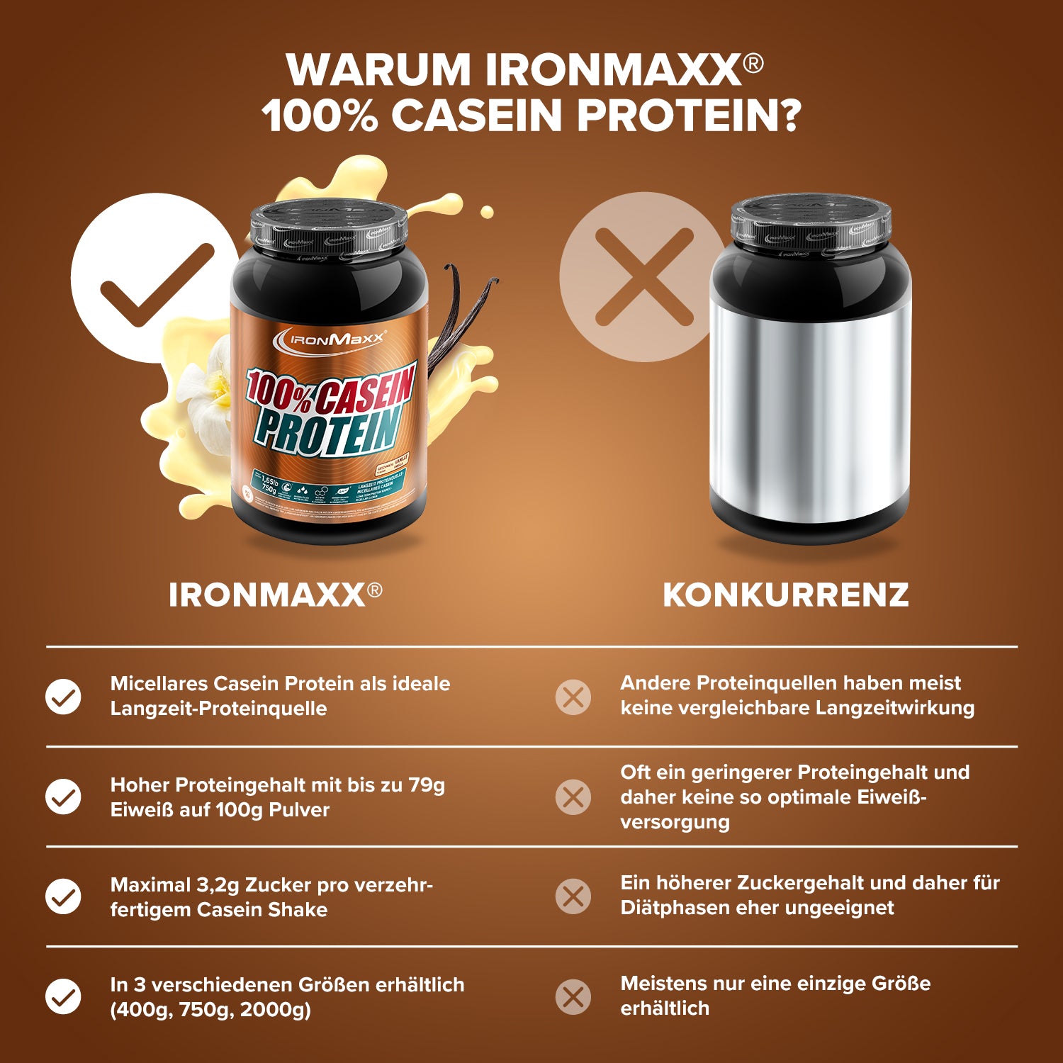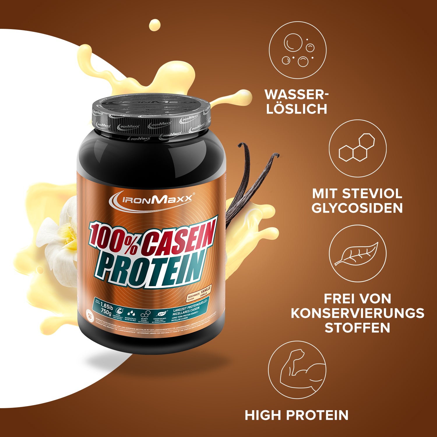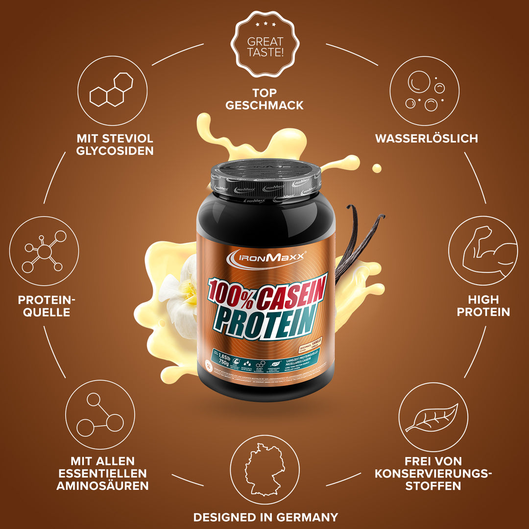 100% Casein Protein von IronMaxx® versorgt deine Muskulatur über viele Stunden mit hochwertigem Eiweiß – ideal vor dem Schlafengehen oder in längeren Fastenphasen. Mit einem Proteingehalt von bis zu 79 % und niedrigem Zuckergehalt ist es die perfekte Wahl für Muskelaufbau und Diätphasen.