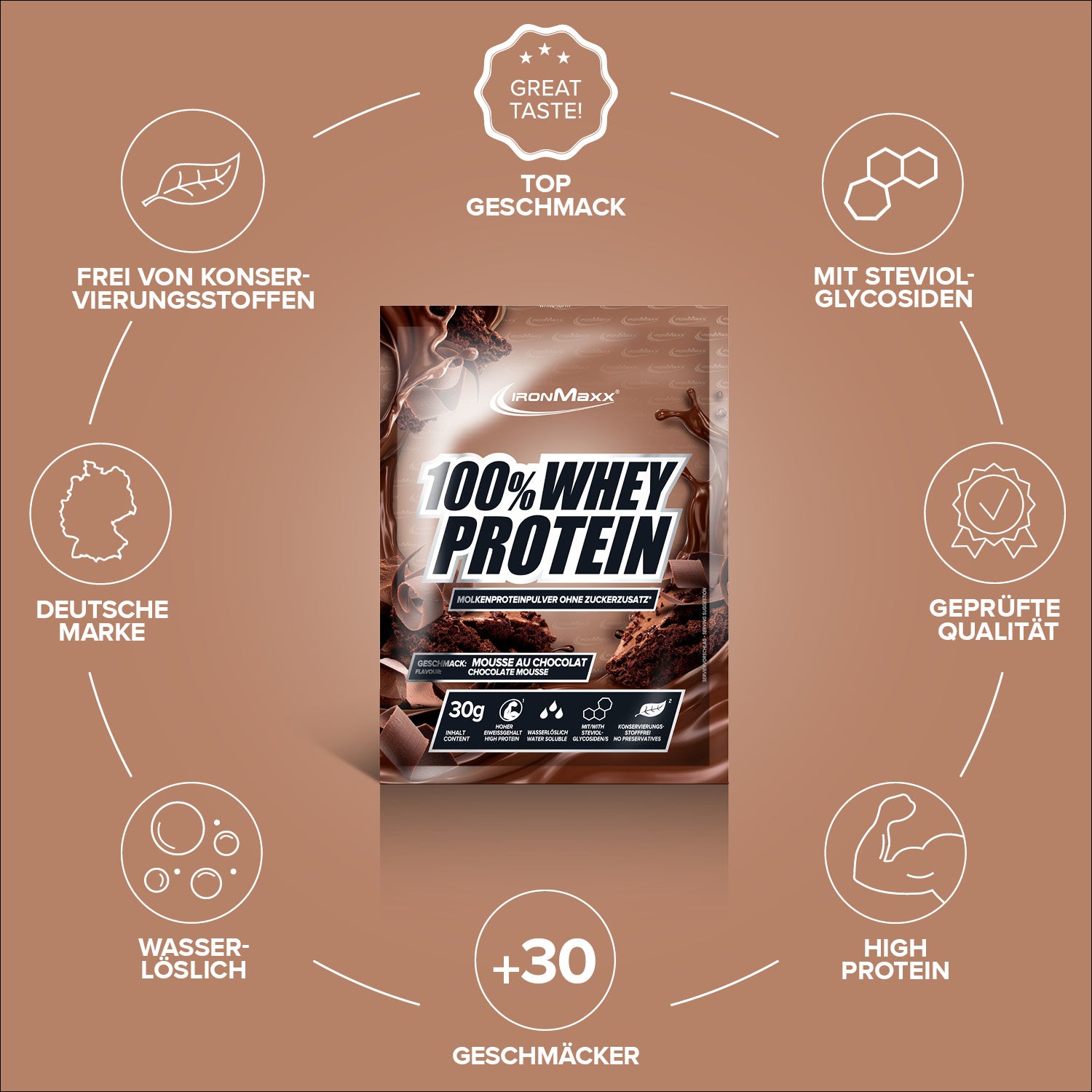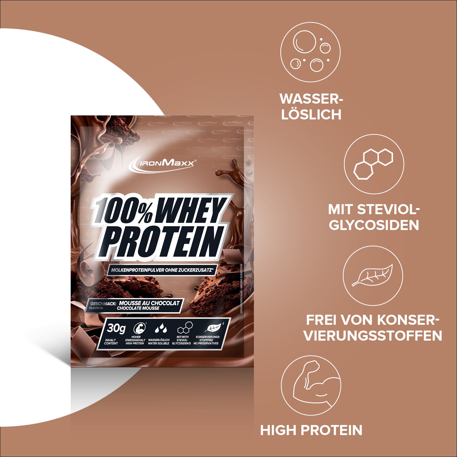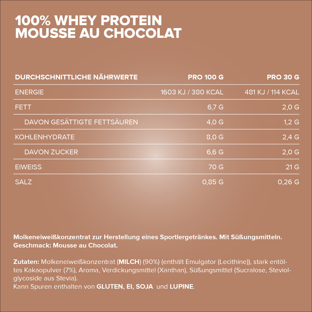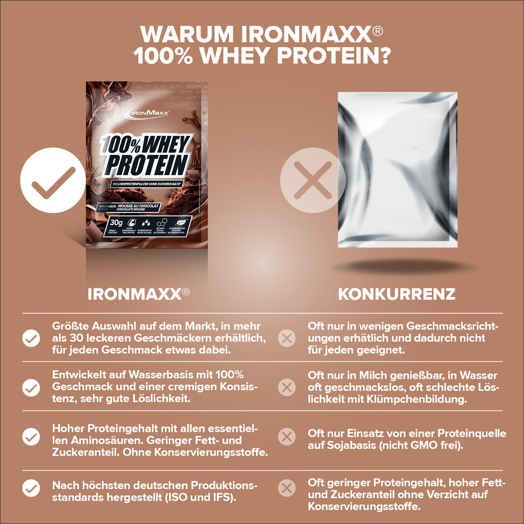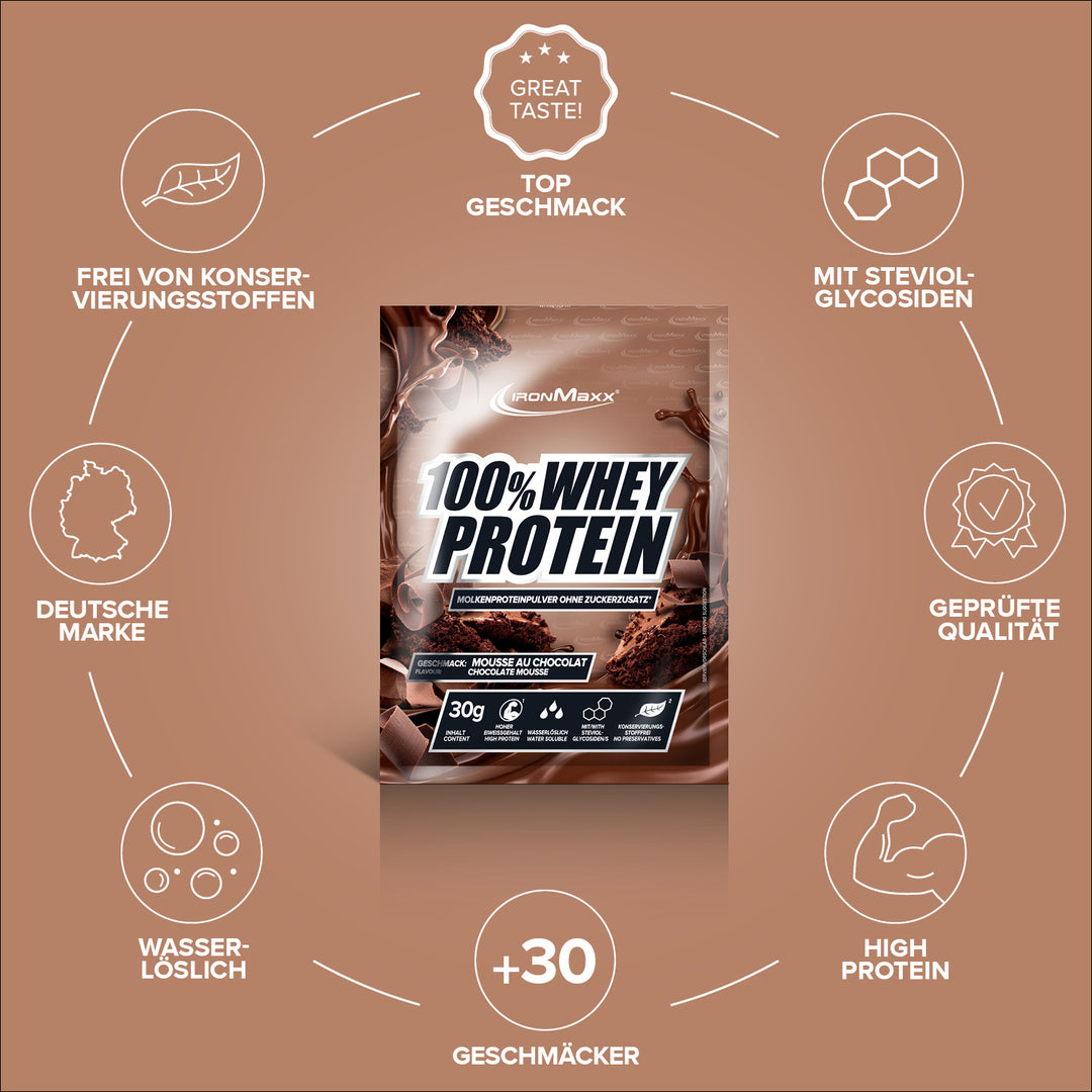 IronMaxx® 100% Whey Protein in der Sorte gehört zu den beliebtesten Eiweißshakes für Muskelaufbau, Regeneration und Diätphasen. Mit bis zu 80 % Eiweiß, einem vollständigen Aminosäuren-Profil (inklusive BCAAs und EAAs) sowie einem Mousse au Chocolat Geschmack ist es der perfekte Begleiter für deinen Fitnessalltag.