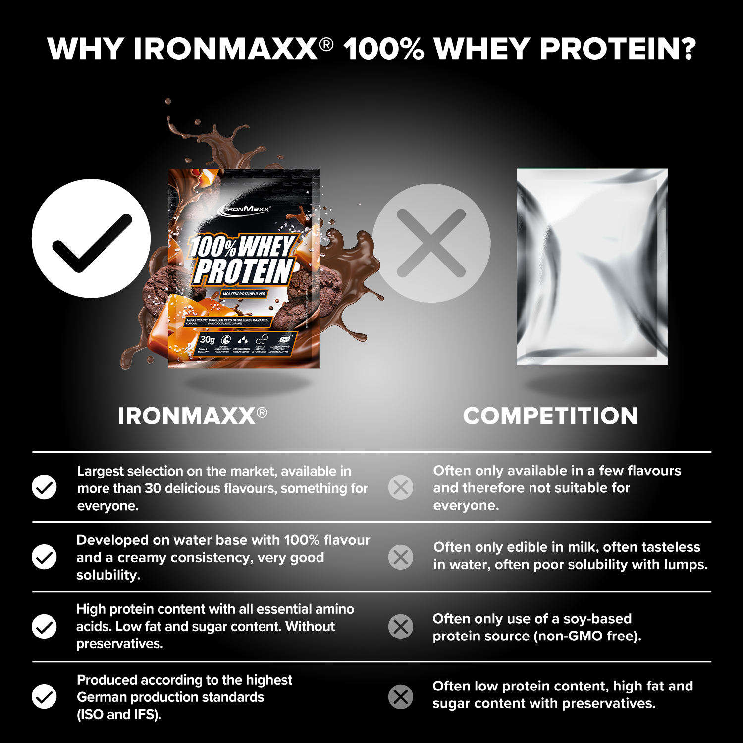 IronMaxx® 100% Whey Protein in der Sorte gehört zu den beliebtesten Eiweißshakes für Muskelaufbau, Regeneration und Diätphasen. Mit bis zu 80 % Eiweiß, einem vollständigen Aminosäuren-Profil (inklusive BCAAs und EAAs) sowie einem cremig-schokoladigen Geschmack ist es der perfekte Begleiter für deinen Fitnessalltag.