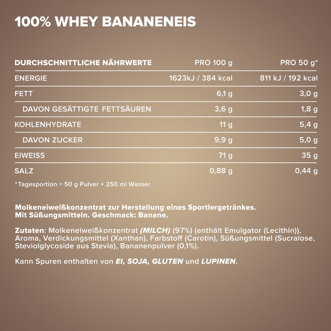 Molkeneiweißkonzentrat (MILCH) (97%) (enthält Emulgator (Lecithine)), Aroma, Verdickungsmittel (Xanthan), Farbstoff (Carotin), Süßstoffe (Sucralose, Steviolglycoside aus Stevia), Bananenpulver (0,1%).Kann Spuren von EI, SOJA, GLUTEN und LUPINEN enthalten.