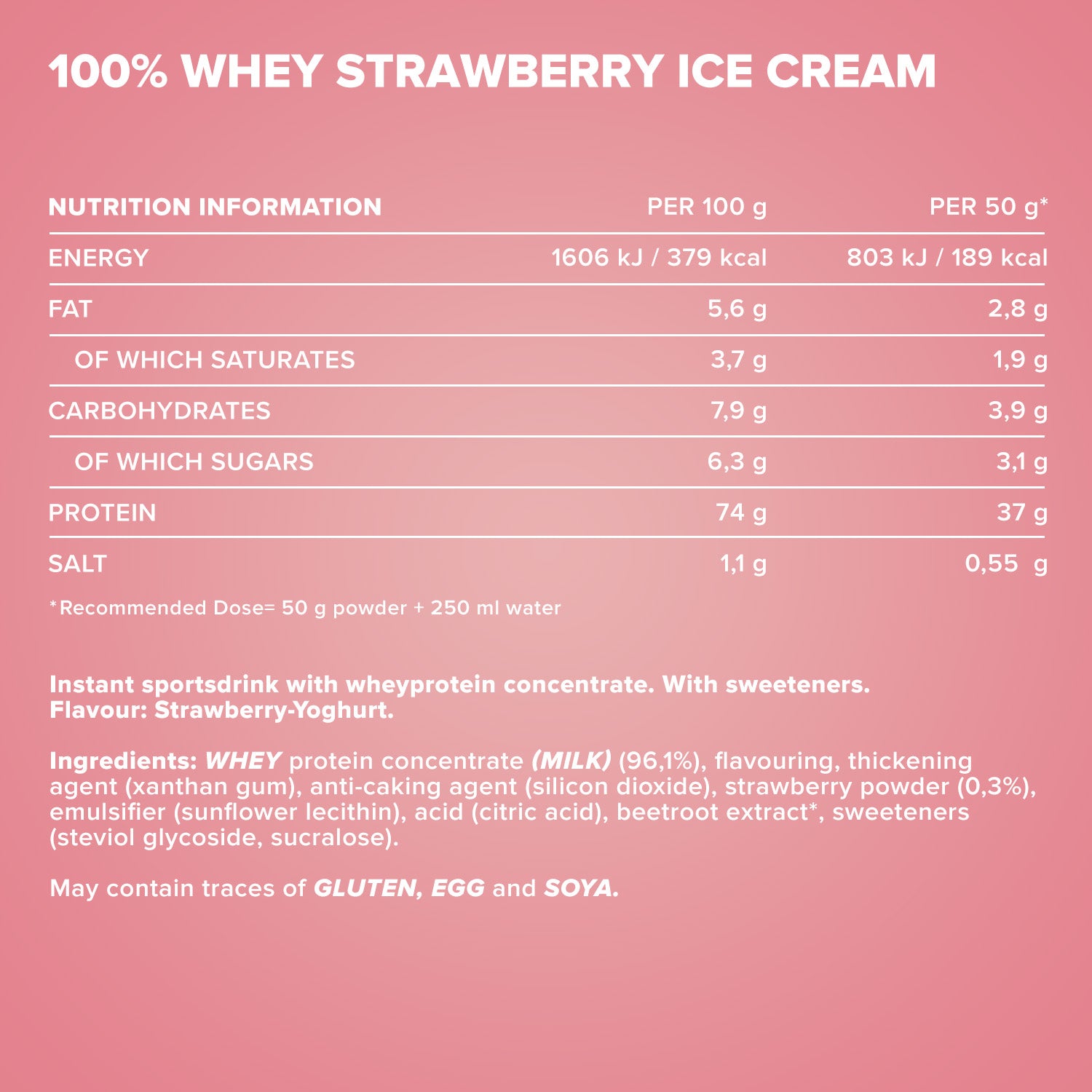MOLKENeiweiß-Konzentrat (MILCH) (96,1%), Aroma, Verdickungsmittel (Xanthan), Trennmittel (Siliciumdioxid), Erdbeerpulver (0,3%), Emulgator (Sonnenblumenlecithin), Säuerungsmittel (Citronensäure), Rote Beete Extrakt*, Süßungsmittel (Steviolglykoside, Sucralose). Kann Spuren enthalten von GLUTEN, El und SOJA.
