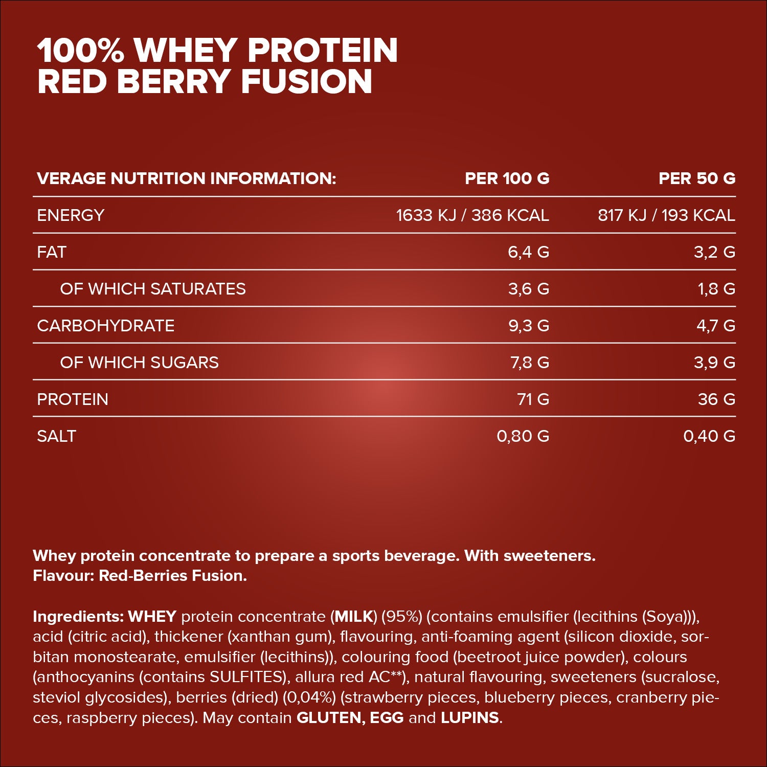 Verkehrsbezeichnung: Molkeneiweißkonzentrat zur Herstellung eines Sportlergetränkes. Mit Süßungsmitteln.Geschmack: Rote Beeren