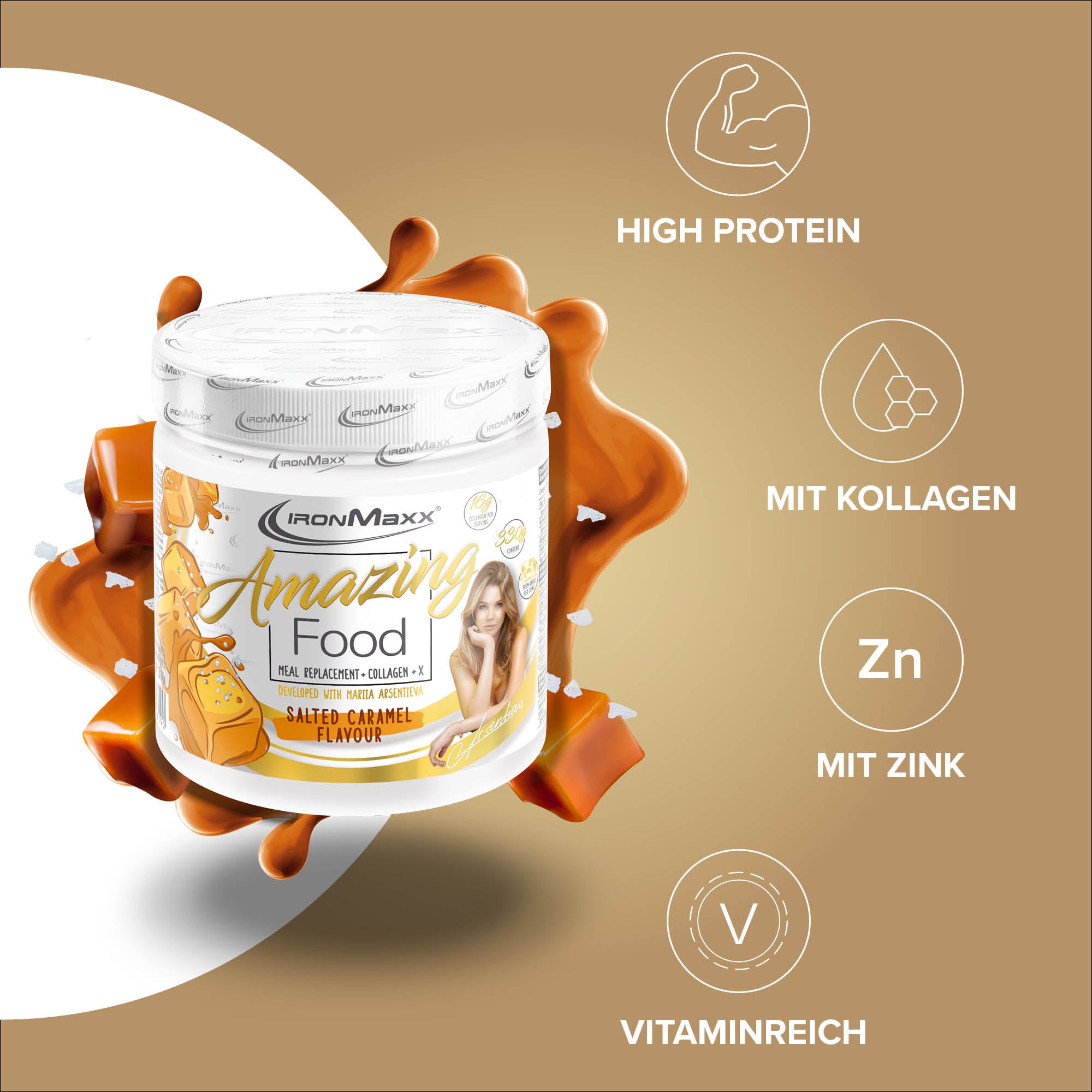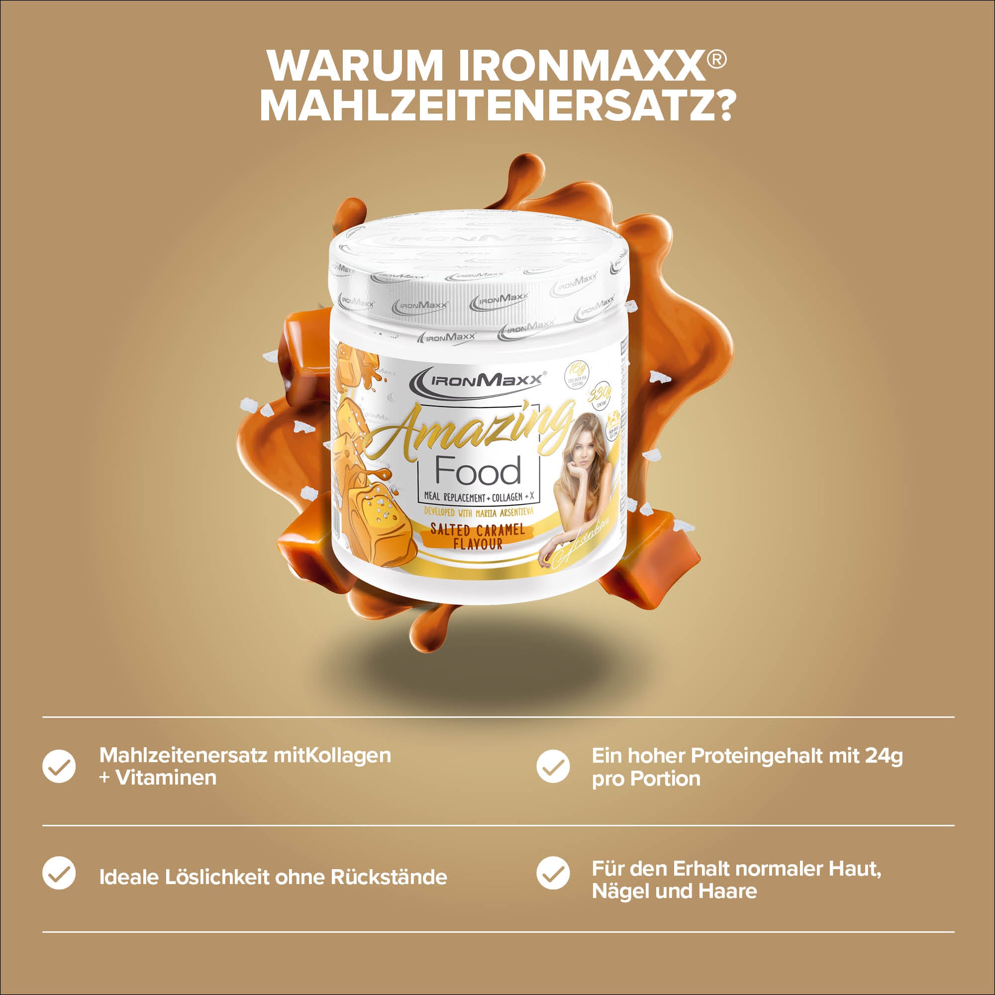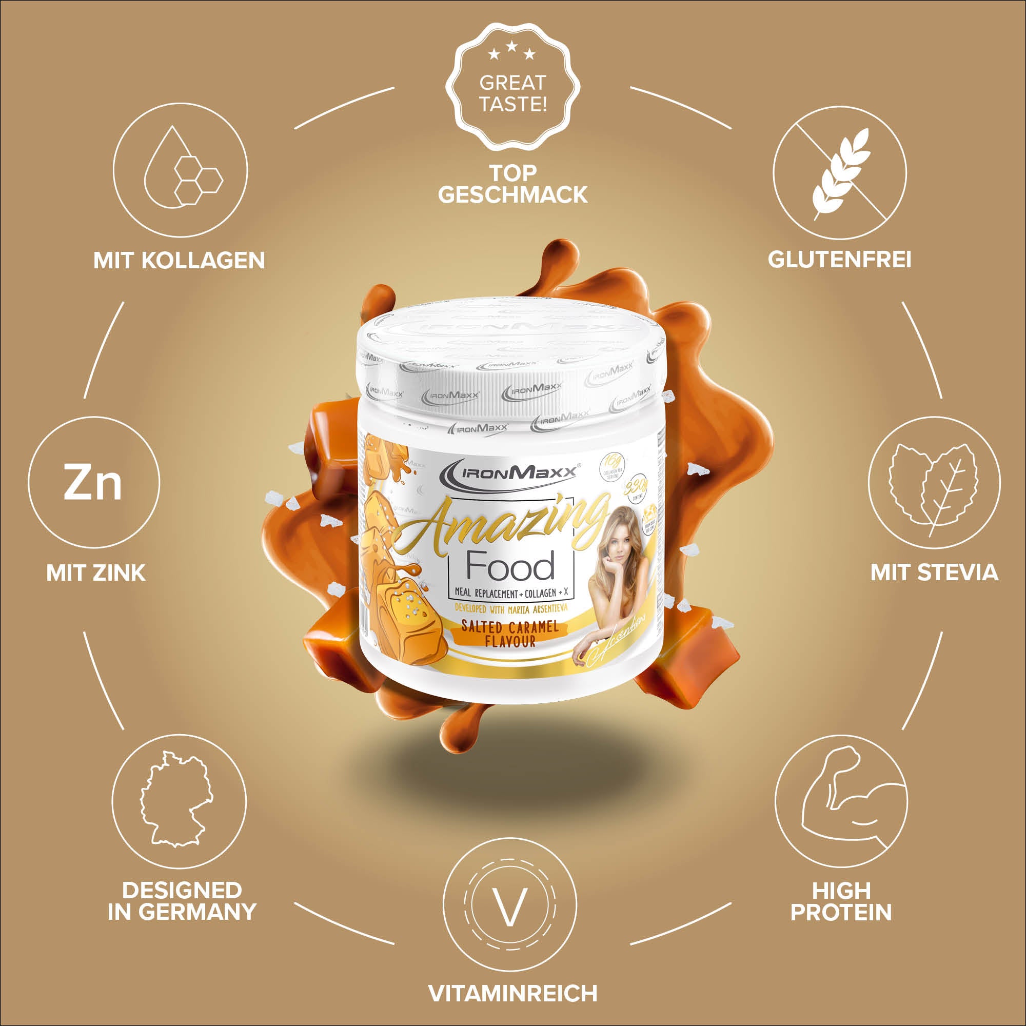 Amazing Food von IronMaxx® ist der ideale Mahlzeitenersatz für alle, die Wert auf bewusste Ernährung, innere Schönheit und hochwertige Nährstoffe legen. Mit 25 g Protein, Kollagen aus Weidehaltung sowie 24 Vitaminen und Mineralstoffen pro Portion unterstützt es deinen Körper optimal – ganz ohne Gluten und mit nur 208 kcal.