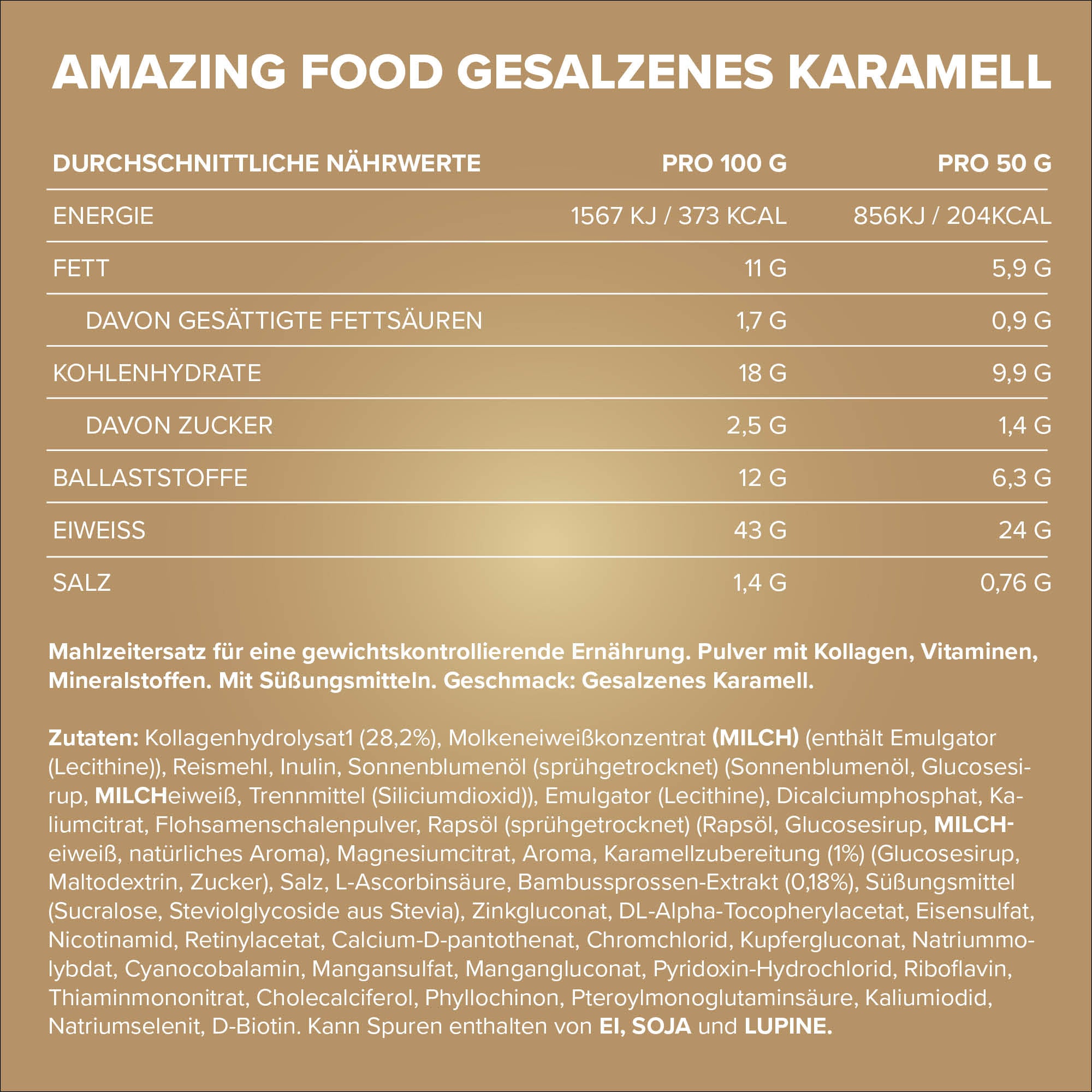Kollagenhydrolysat (28.2%). Molkeneiweißkonzentrat (MILCH) (enthält Emulgator (Lecithine), Reismehl, Inulin, Sonnenblumenöl (sprüh-getrocknet] (Sonnenblumenöl, Glucosesirup, MILCHeiweils, Trennmittel (Siliciumdioxid), (Lecithine), Dicalciumphosphat, Kaliumcitrat, Flohsa-menschalenpulver, Rapsöl (sprühgetrocknet) (Rapsöl, Glucosesirup, MILCHeiweiß, natürliches Aroma), Magnesiumcitrat, Aroma, Karamellzubereitung, (1%0) (Glucosesirup, Maltodextrin, Zucker), Salz, L-As-corbinsäure, Bambussprossen-Extrakt (0,18%), S?-Bungsmittel (Sucralose, Steviolglycoside aus Stevia), Zinkgluconat, DL-Alpha-Tocopherylacetat, Eisensulfat, Nicotinamid, Retinylacetat, " Calcium-D-pantothenat, Chromchlorid, Kupfergluconat, Natriummolybdat, Cyanocobalamin, Mangansultat, Mangangluconat, Py-ridoxin-Hydrochlorid, Riboflavin, Thiaminmononitrat, Cholec citerol, Phyllochinon, Pteroy/monoglutamin-säure, Kaliumiodid, Natriumselenit, D-Biotin.