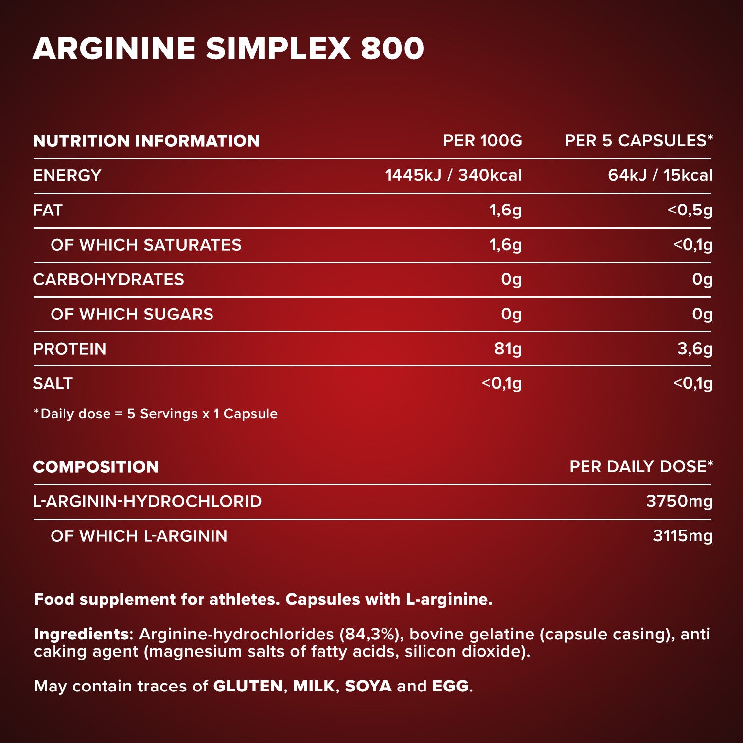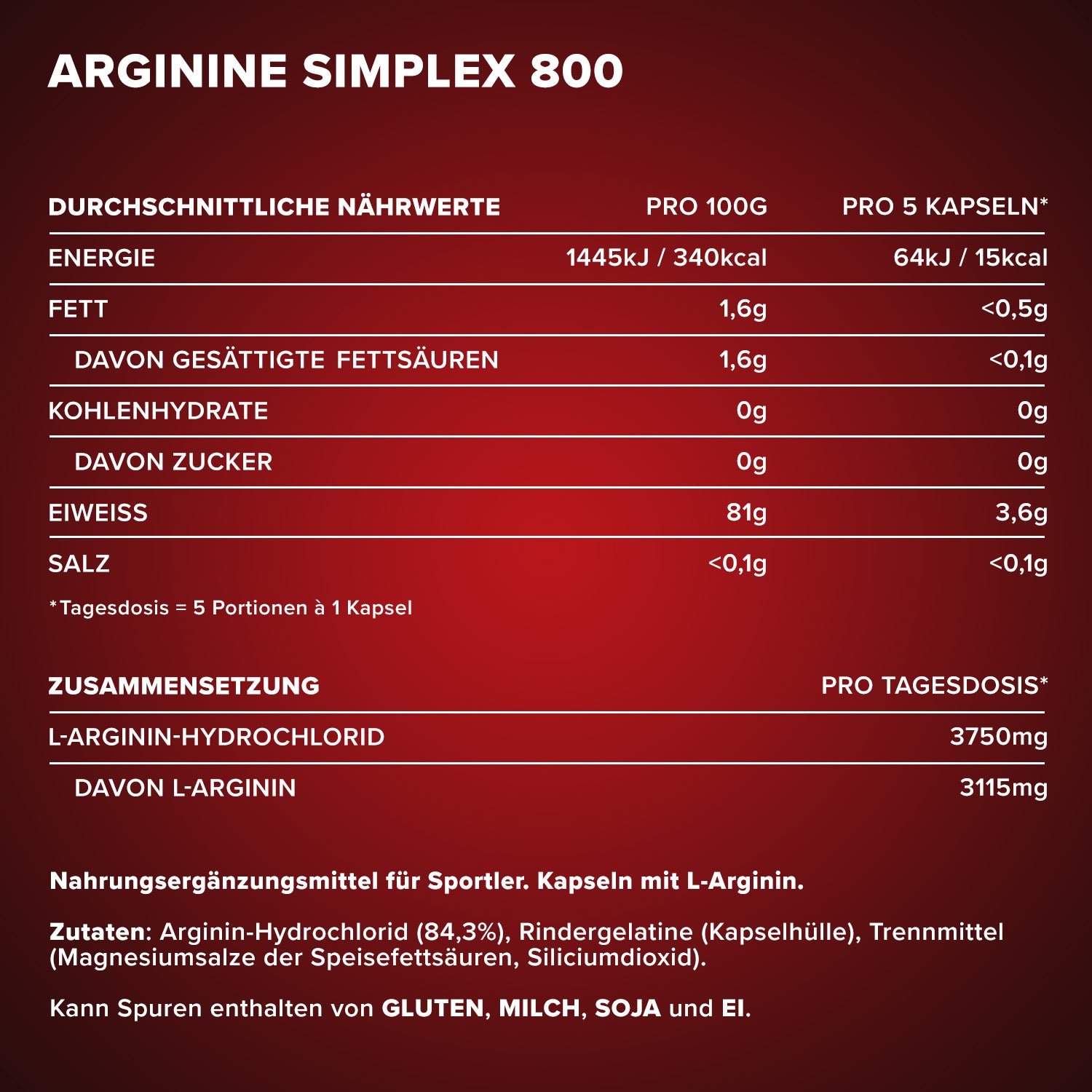 - Durch eine empfohlene Verzehrempfehlung von 5 Kapseln täglich, nimmst du 3750mg der Aminosäure L-Arginin HCL zu dir und damit 3115mg reines L-Arginin!