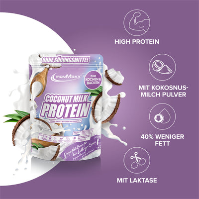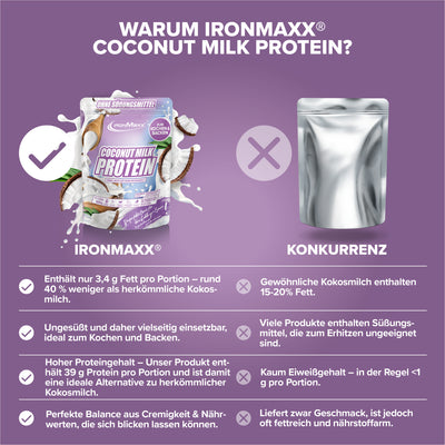 Das IronMaxx® Kokosmilch Protein vereint cremigen Geschmack mit geballter Proteinpower – perfekt für deine Fitnessküche und eine bewusste Ernährung. Mit 76 % Eiweiß, 40 % weniger Fett und ohne Zuckerzusatz* ist es die smarte Alternative zu klassischer Sahne. Einfach mit Milch anrühren, in warme Gerichte geben und genießen!