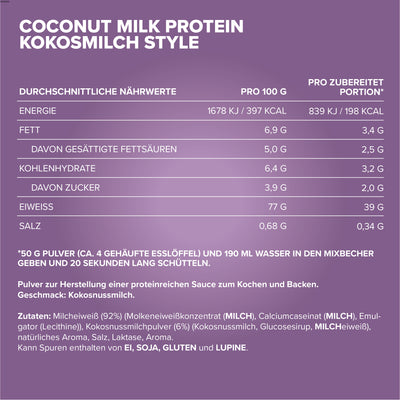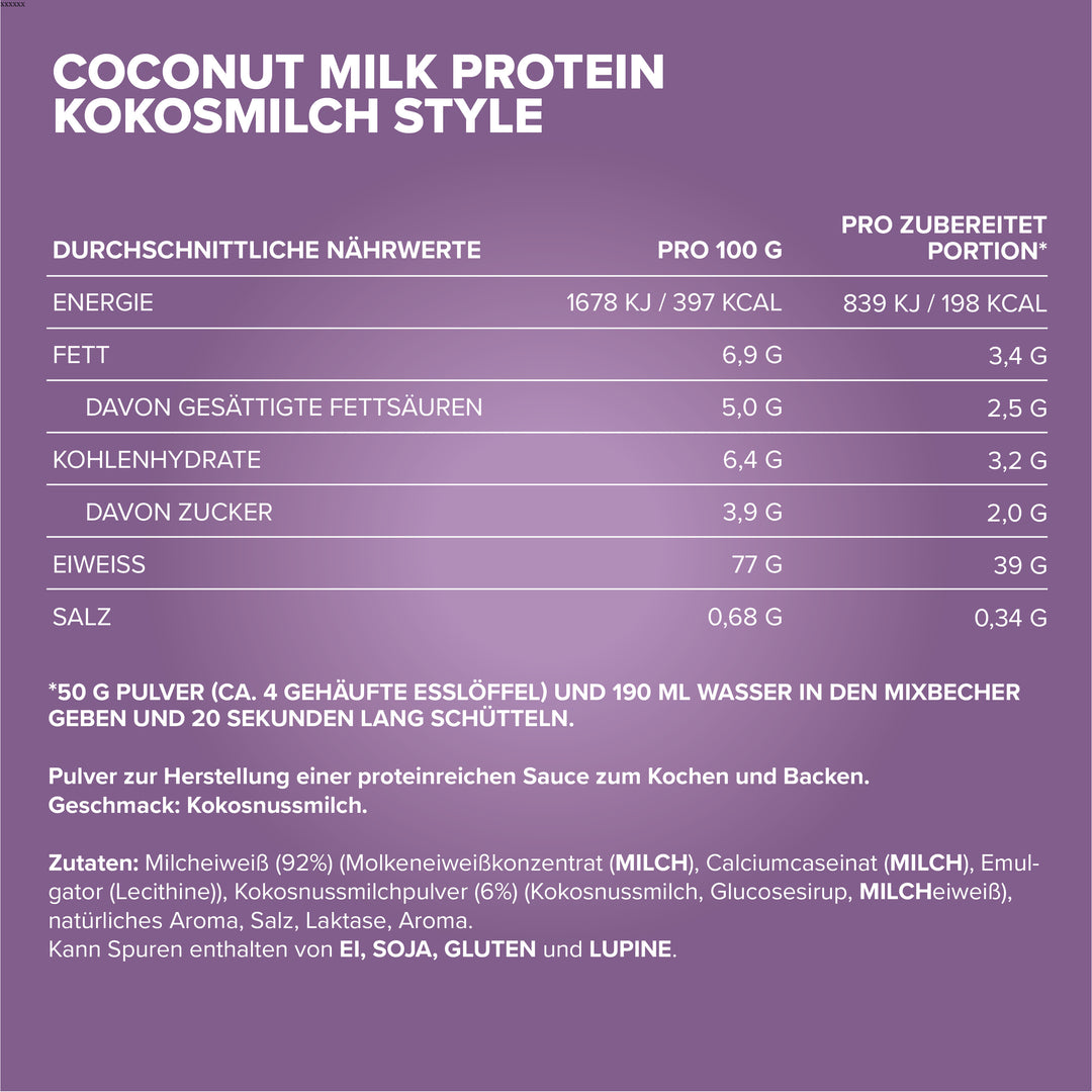 Milcheiweiß (92%) (Molkeneiweißkonzentrat (MILCH), Calciumcaseinat (MILCH)), Emulgator (Lecithine), Kokosnussmilchpulver (6%) (Kokosnussmilch, Glucosesirup, MILCHeiweiß), natürliches Aroma, Salz, Laktase, Aroma.