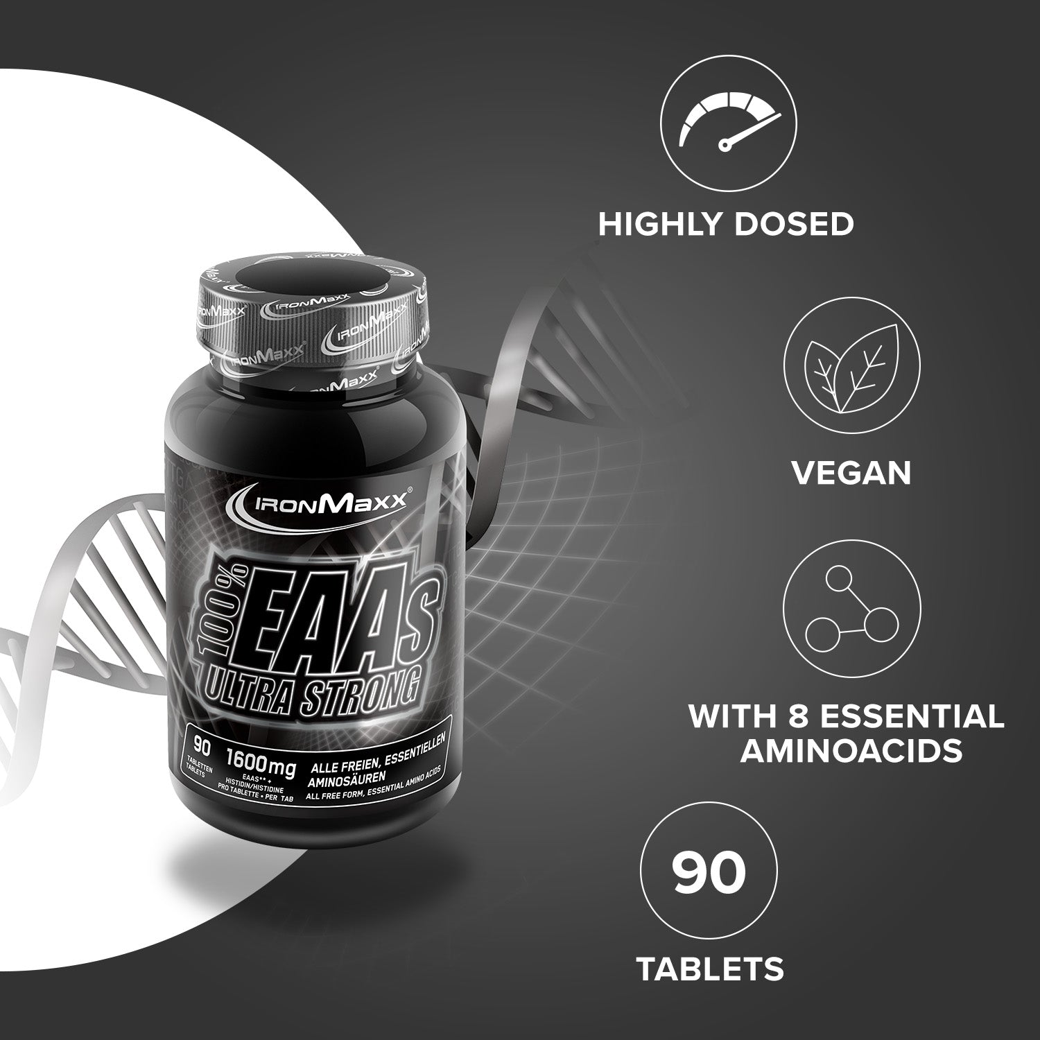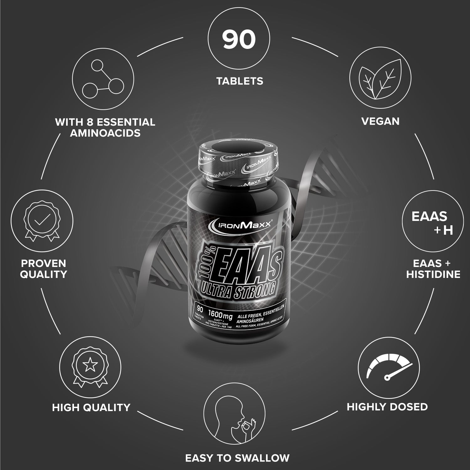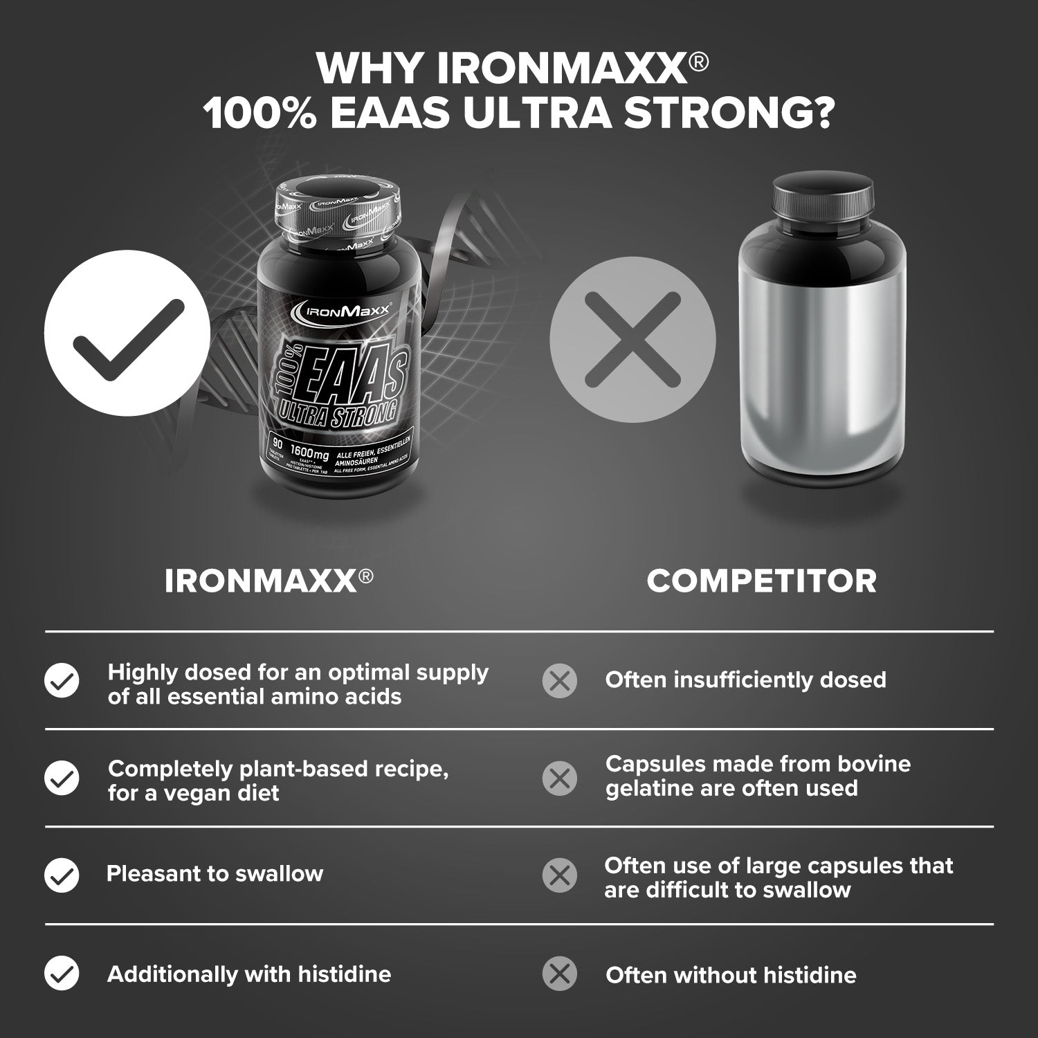 - IronMaxx® 100% EAAs Ultra Strong beinhalten alle 8 essentiellen Aminosäuren und zusätzlich die semi-essentielle Aminosäure Histidin!