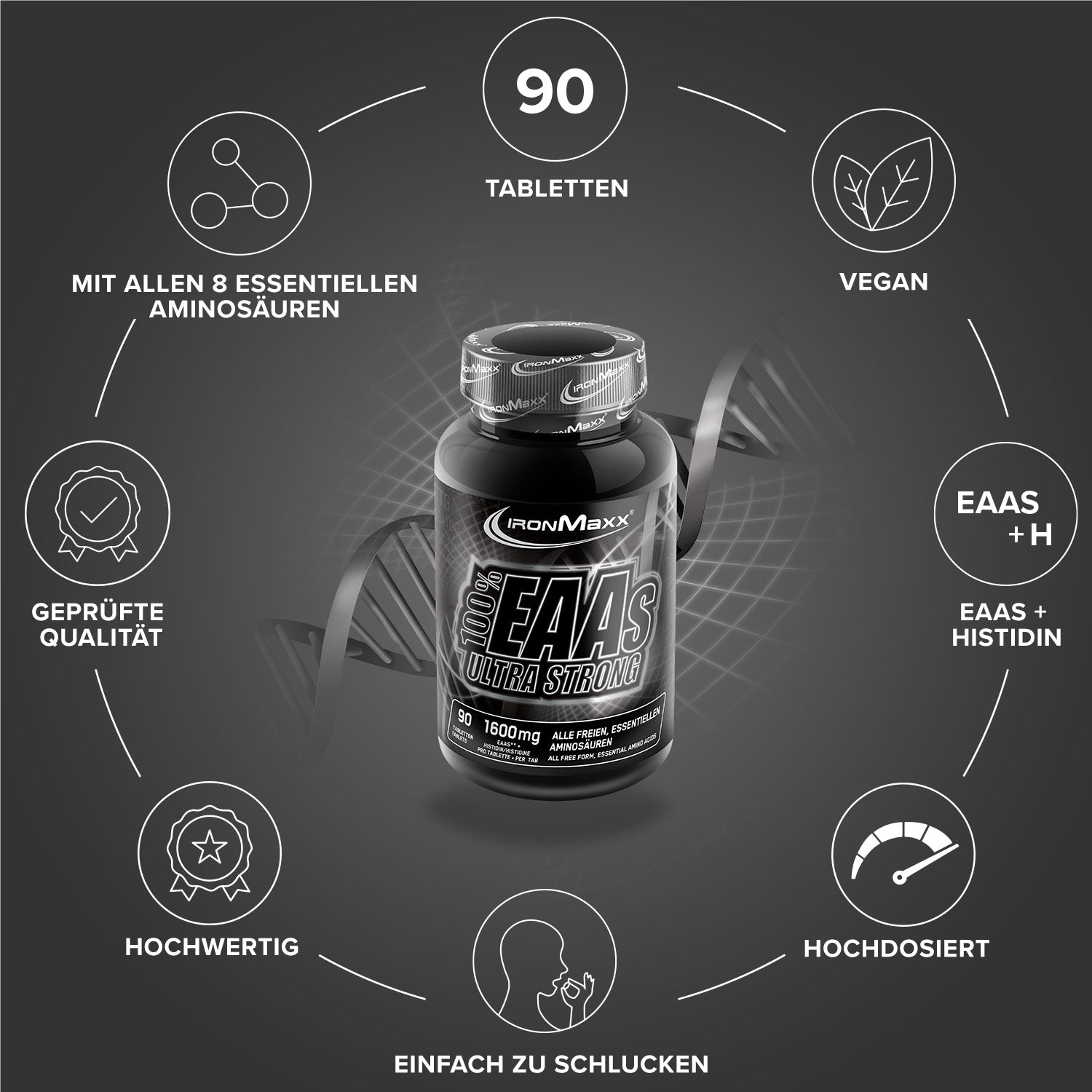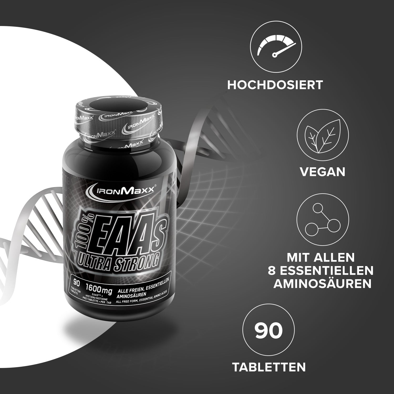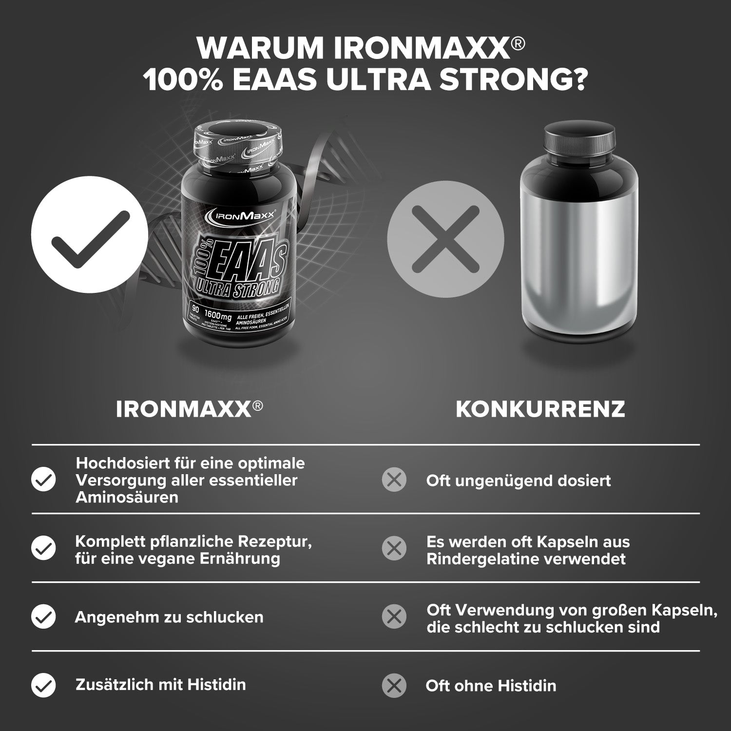 - IronMaxx® 100% EAAs Ultra Strong beinhalten alle 8 essentiellen Aminosäuren und zusätzlich die semi-essentielle Aminosäure Histidin!