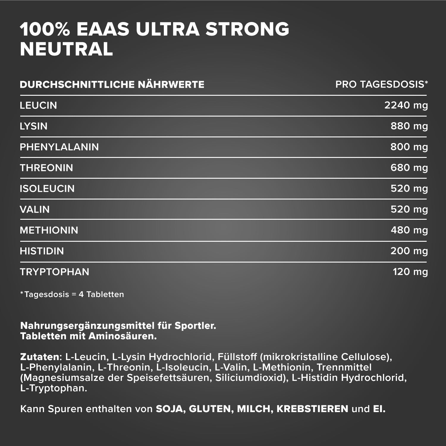 - Insgesamt nimmst du pro Tablette starke 1600mg EAAs + Histidin auf!