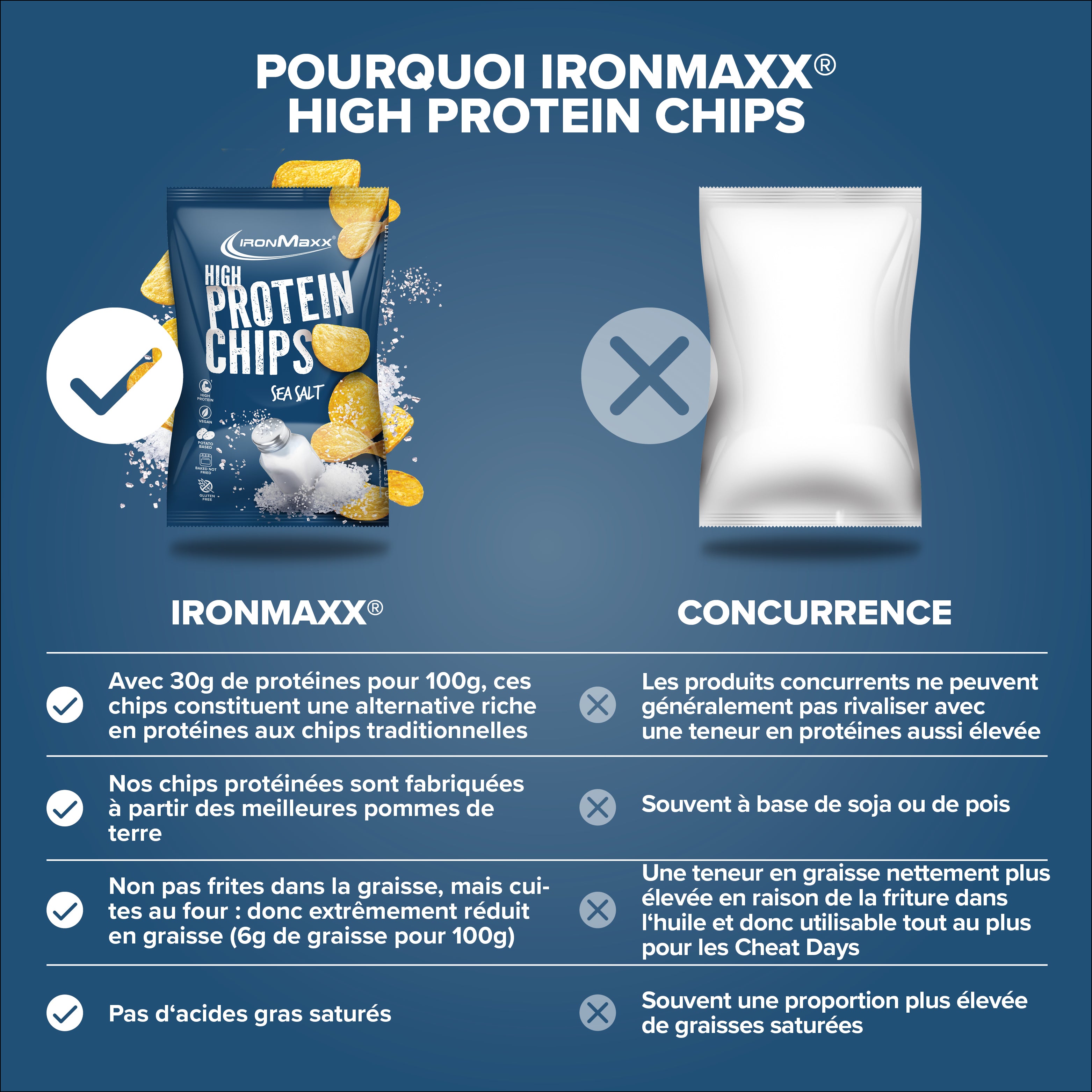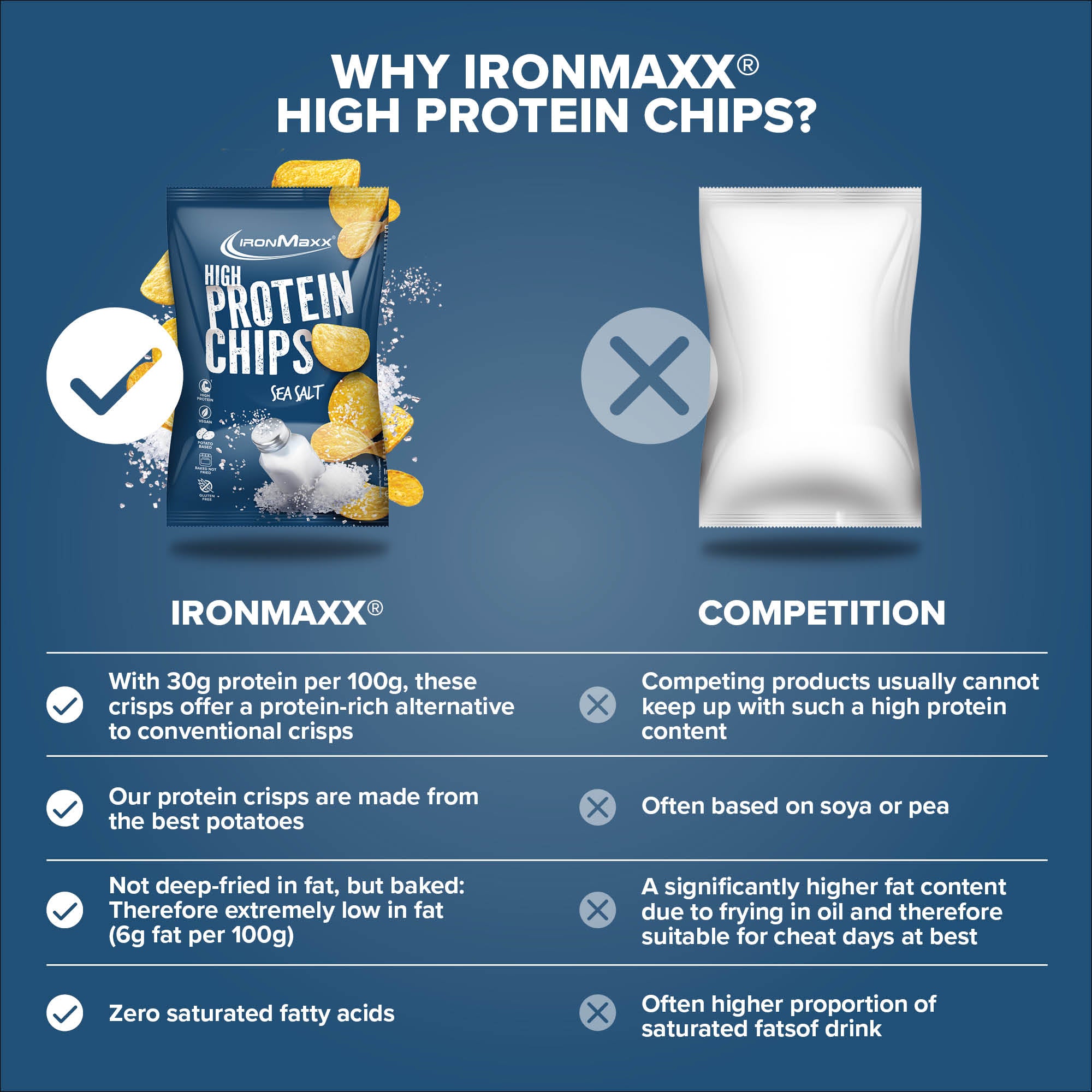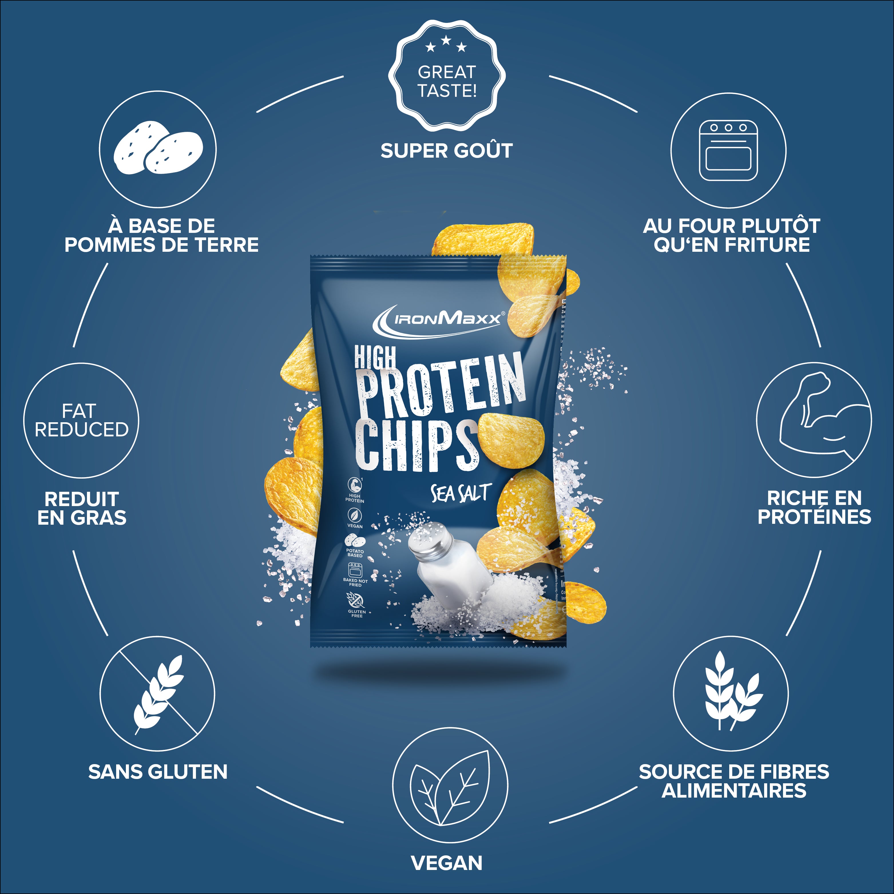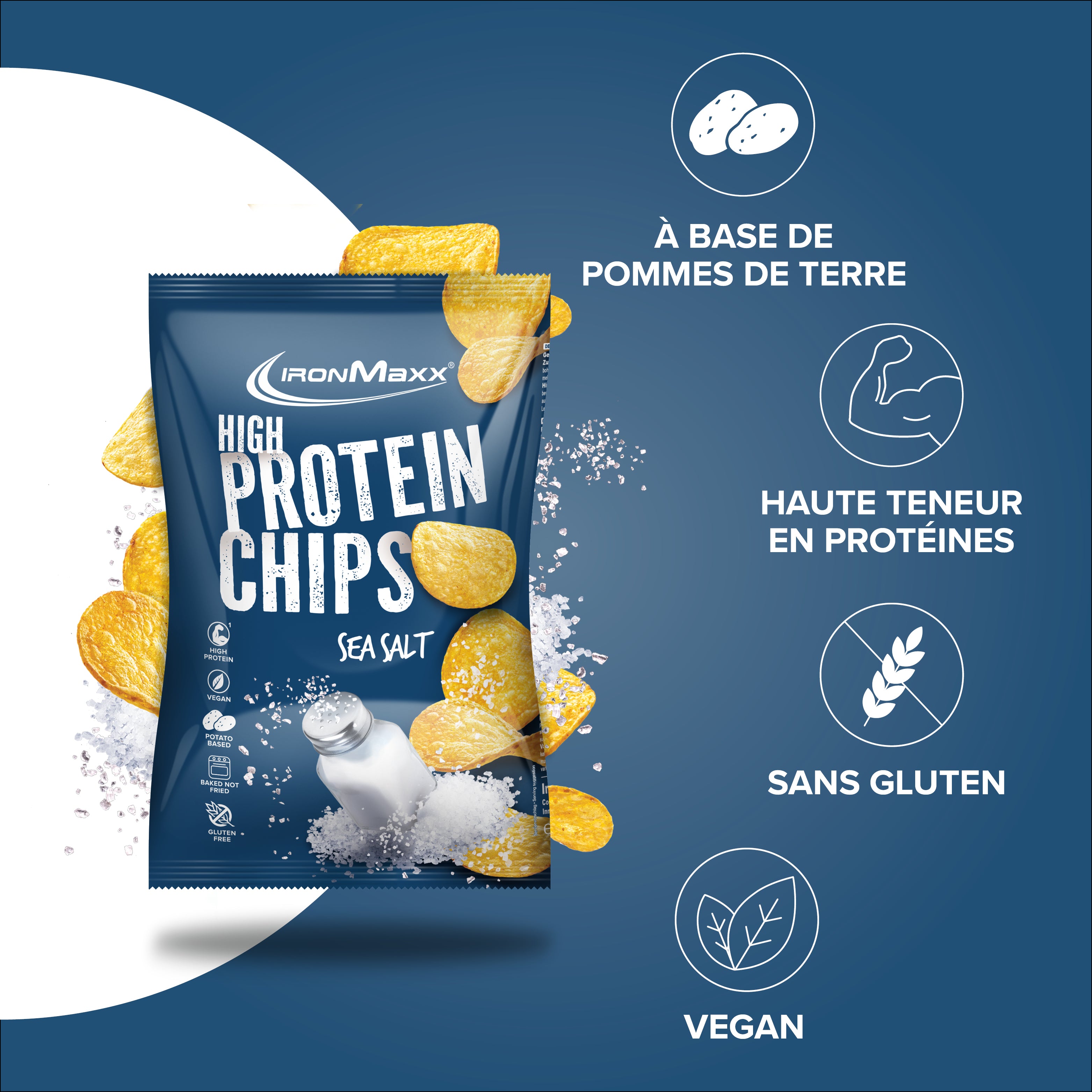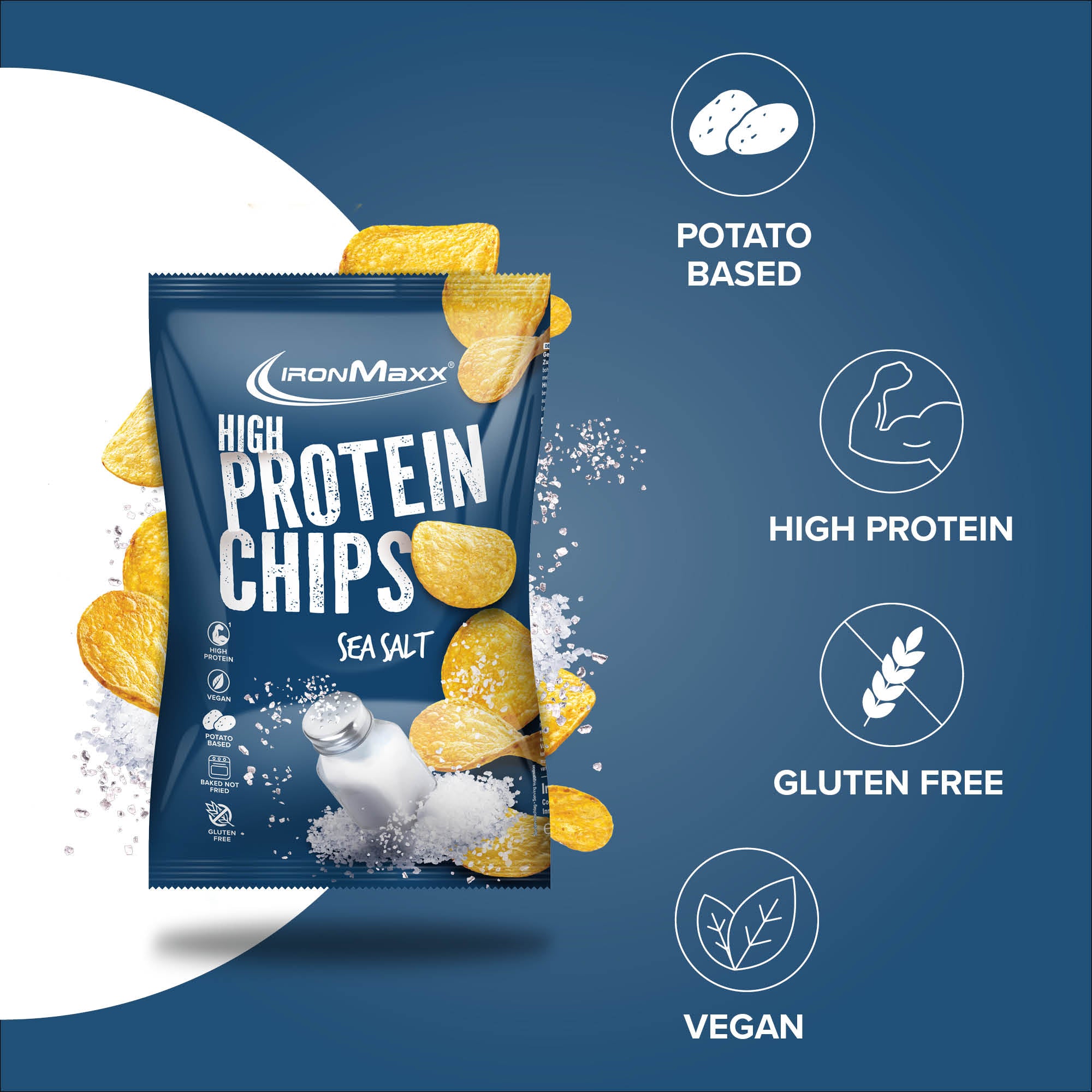Die IronMaxx® High Protein Potato Chips sind der perfekte Fitness-Snack für alle, die vollen Geschmack genießen und gleichzeitig ihre Fitnessziele erreichen möchten. Mit satten 30 g Protein pro 100 g unterstützen sie effektiv den Muskelaufbau – ganz ohne schlechtes Gewissen.