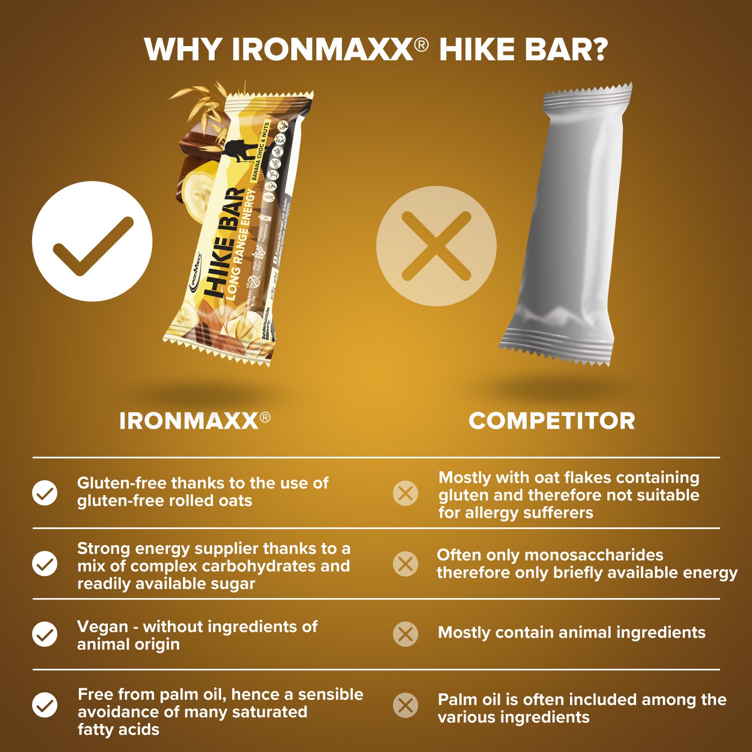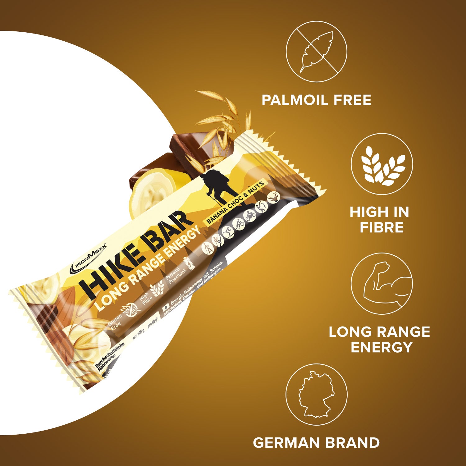Ob Wandern, Trailrunning oder Klettern – der Hike Bar von IronMaxx® im Banana Choc & Nuts Geschmacksrichtung ist dein idealer Begleiter für lange Tage in der Natur. Die leckeren Sorten liefern dir schnelle und langanhaltende Energie. Vegan, glutenfrei und ballaststoffreich – dieser Riegel passt perfekt zu einem bewussten Lebensstil. Mit einer optimalen Kombination aus Kohlenhydraten, Proteinen und Fetten unterstützt der Hike Bar deine Ausdauer und bringt dich kraftvoll ans Ziel.