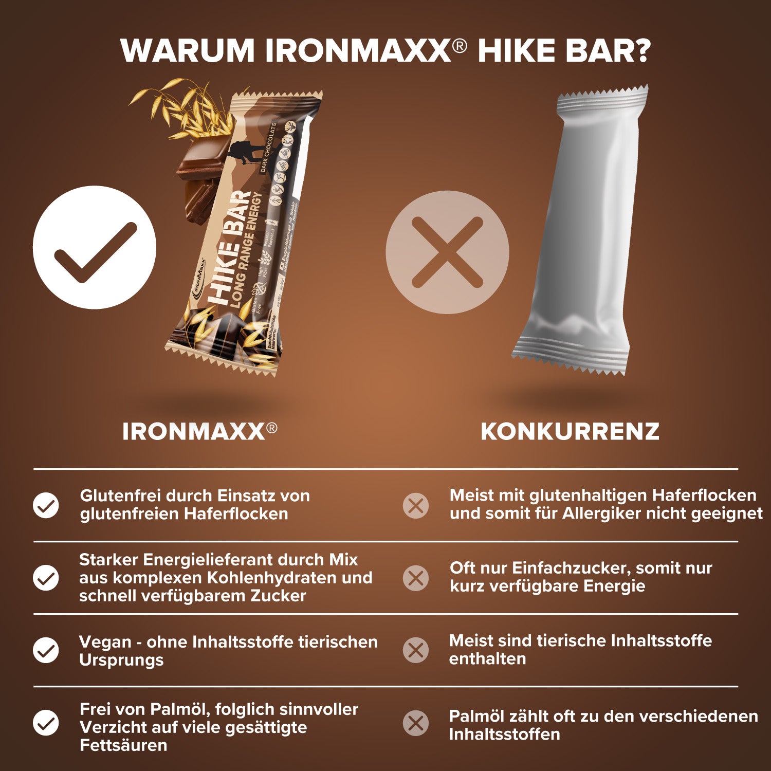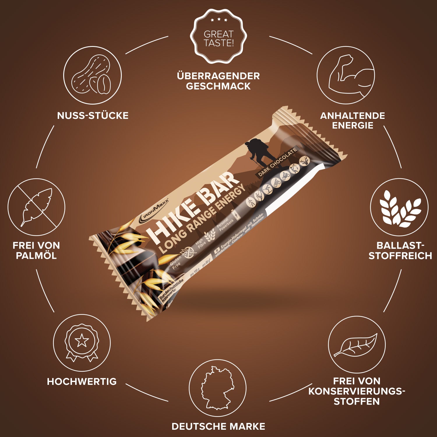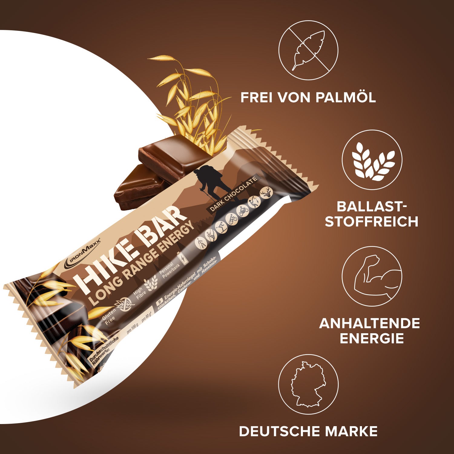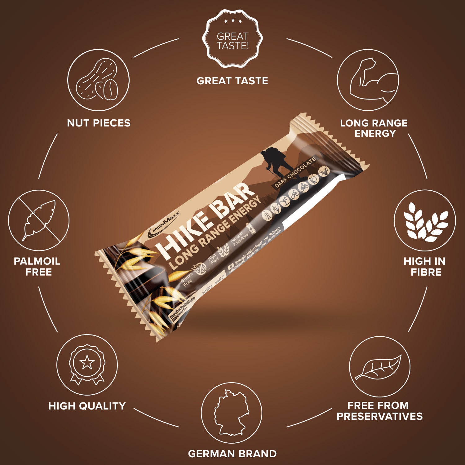 Ob Wandern, Trailrunning oder Klettern – der Hike Bar von IronMaxx® im Dark Chocolate Geschmacksrichtung ist dein idealer Begleiter für lange Tage in der Natur. Die leckeren Sorten liefern dir schnelle und langanhaltende Energie. Vegan, glutenfrei und ballaststoffreich – dieser Riegel passt perfekt zu einem bewussten Lebensstil. Mit einer optimalen Kombination aus Kohlenhydraten, Proteinen und Fetten unterstützt der Hike Bar deine Ausdauer und bringt dich kraftvoll ans Ziel.