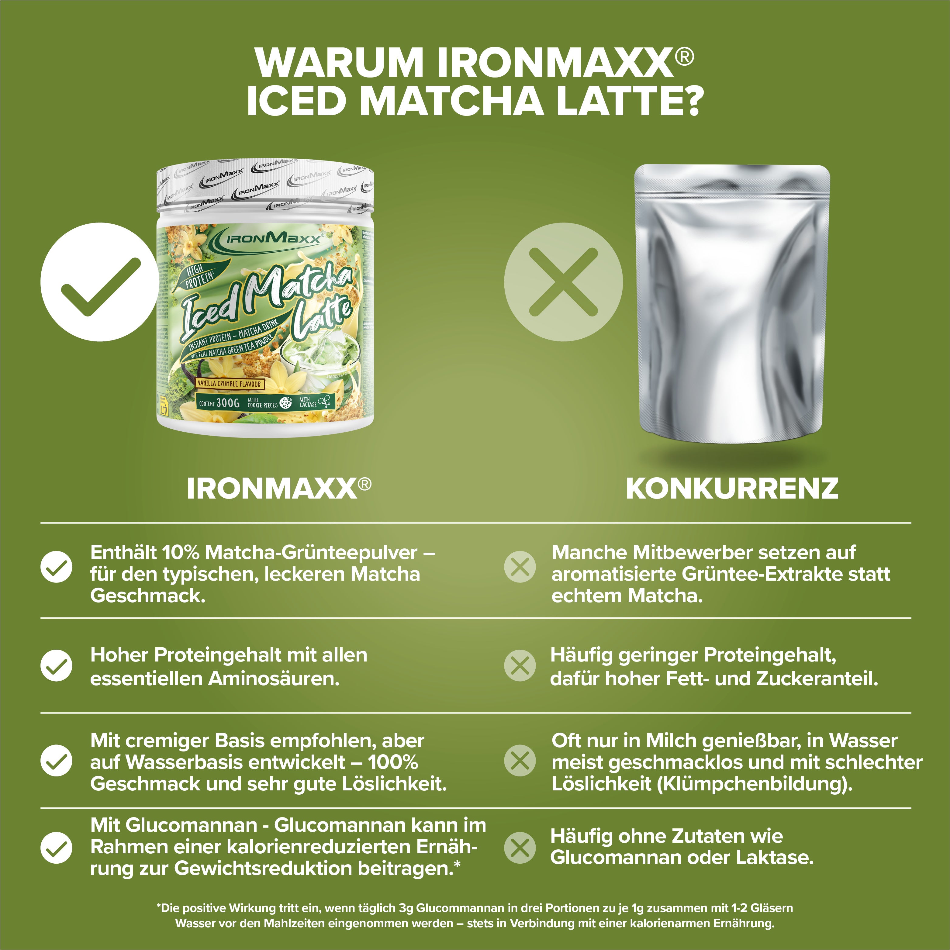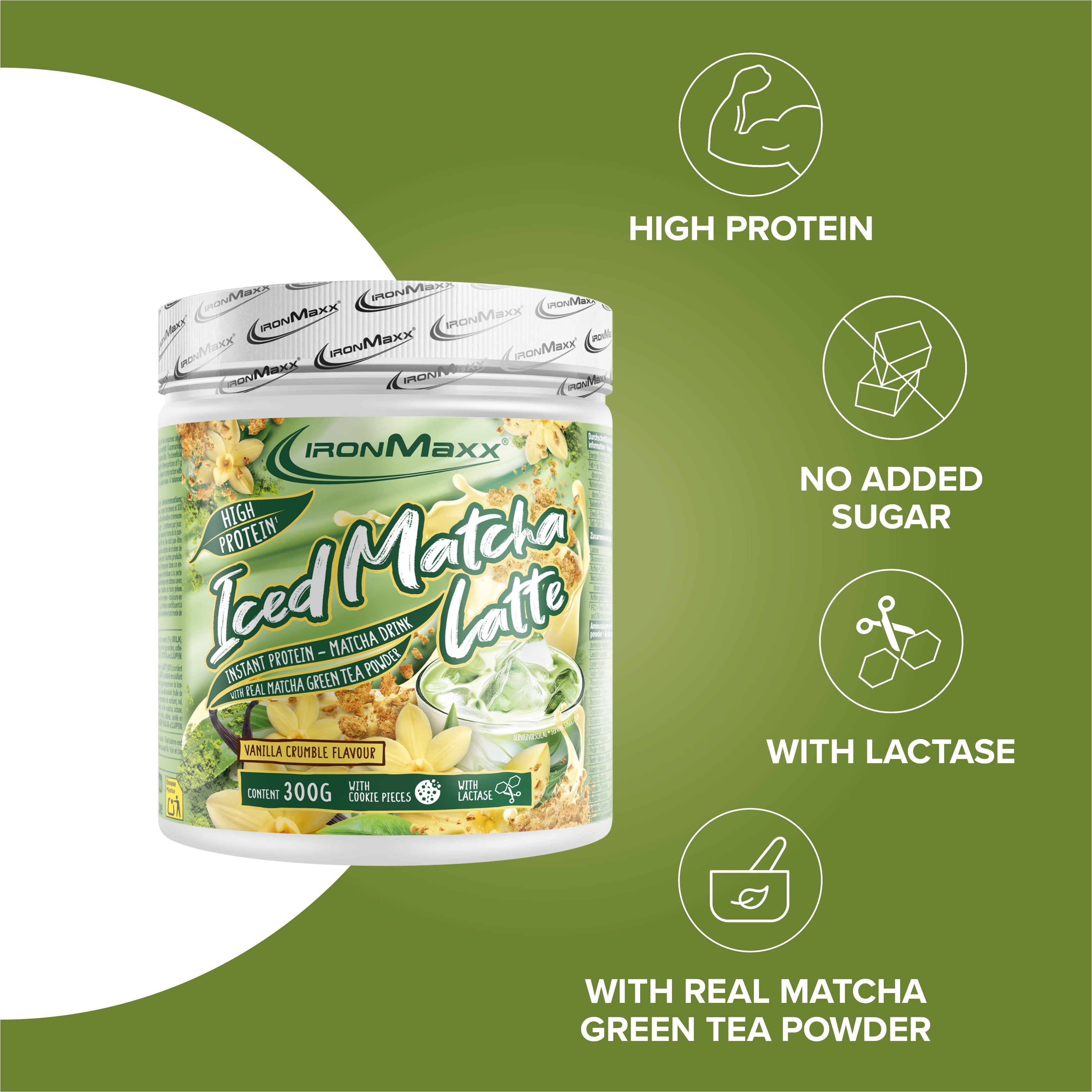 Der High Protein Iced Matcha Latte von IronMaxx® vereint hochwertiges Molkenprotein mit echtem Matcha-Grüntee zu einem erfrischend-cremigen Drink. Einfach mit kaltem Mandeldrink mischen und genießen!