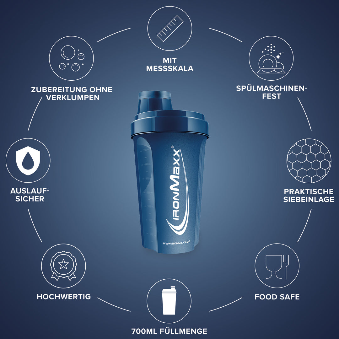 Der klassische IronMaxx® Protein Shaker ist dein verlässlicher Begleiter für cremige, klumpenfreie Shakes – überall und jederzeit. Mit einem Fassungsvermögen von 700 ml, integriertem Sieb und präziser Messskala gelingt dir jedes Mischverhältnis perfekt.