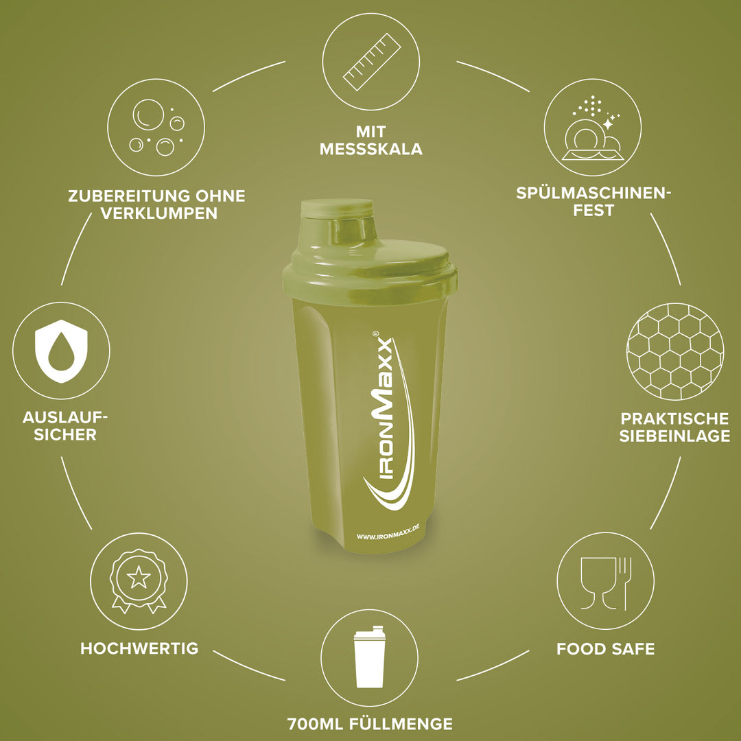 Der klassische IronMaxx® Protein Shaker ist dein verlässlicher Begleiter für cremige, klumpenfreie Shakes – überall und jederzeit. Mit einem Fassungsvermögen von 700 ml, integriertem Sieb und präziser Messskala gelingt dir jedes Mischverhältnis perfekt.