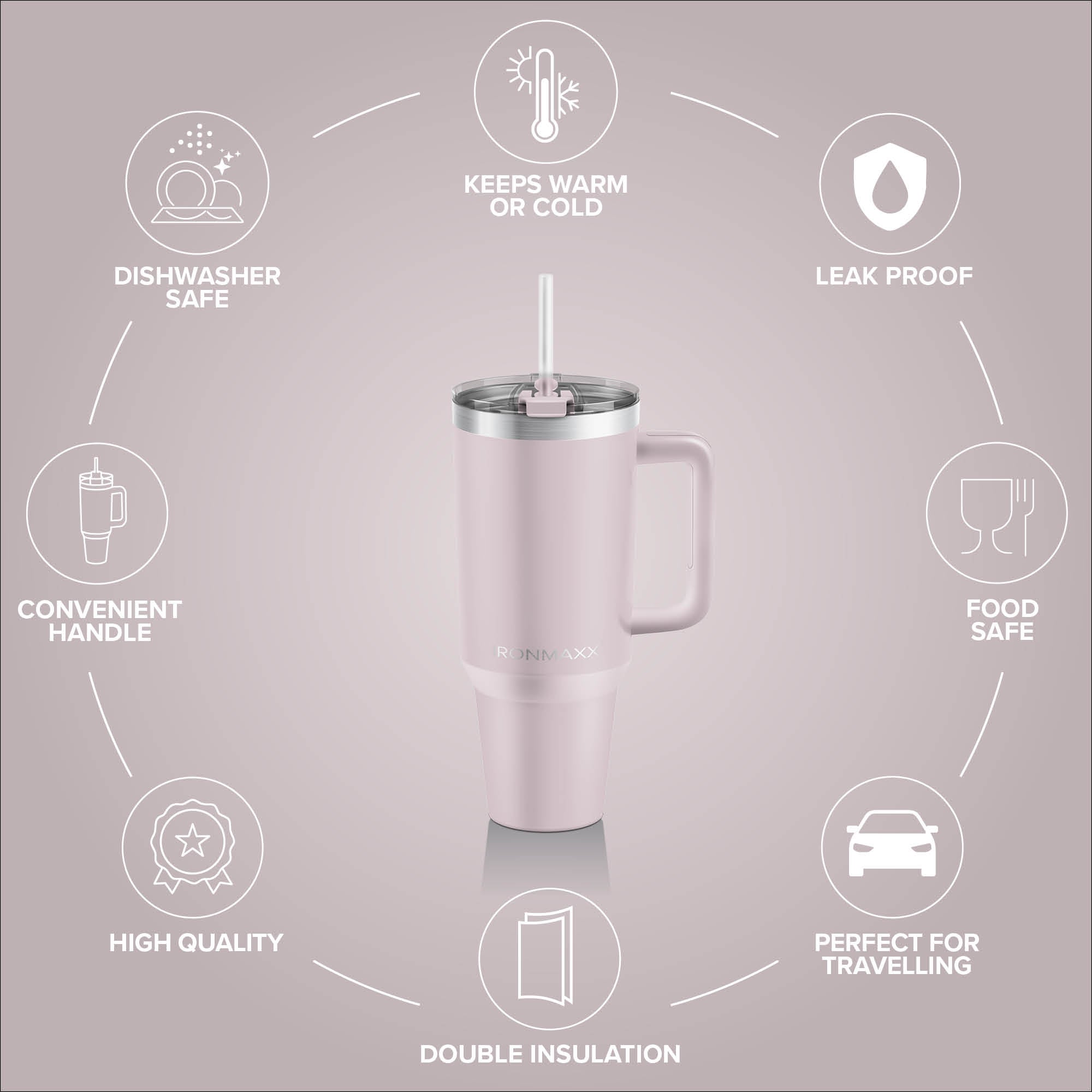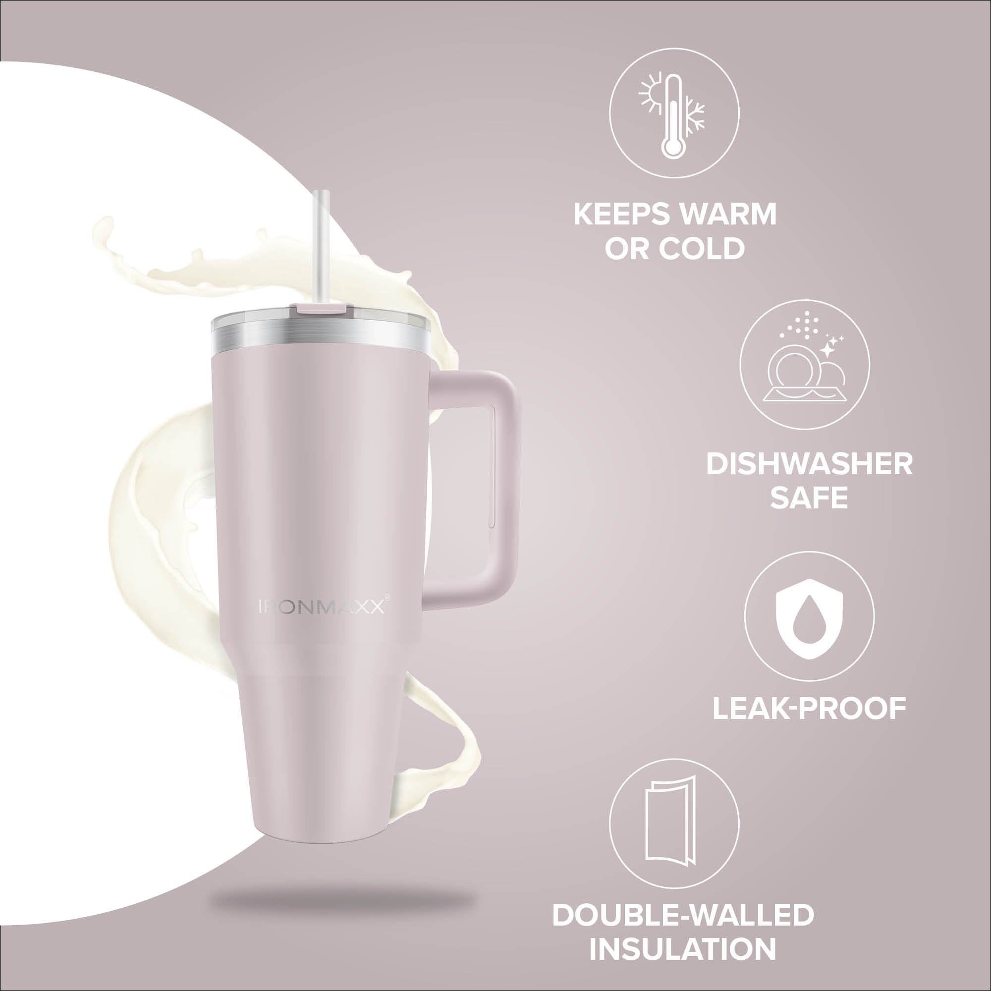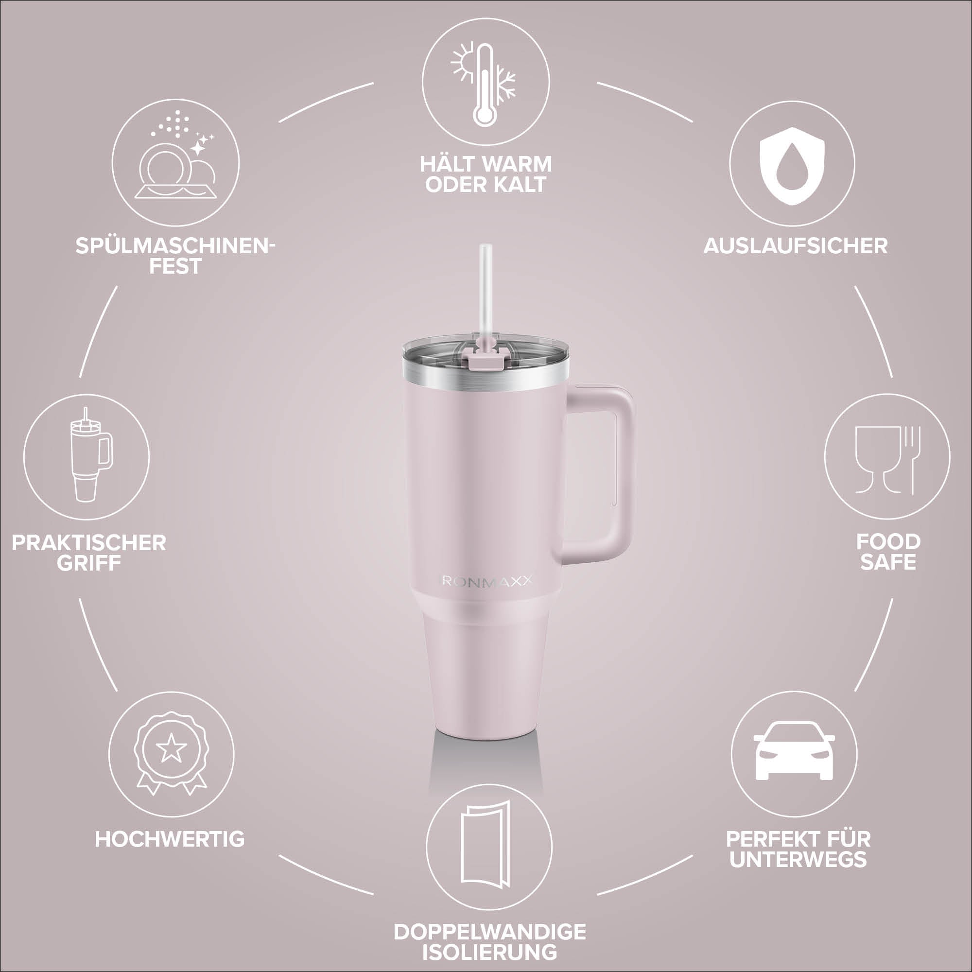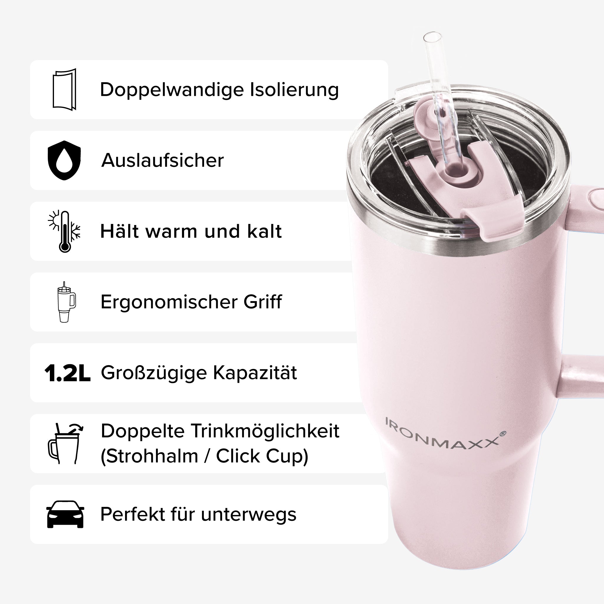 Dank doppelwandiger Isolierung bleiben deine Getränke warm oder kalt. Der auslaufsichere Deckel mit integriertem Strohhalm und der ergonomische Griff sorgen für maximalen Komfort und Sicherheit.