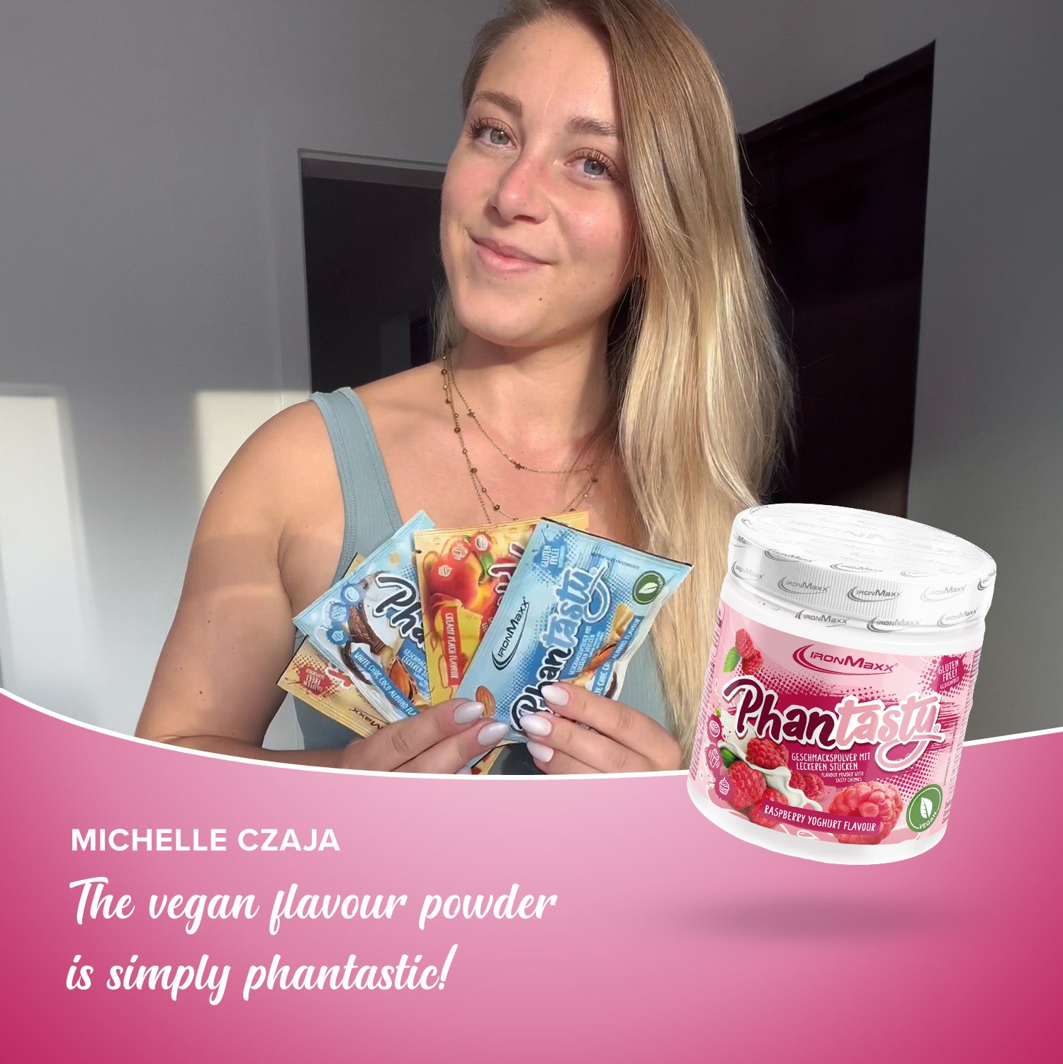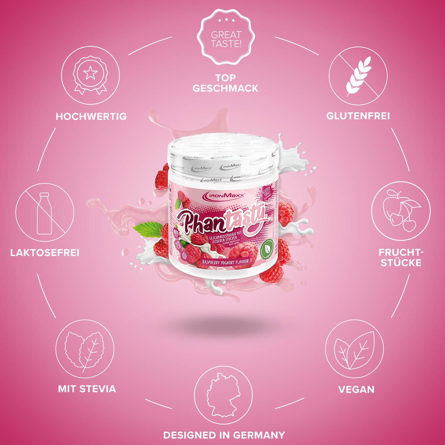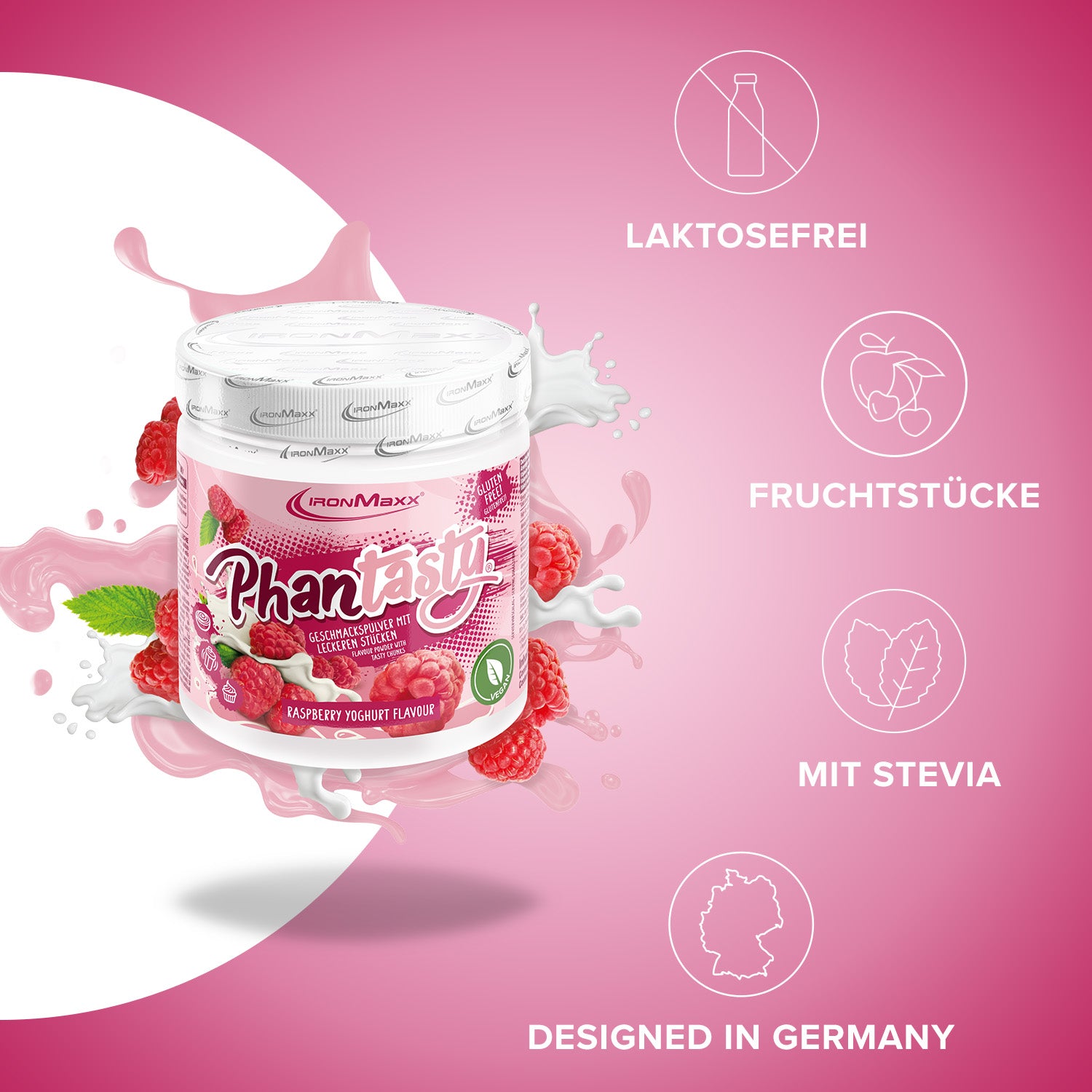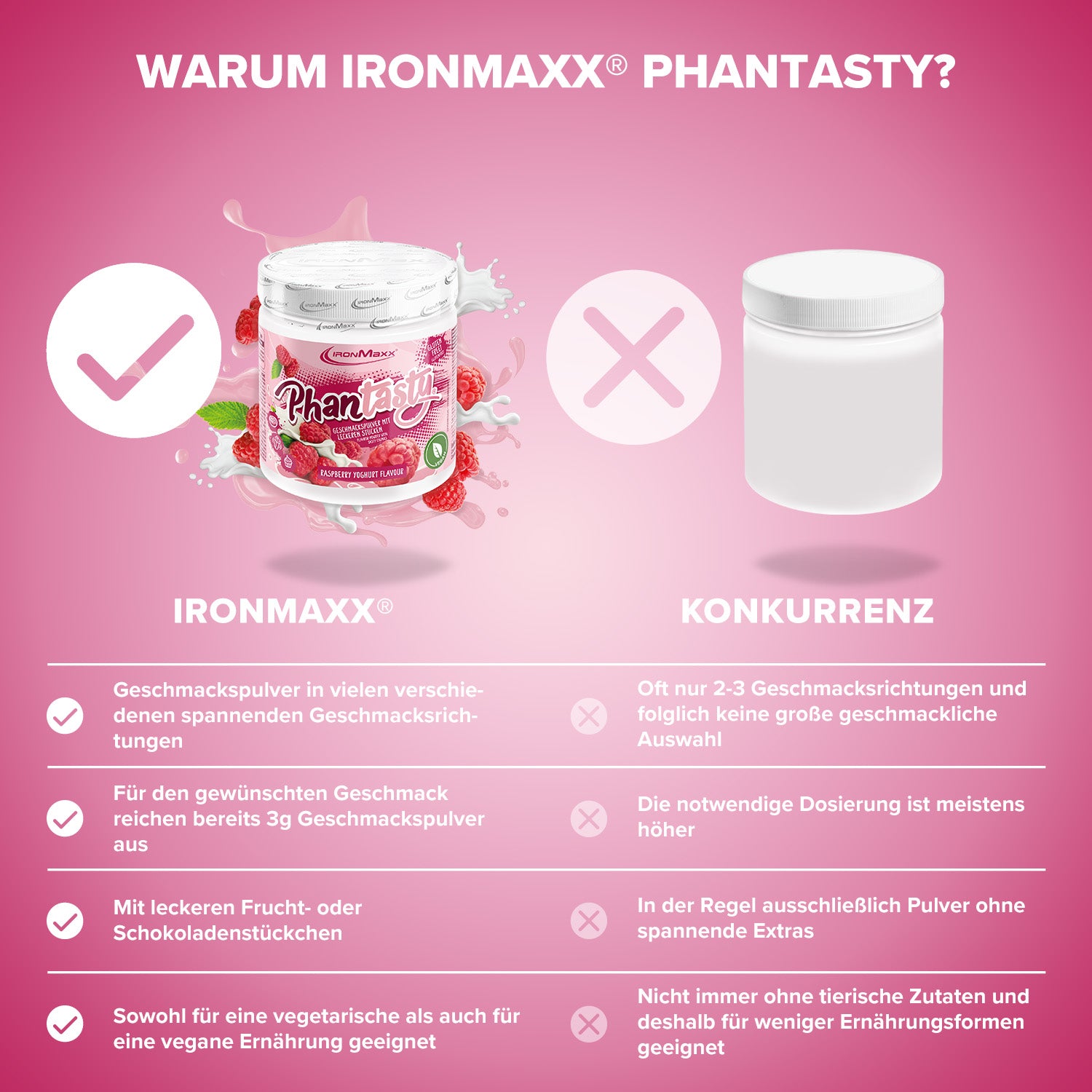 IronMaxx® Phantasty® Geschmackspulver – das vielseitige Flavour Pulver für Quark, Joghurt, Porridge, Proteinshakes oder Müsli. Intensiver Geschmack mit echten Fruchtstückchen oder Schokoladenstückchen – bei nur 11 kcal pro Portion und komplett zuckerfrei.