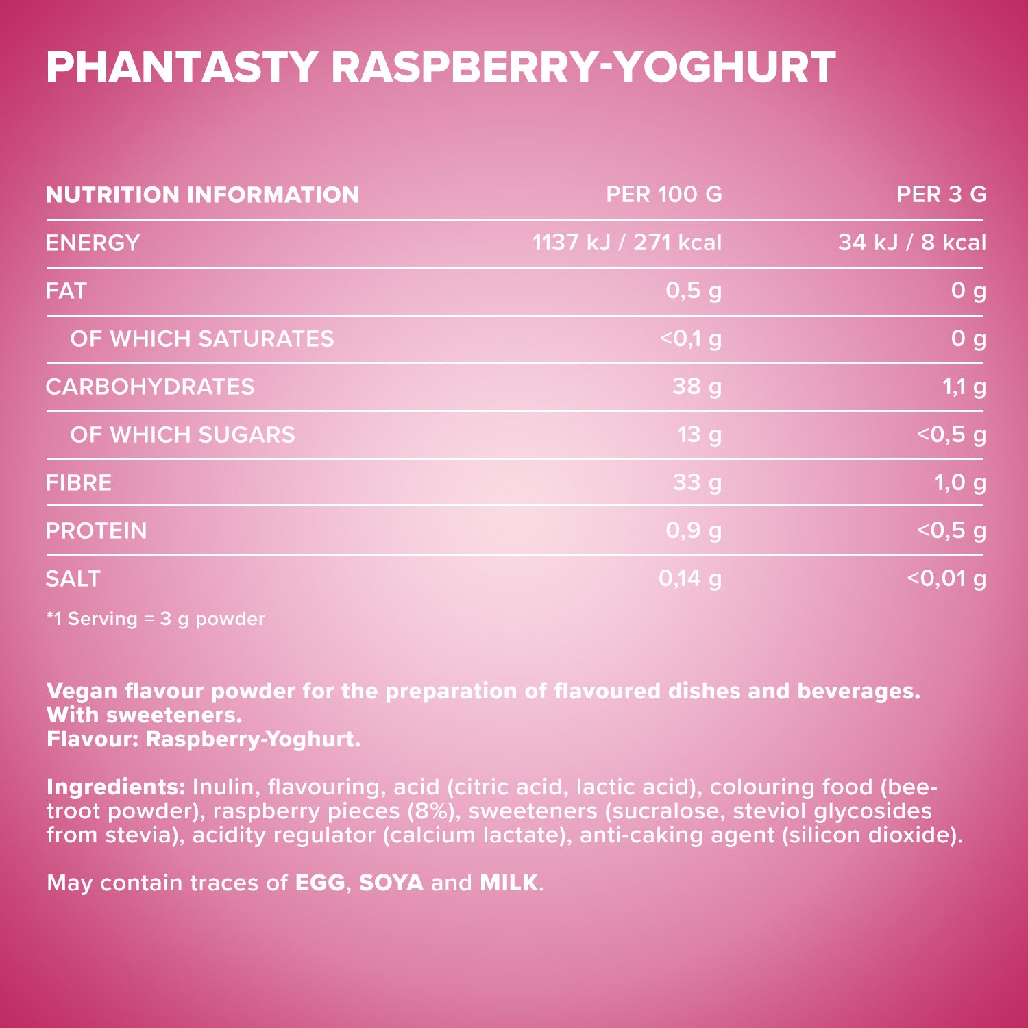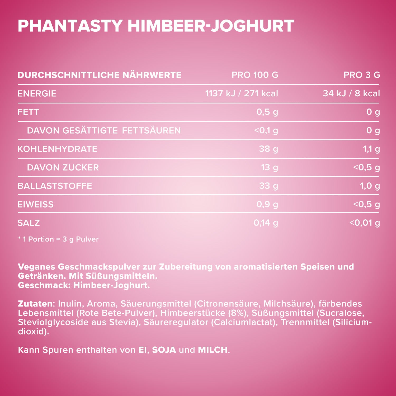Hinweis: Nicht als Ersatz für eine ausgewogene und abwechslungsreiche Ernährung sowie gesunde Lebensweise verwendbar. Dieses Produkt kann trotz sorgfältiger Kontrollen Schalenteile enthalten. Die Nährwerte beziehen sich nur auf das Phantasty Aromapulver. Hinzugefügte Lebensmittel können die Nährwerte verändern.