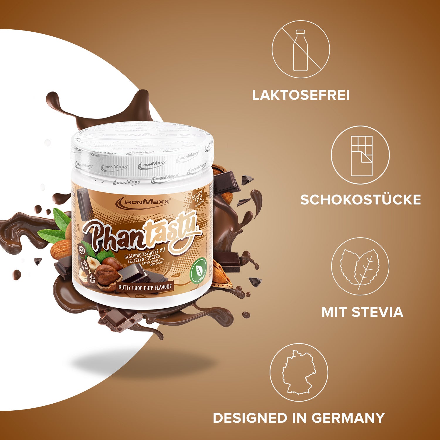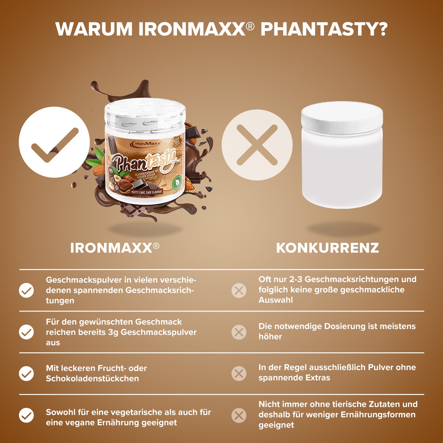 IronMaxx® Phantasty® Geschmackspulver – das vielseitige Flavour Pulver für Quark, Joghurt, Porridge, Proteinshakes oder Müsli. Intensiver Geschmack mit echten Fruchtstückchen oder Schokoladenstückchen – bei nur 11 kcal pro Portion und komplett zuckerfrei.