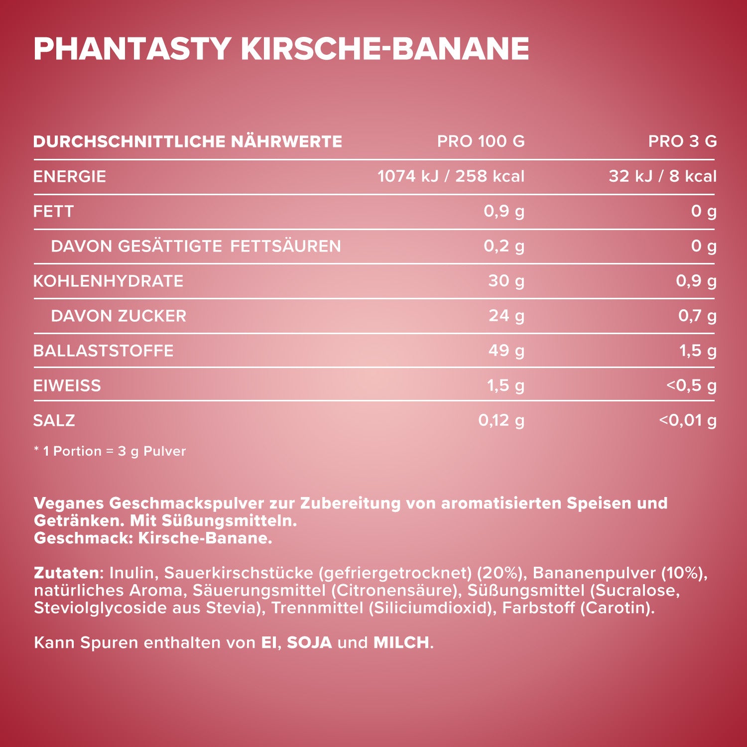 Verkehrsbezeichnung: Veganes Geschmackspulver zur Zubereitung von aromatisierten Speisen und Getränken. Mit Zuckern und Süßungsmitteln. Geschmack: Kirsche-Banane.