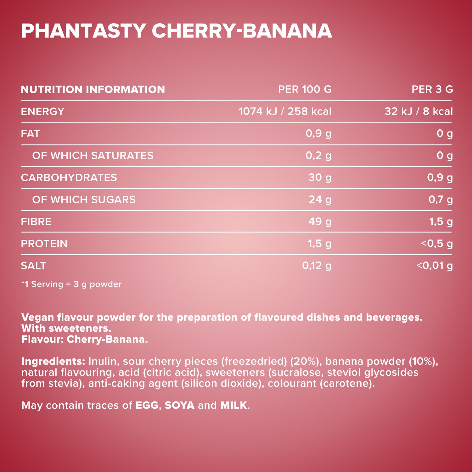 Inulin, Sauerkirschstücke (gefriergetrocknet) (20%), Bananenpulver (10%), natürliches Aroma, Säuerungsmittel (Citronensäure), Süßungsmittel (Sucralose, Steviolglycoside aus Stevia), Trennmittel (Siliciumdioxid), Farbstoff (Carotin).