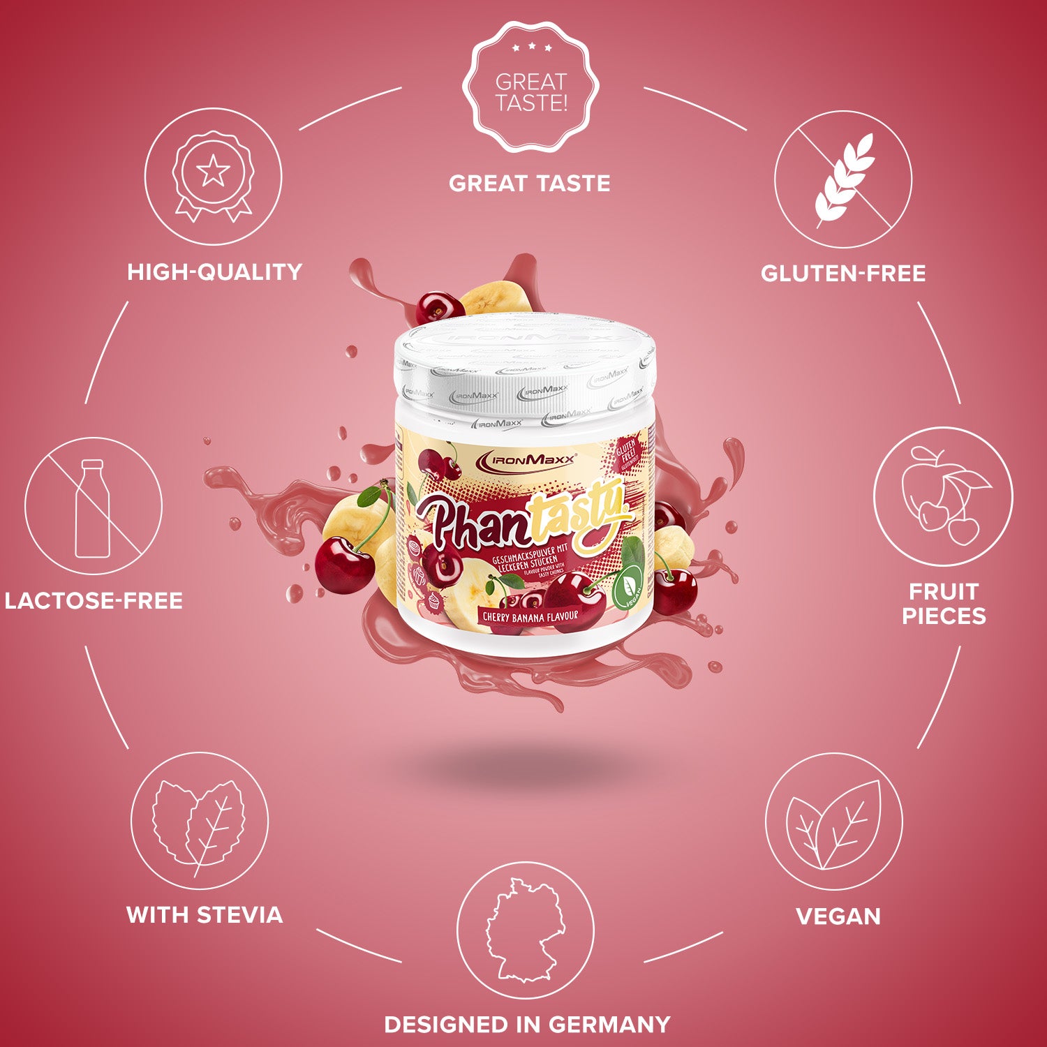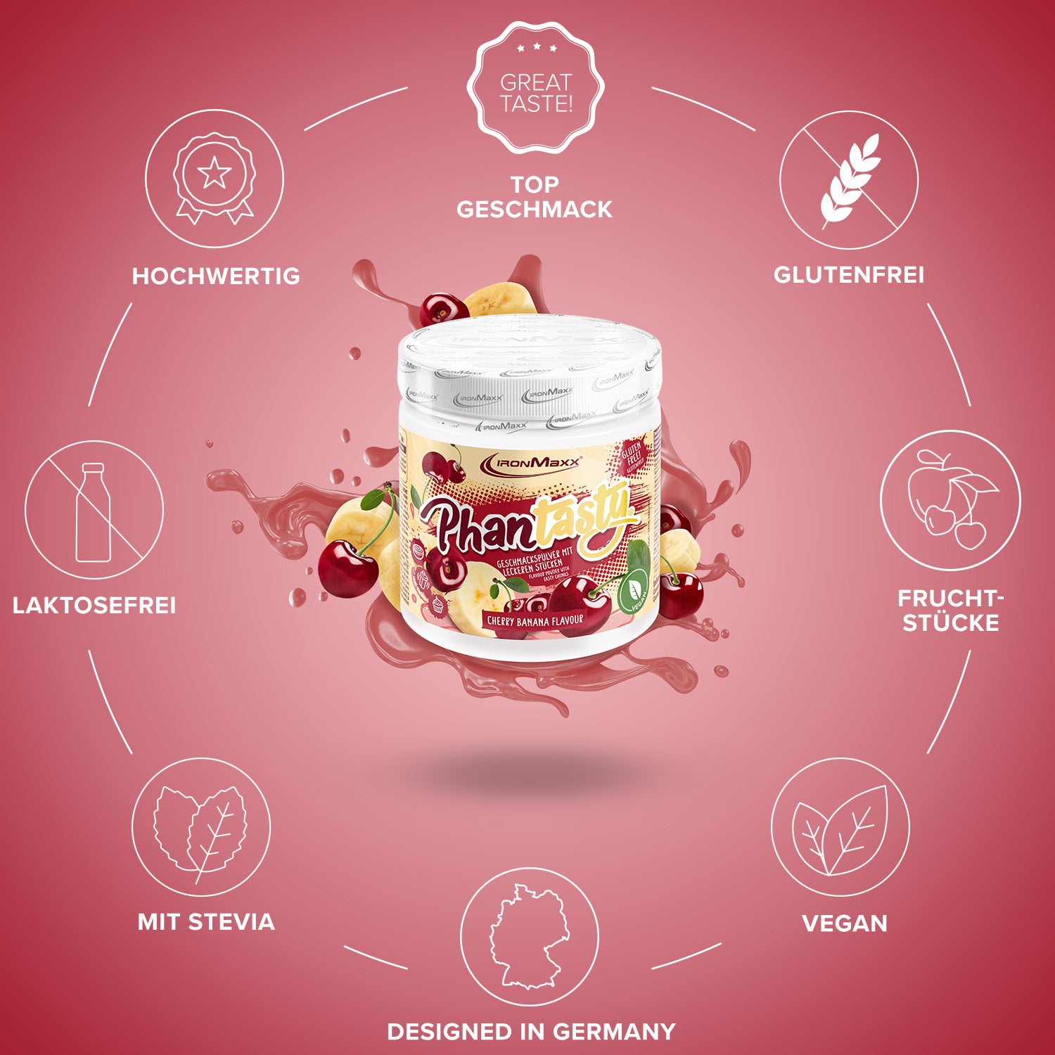 IronMaxx® Phantasty® Geschmackspulver – das vielseitige Flavour Pulver für Quark, Joghurt, Porridge, Proteinshakes oder Müsli. Intensiver Geschmack mit echten Fruchtstückchen oder Schokoladenstückchen – bei nur 11 kcal pro Portion und komplett zuckerfrei.