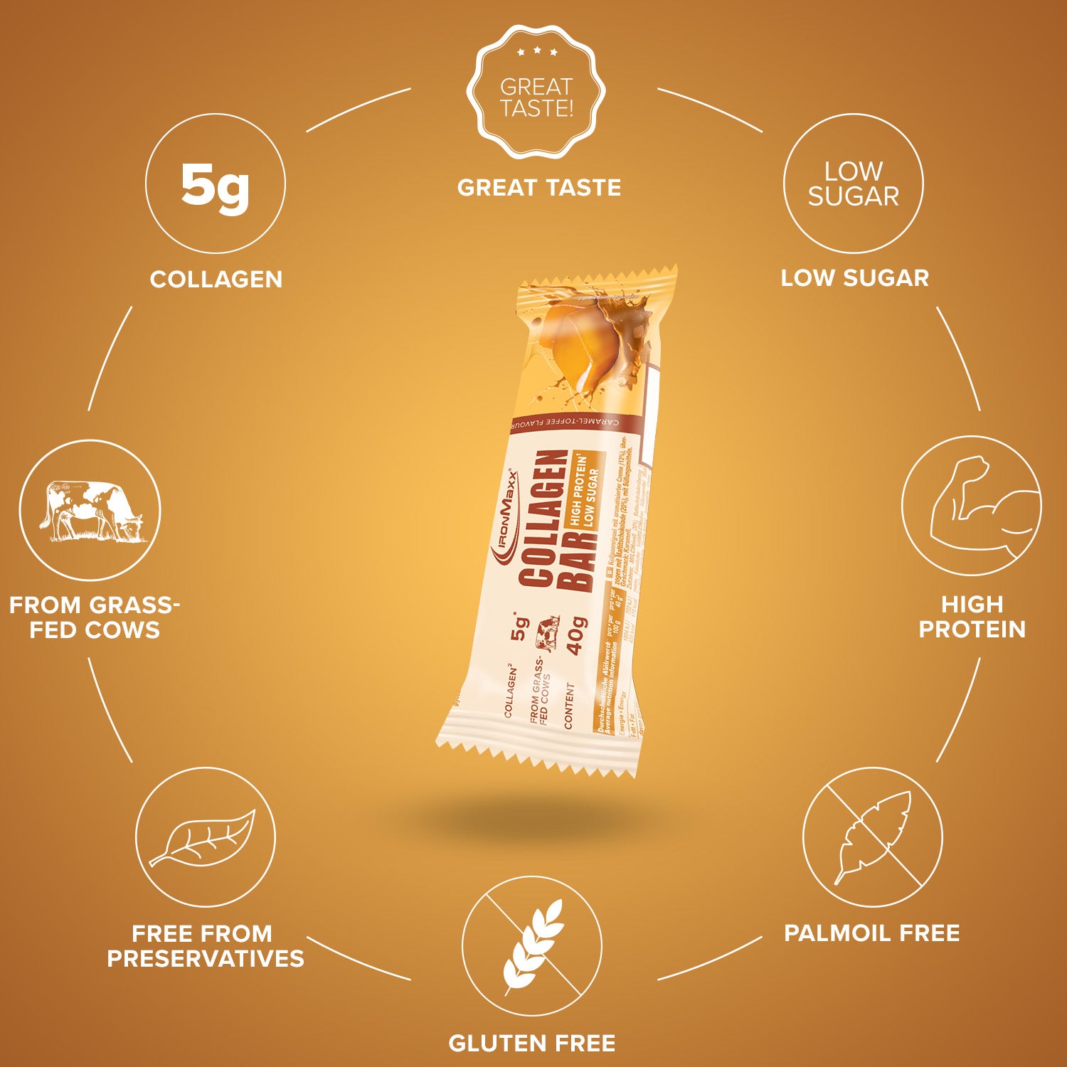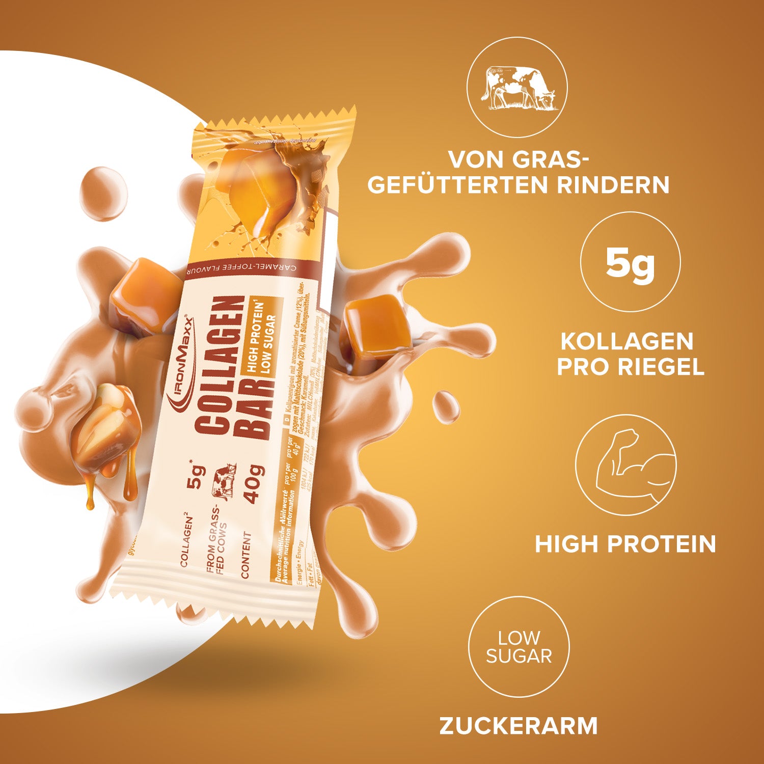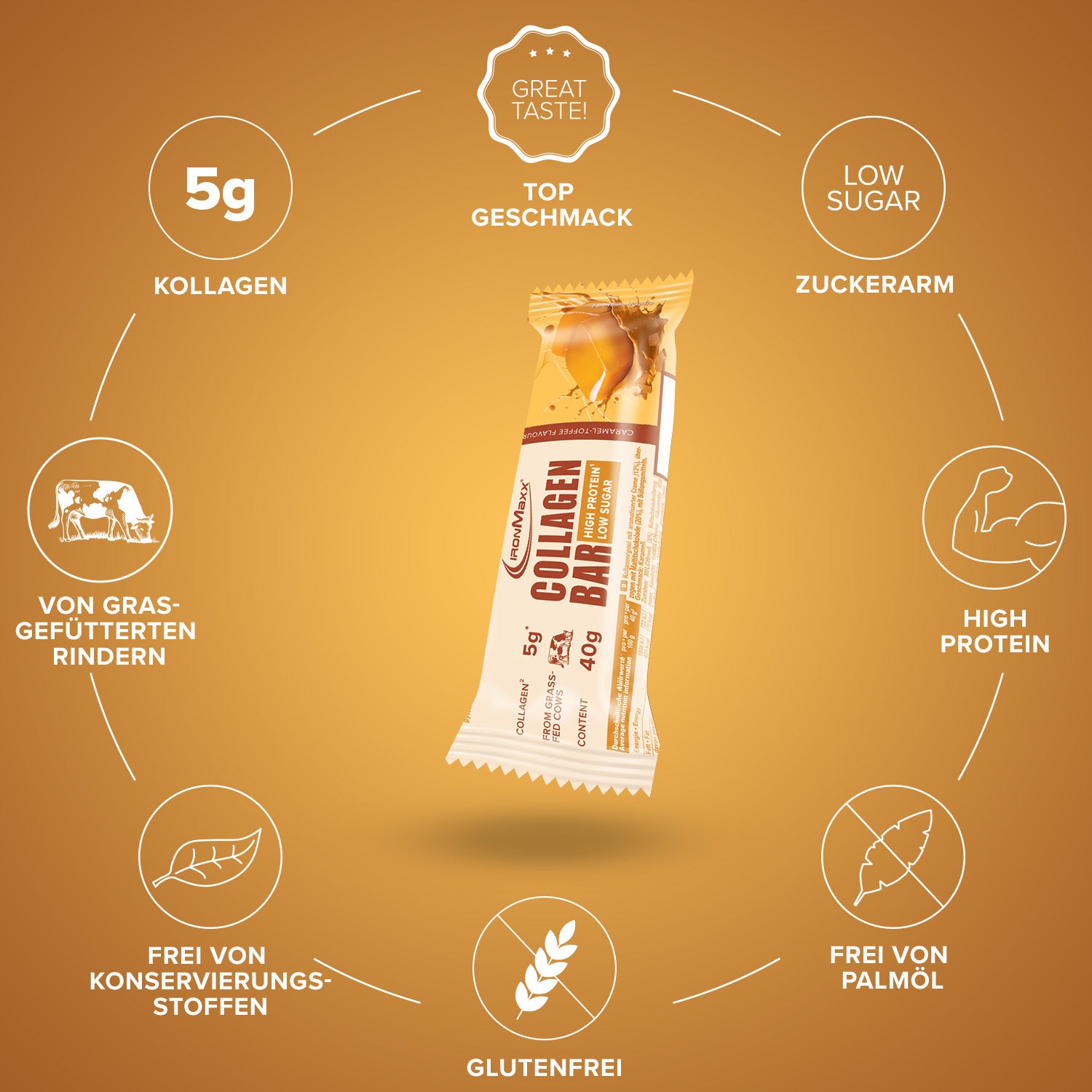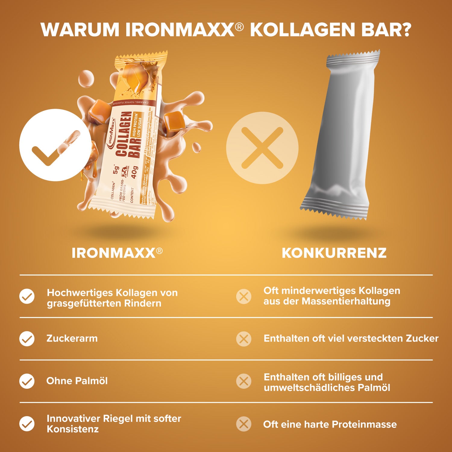 - Ein Tray IronMaxx Collagen Bars beinhaltet 12 Riegel mit à 40g.