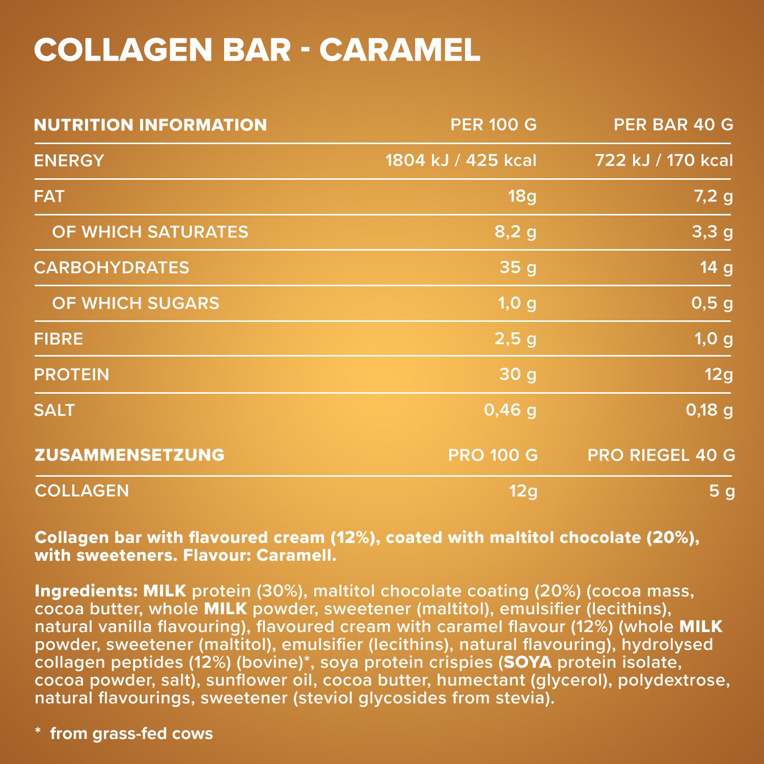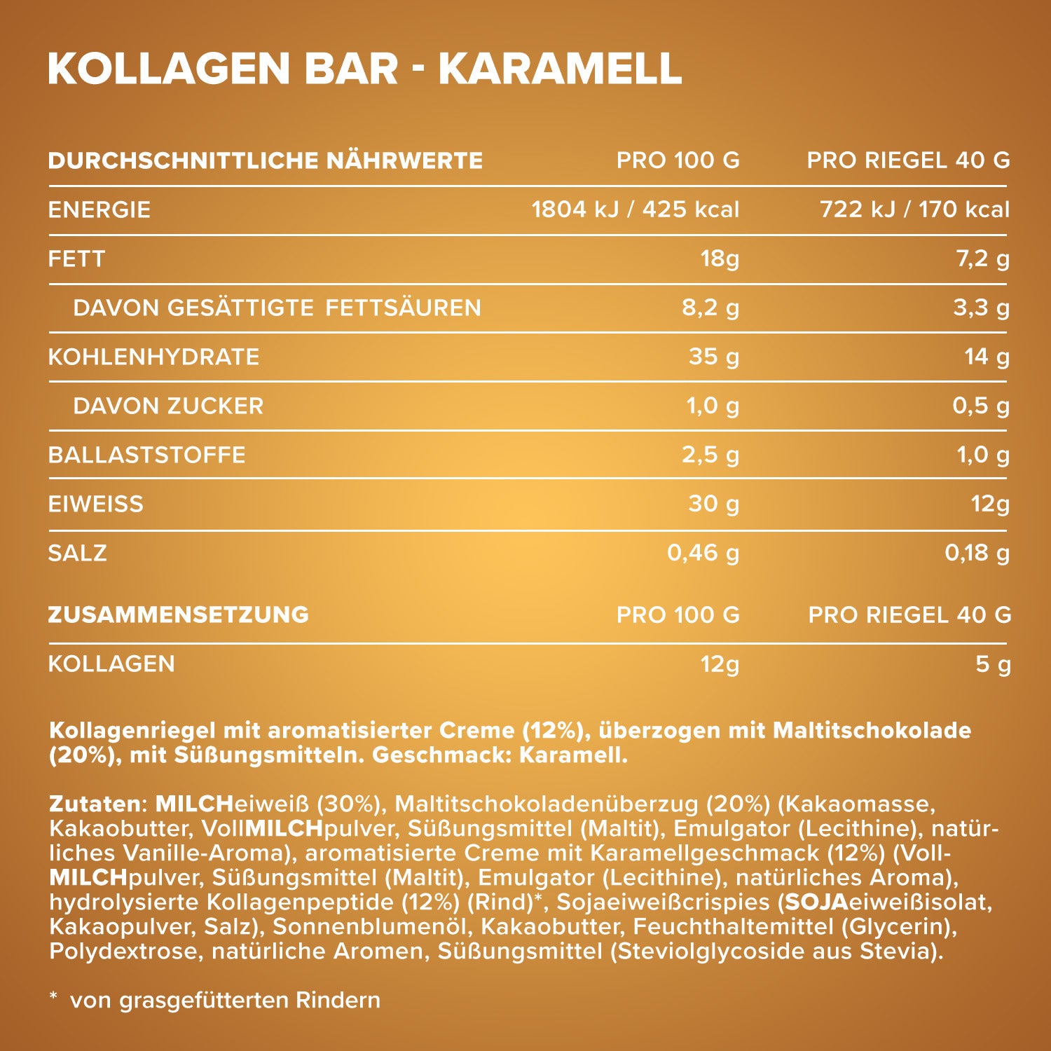 MILCHeiweiß (30%), Maltitschokoladenüberzug (20%) (Kakaomasse, Kakaobutter, VollMILCHpulver, Süßungsmittel (Maltit), Emulgator (Lecithine), natürliches Vanille Aroma), aromatisierte Creme mit Karamellgeschmack (12%) (VollMILCHpulver, Süßungsmittel (Maltit), Emulgator (Lecithine), natürliches Aroma), hydrolysierte Kollagenpeptide (12%) (Rind), Sojaeiweißcrispies (SOJAeiweißisolat, Kakaopulver, Salz), Sonnenblumenöl, Kakaobutter, Feuchthaltemittel (Glycerin), Polydextrose, natürliche Aromen, Süßungsmittel (Steviolglycoside aus Stevia).