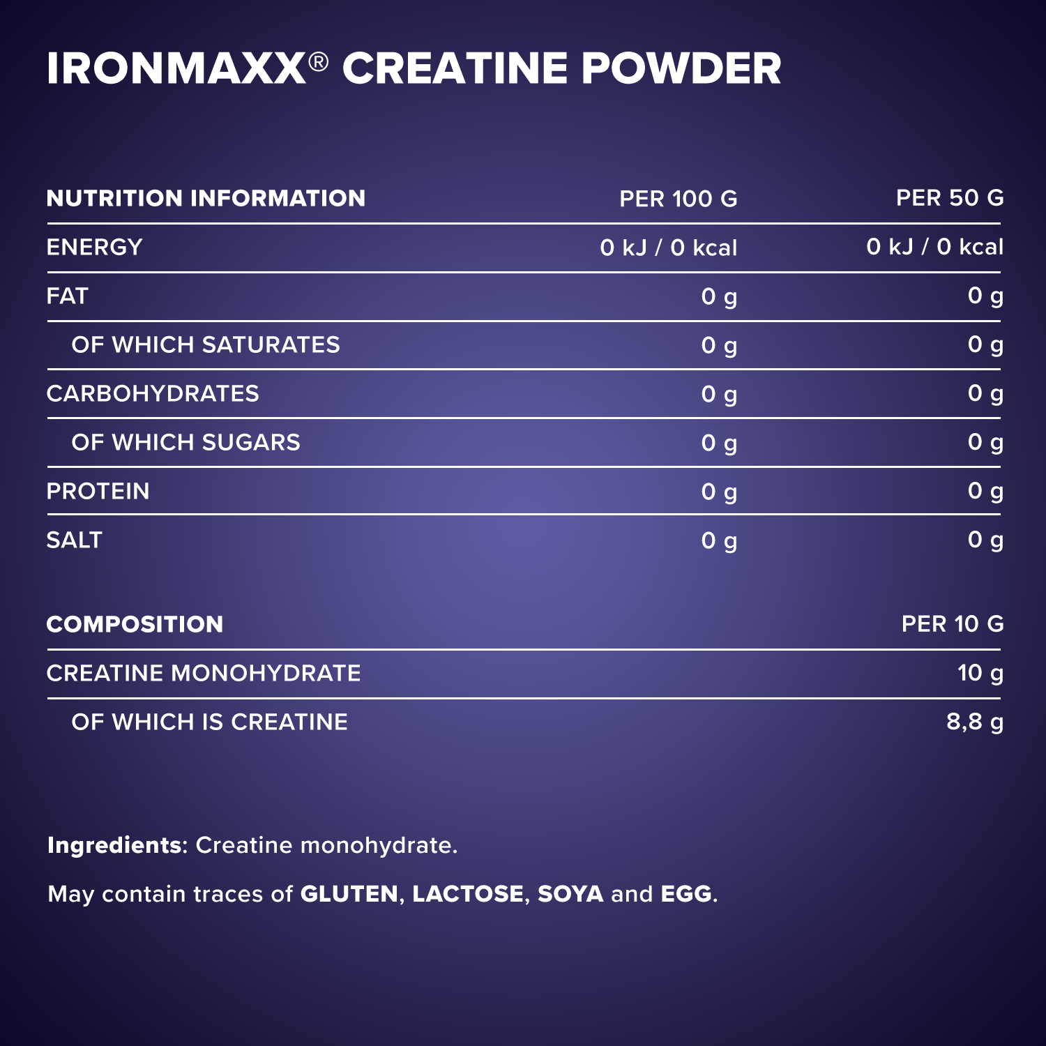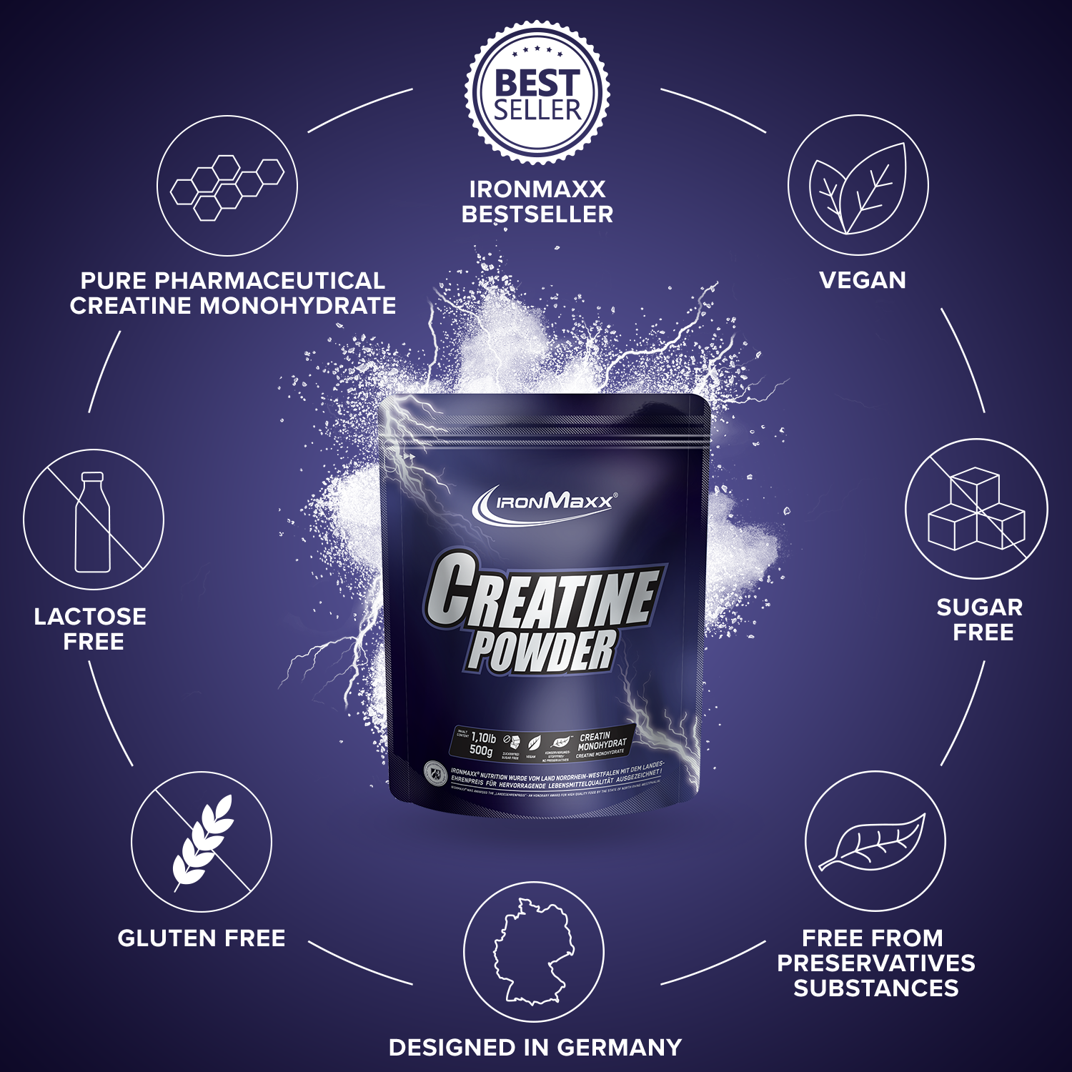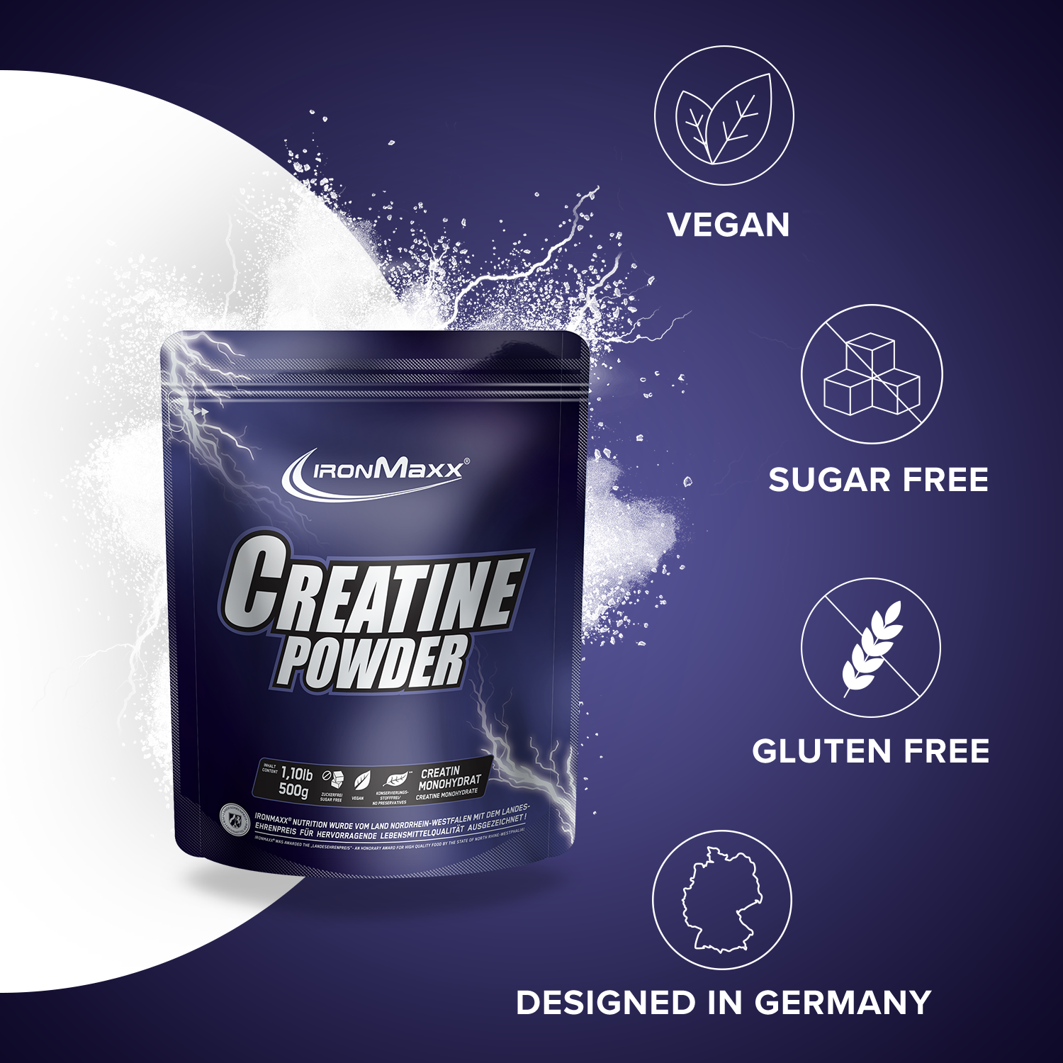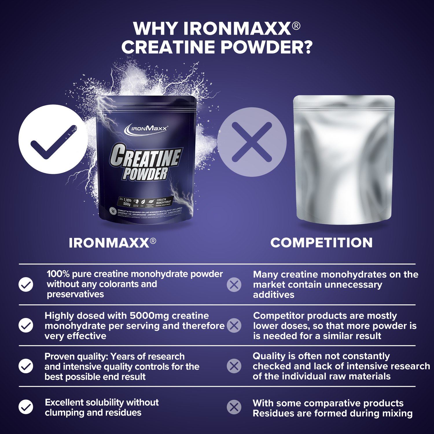 - Reines Kreatin: Hochqualitatives Kreatin Monohydrat von IronMaxx® in fein löslicher Pulverform.