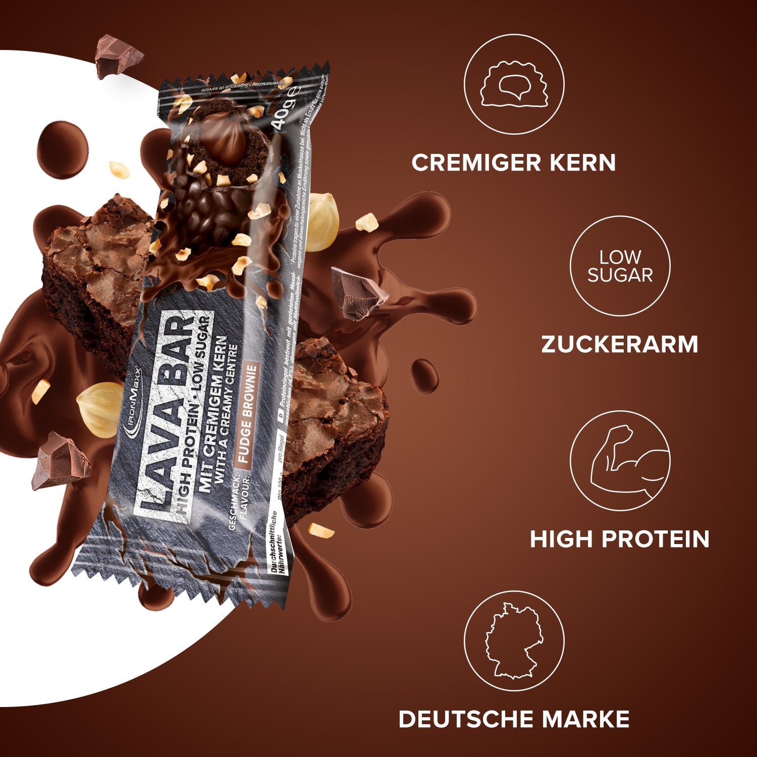 IronMaxx® Lava Bar – der High Protein Riegel für alle, die Wert auf Funktionalität und Geschmack legen. Mit bis zu 34 % Eiweiß unterstützt er gezielt den Muskelaufbau, fördert die Regeneration und liefert dir neue Energie – jederzeit und überall.