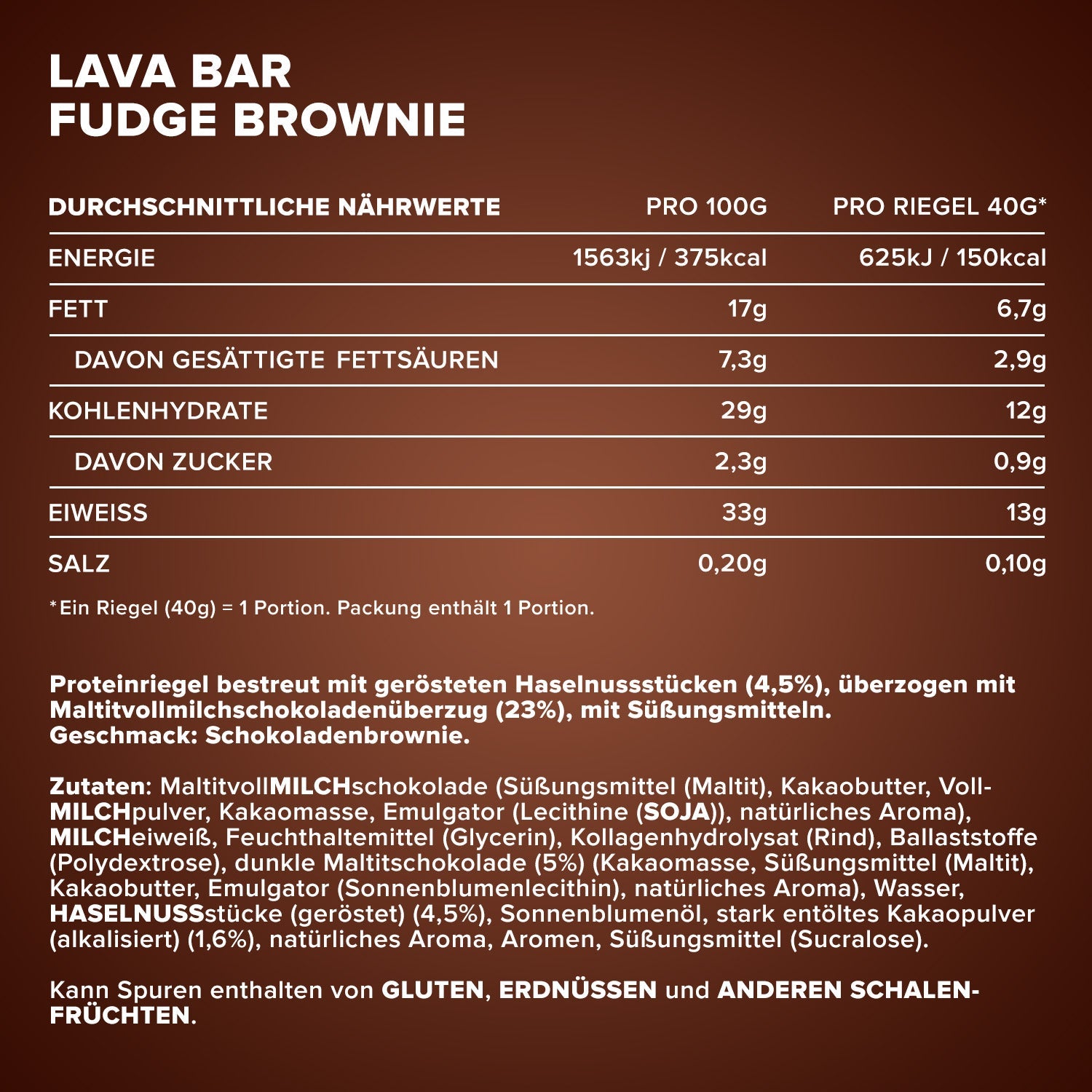MaltitvollMILCHschokolade (Süßungsmittel (Maltit), Kakaobutter, VollMILCHpulver, Kakaomasse, Emulgator (Lecithine (SOJA)), natürliches Aroma), MILCHeiweiß, Feuchthaltemittel (Glycerin), Kollagenhydrolysat (Rind), Ballaststoffe (Polydextrose), dunkle Maltitschokolade (5%) (Kakaomasse, Süßungsmittel (Maltit), Kakaobutter, Emulgator (Sonnenblumenlecithin), natürliches Aroma), Wasser, HASELNUSSstücke (geröstet) (4,5%), Sonnenblumenöl, stark entöltes Kakaopulver (alkalisiert) (1,6%), natürliches Aroma, Aromen, Süßungsmittel (Sucralose). Kann Spuren enthalten von GLUTEN, ERDNÜSSEN und ANDEREN SCHALENFRÜCHTEN.