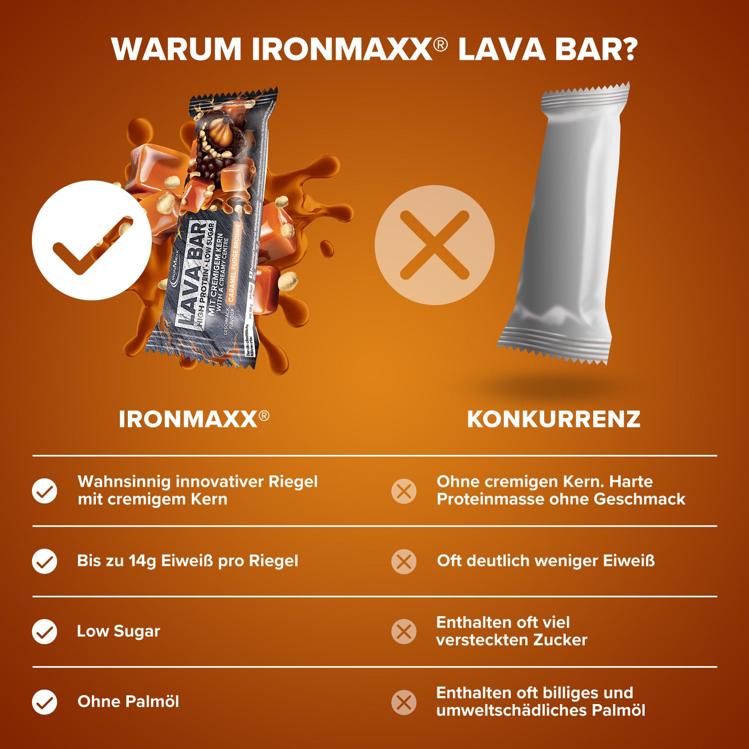 IronMaxx® Lava Bar – der High Protein Riegel für alle, die Wert auf Funktionalität und Geschmack legen. Mit bis zu 34 % Eiweiß unterstützt er gezielt den Muskelaufbau, fördert die Regeneration und liefert dir neue Energie – jederzeit und überall.