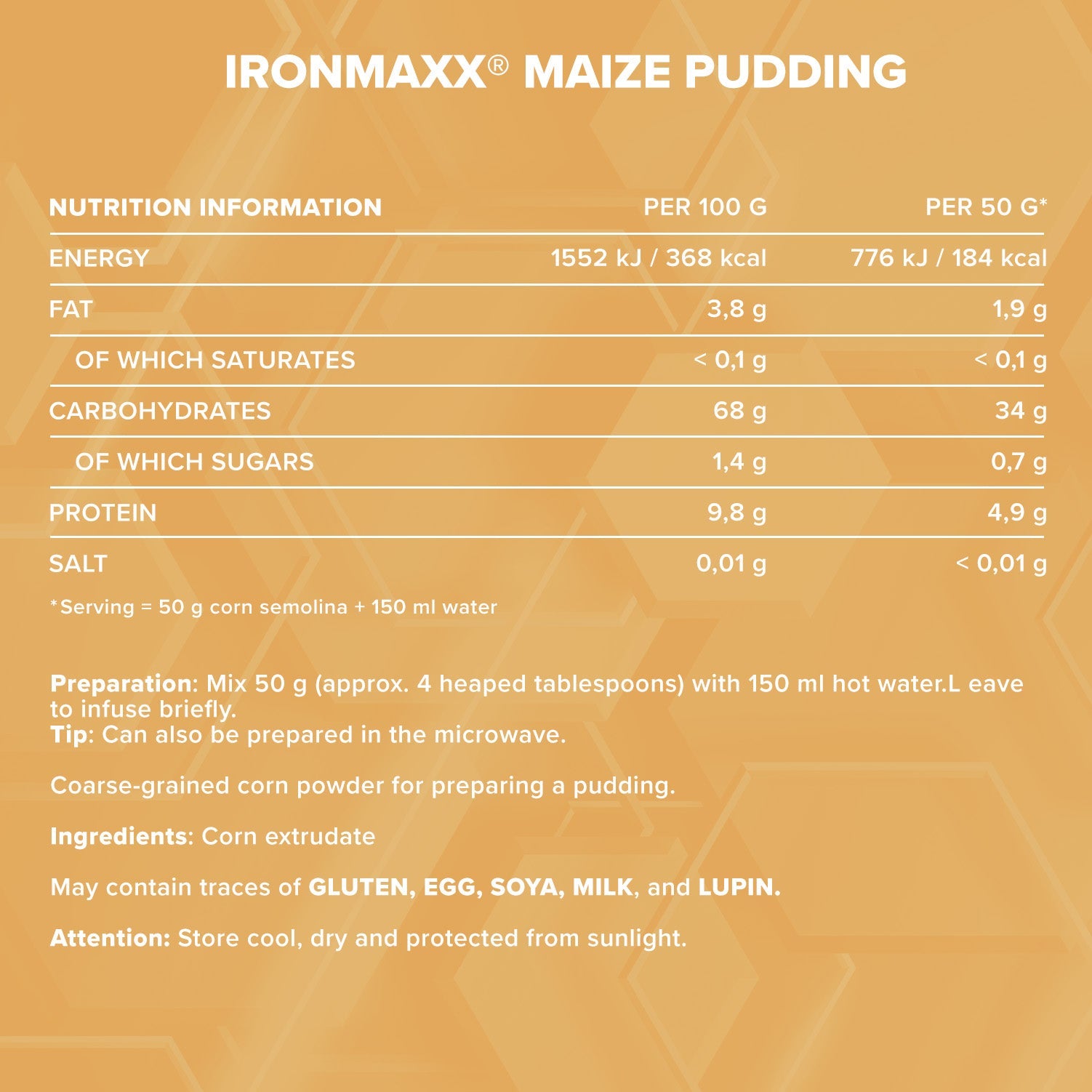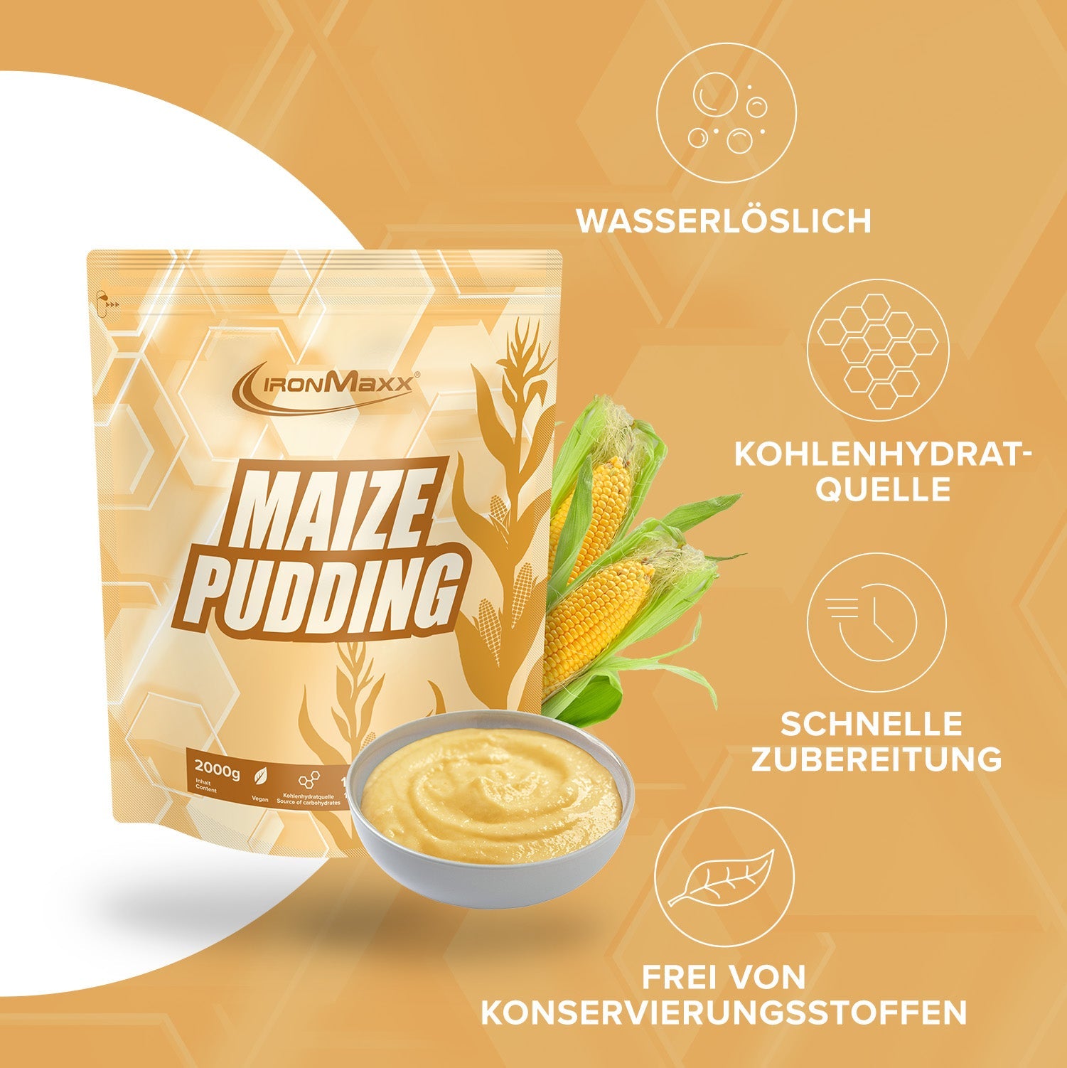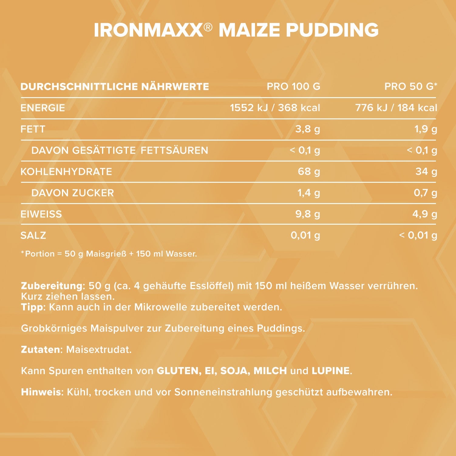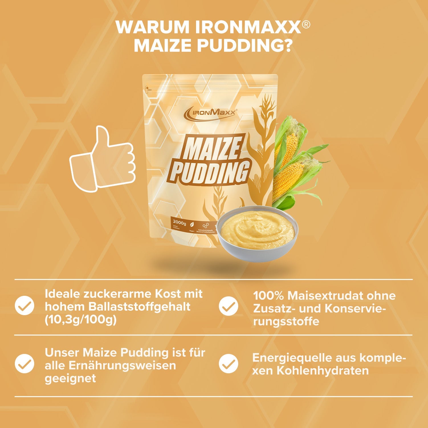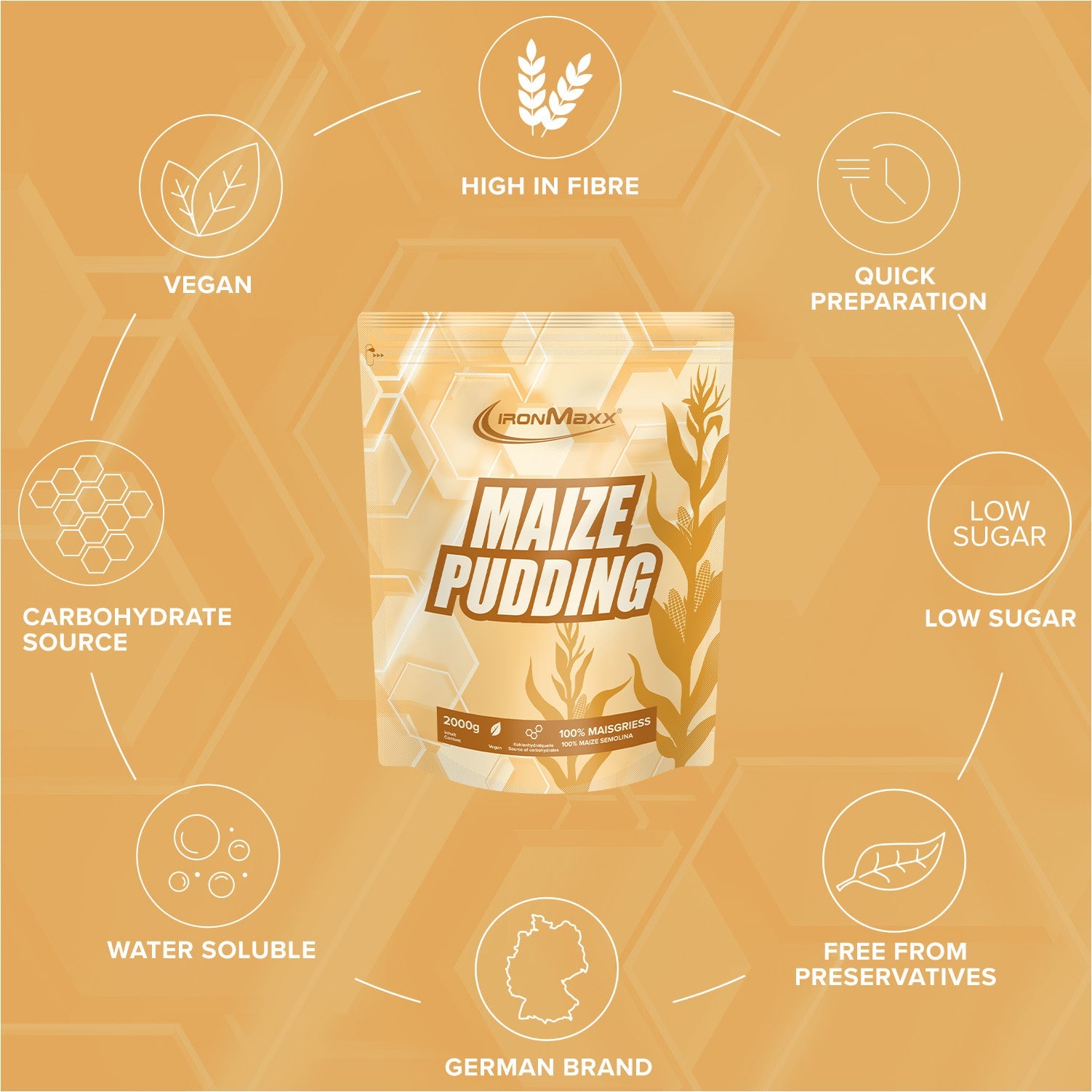 Der IronMaxx® Maize Pudding ist dein perfekter Begleiter für ein nährstoffreiches Frühstück, einen süßen Snack oder dein Pre- bzw. Post-Workout Meal. Der vegane Pudding liefert dir hochwertige, komplexe Kohlenhydrate und ist dabei fett- und zuckerarm.