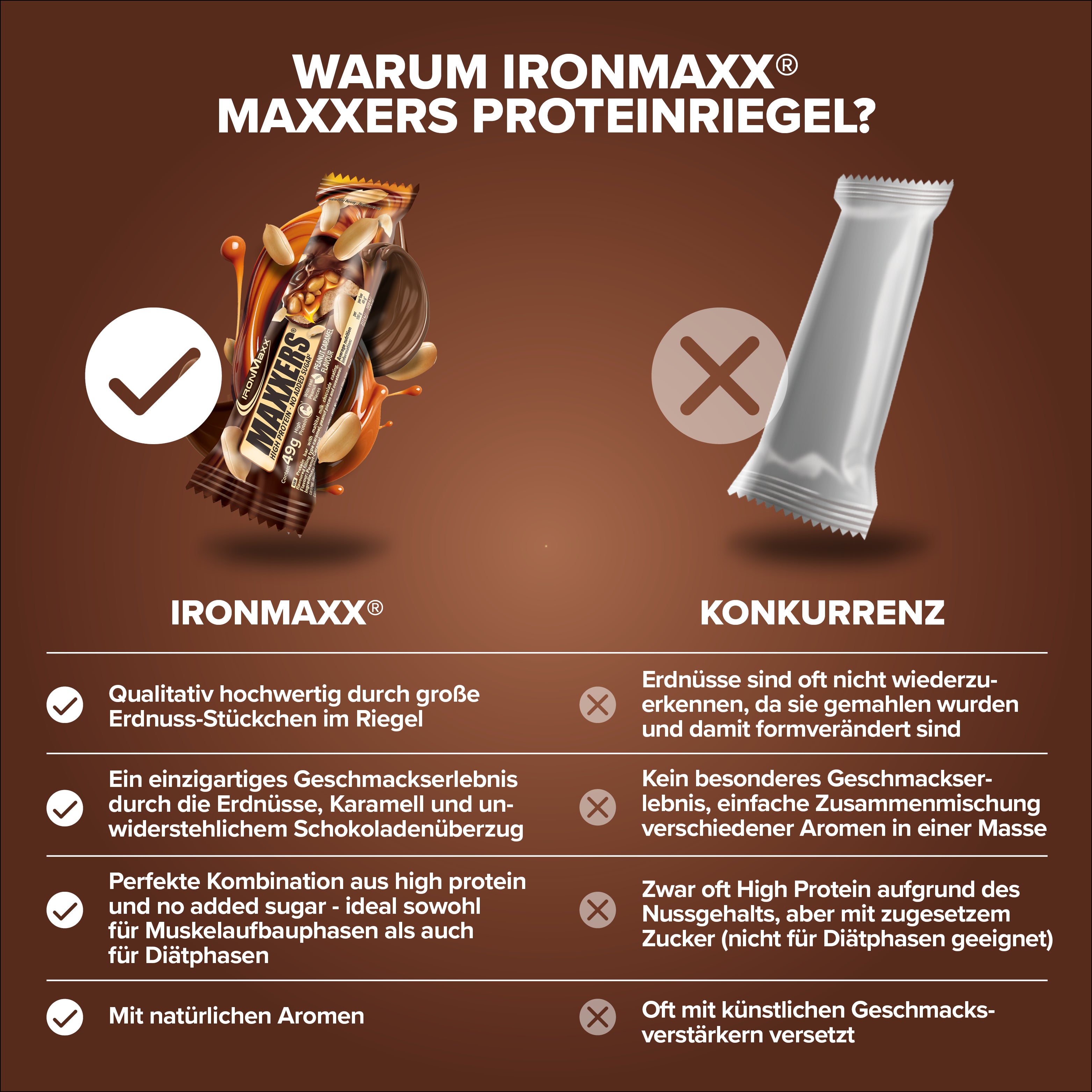 Molkeneiweißkonzentrat (20%) (MILCH), Karamellfüllung (ApfelExtrakt, Molkeneiweißkonzentrat (MILCH), ungesüßte KondensMILCH, Kokosfett, Farbstoff (Zuckerkulör), Emulgator (Mono- und Diglyceride von Speisefettsäuren), Salz, natürliches Aroma), ERDNUSSstücke (16%), Süßungsmittel (Maltit), Kakaobutter, ERDNÜSSE (7,2%), MagerMILCHpulver, Palmfett, Kakaomasse, VollMILCHpulver, MILCHfett (enthält Emulgator (Lecithine (SOJA))), Salz, natürliches Erdnuss-Aroma (enthält ERDNUSS), Nusspaste (HASELNÜSSE, ERDNÜSSE), Vanille-Extrakt. Kann Spuren enthalten von GLUTEN, EI und ANDEREN SCHALENFRÜCHTEN.
