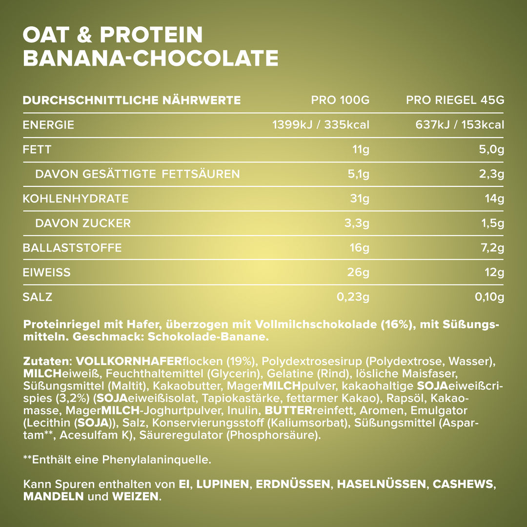Verkehrsbezeichnung: Proteinriegel mit Hafer, überzogen mit Vollmilchschokolade (16%), mit Süßungsmitteln. Geschmack: Schokolade-Banane.