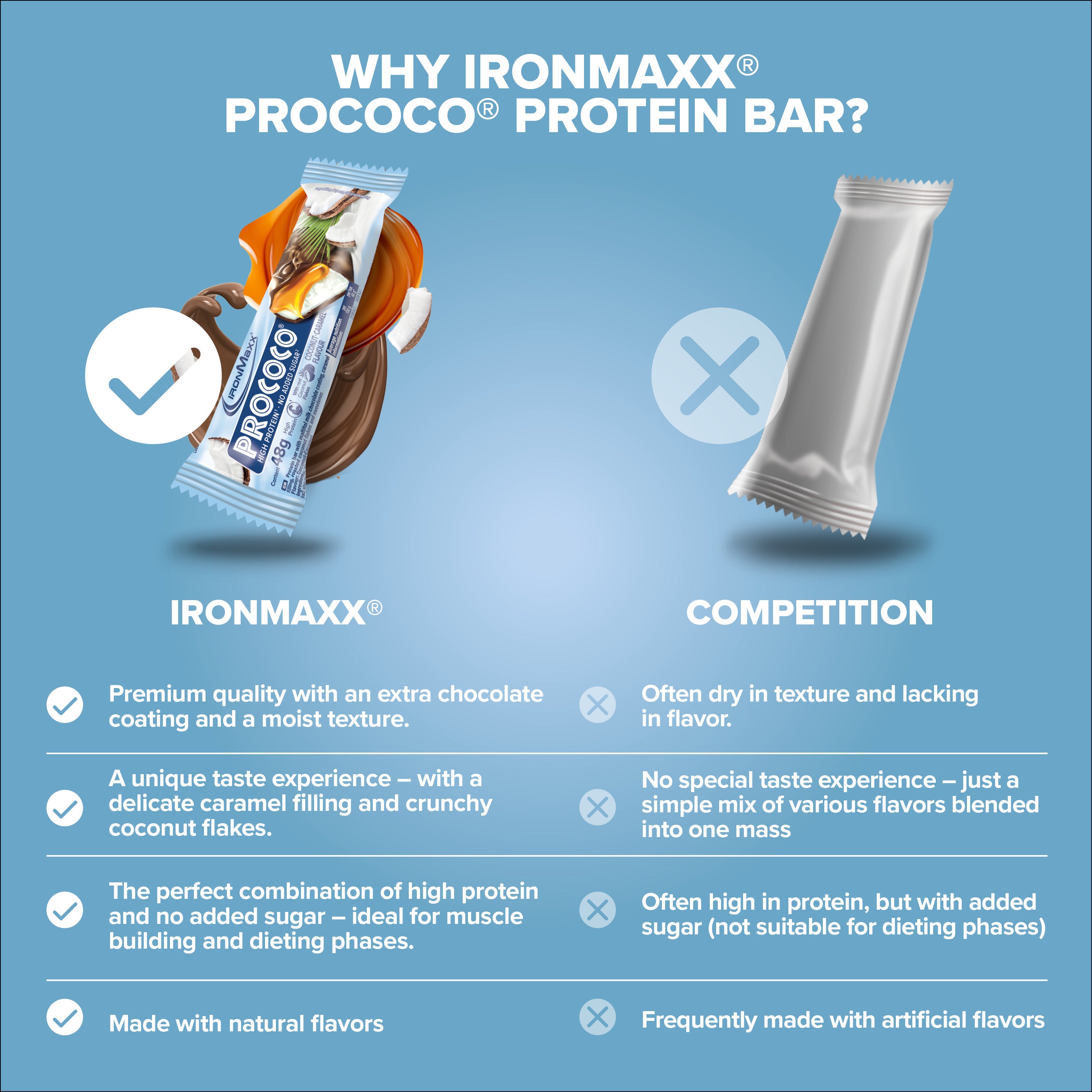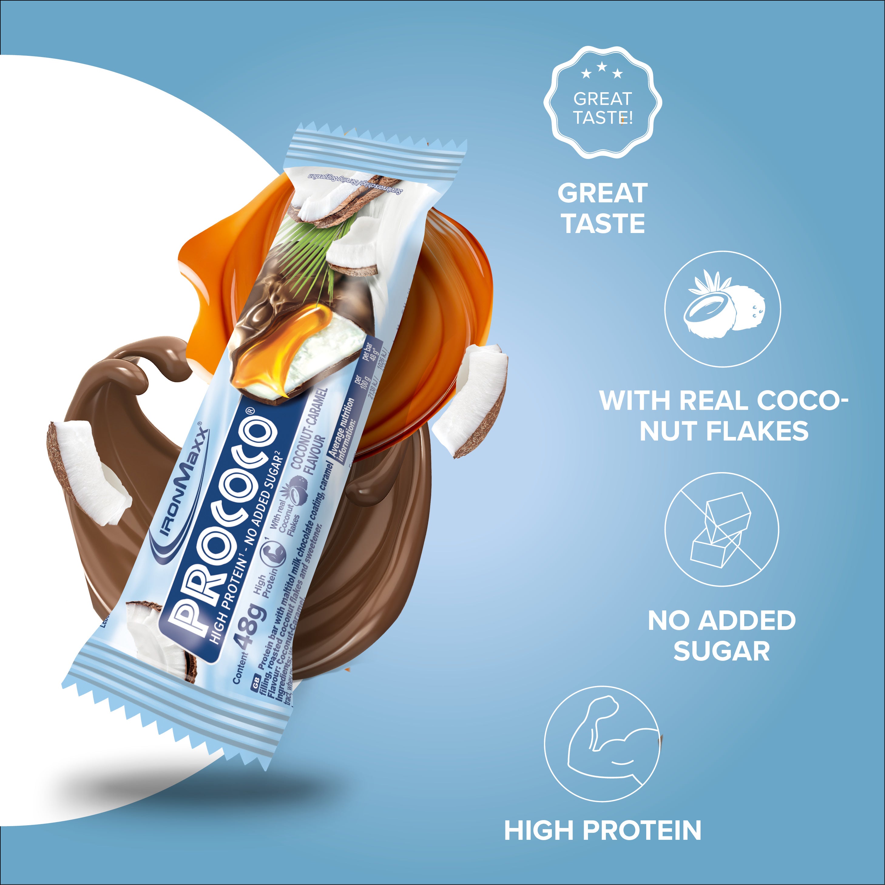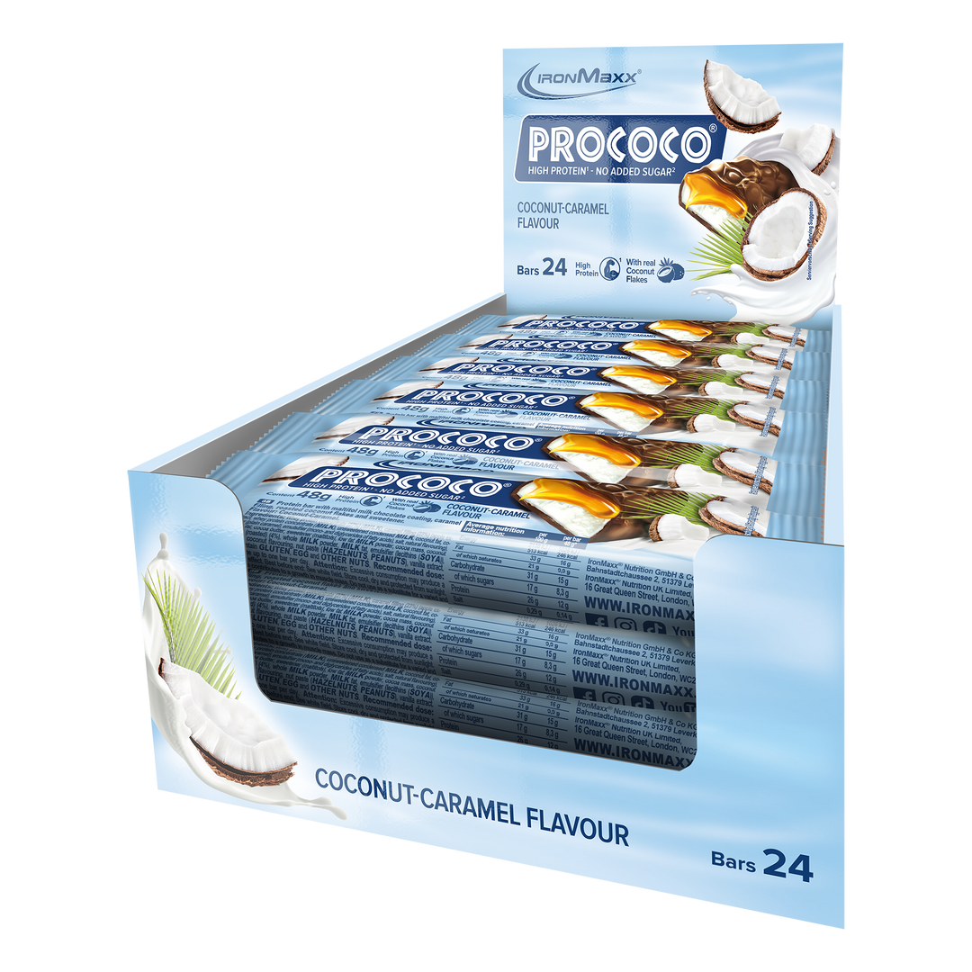 Der IronMaxx® Proteinriegel vereint cremige Karamellfüllung, knackige Kokosraspeln und einen feinen Schokoladenüberzug zu einem einzigartigen Geschmackserlebnis. Jeder Riegel (48 g) liefert 12 g hochwertiges Protein zur Unterstützung von Muskelaufbau und Regeneration.