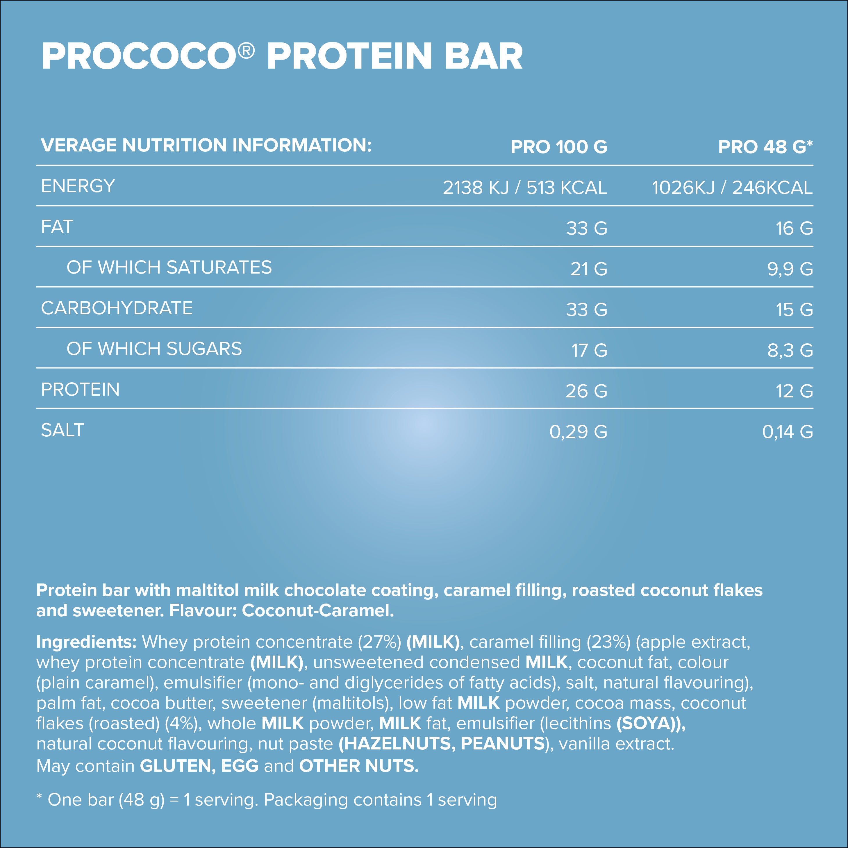 Molkenweißeiweißkonzentrat (27%) (MILCH), Karamellfüllung (23%) (Apfel-Extrakt, Molkeneiweißkonzentrat (MILCH), ungesüßte KondensMILCH, Kokosfett, Farbstoff (Zuckerkulör)), Emulgator (Mono- und Diglyceride von Speisefettsäuren), Salz, natürliches Aroma), Palmfett, Kakaobutter, Süßungsmittel (Maltit), MagerMILCHpulver, Kakaomasse, Kokosraspeln (geröstet) (4%), VollMILCHpulver, MILCHfett, Emulgator (Lecithine (SOJA)), natürliches Kokos-Aroma, Nusspaste (HASELNÜSSE, ERDNÜSSE), Vanille-Extrakt.