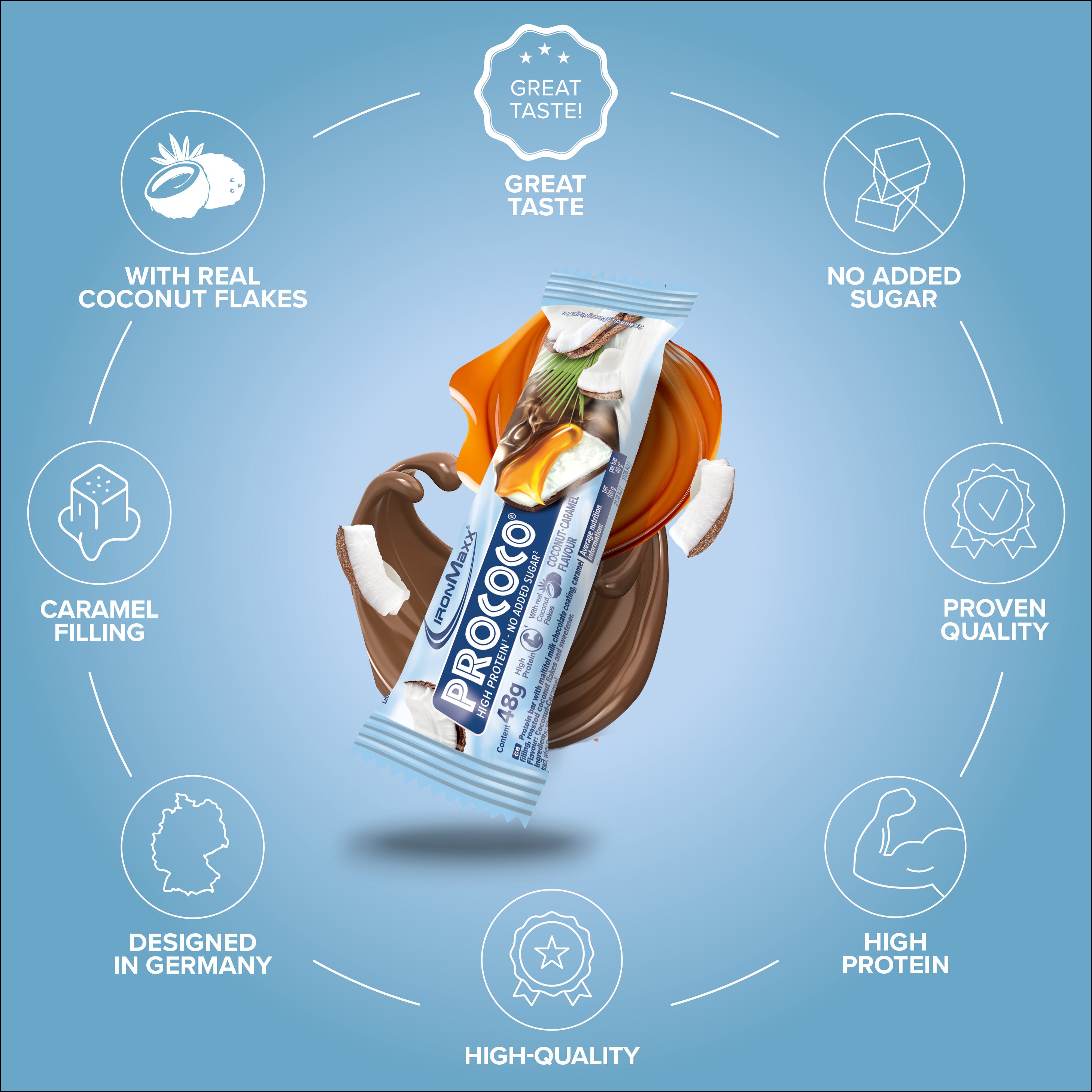 Proteinriegel mit Maltitvollmilchschokoladenüberzug, Karamellfüllung, gerösteten Kokosraspeln und Süßungsmitteln.