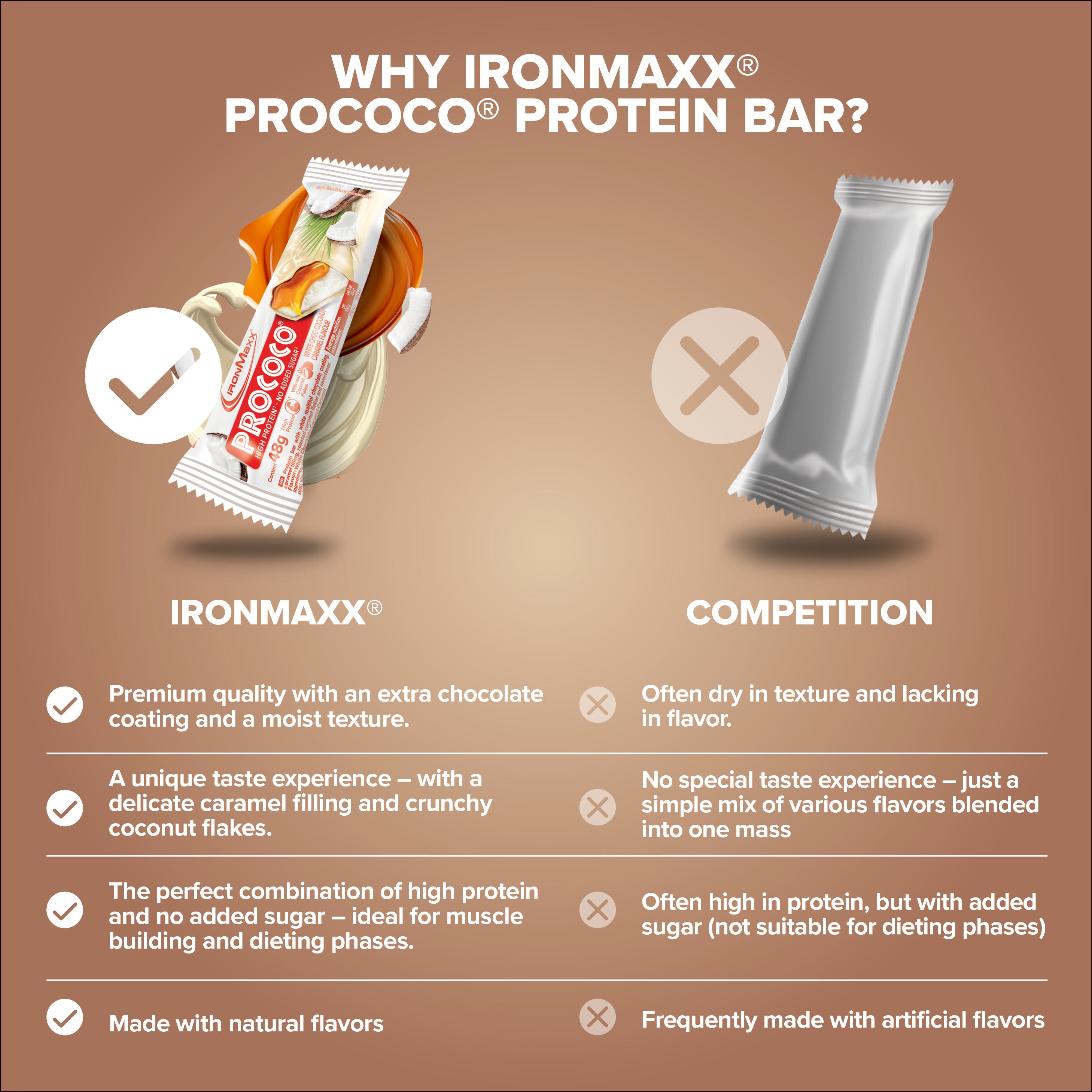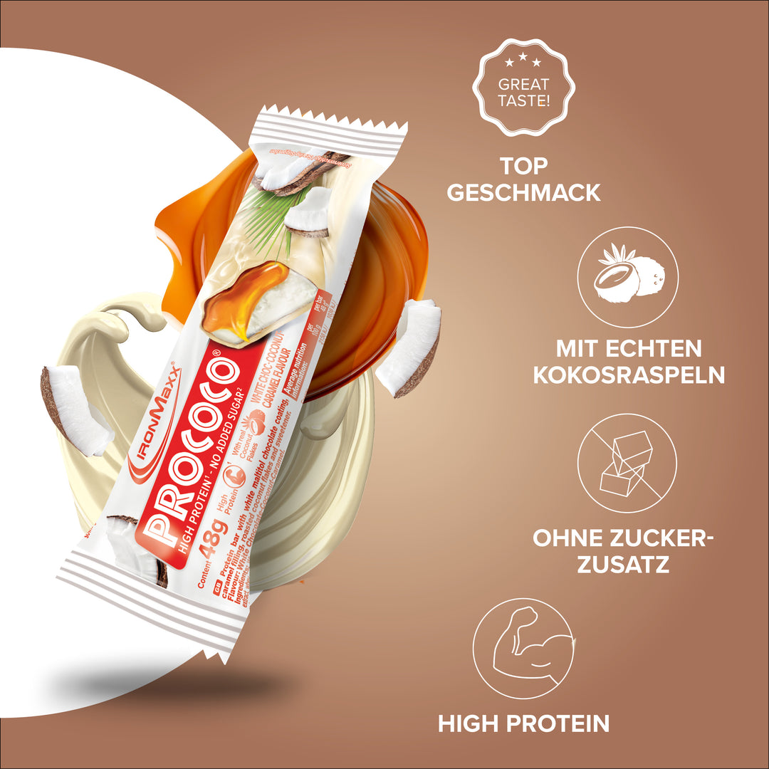 Der IronMaxx® Proteinriegel vereint cremige Karamellfüllung, knackige Kokosraspeln und einen feinen Schokoladenüberzug zu einem einzigartigen Geschmackserlebnis. Jeder Riegel (48 g) liefert 12 g hochwertiges Protein zur Unterstützung von Muskelaufbau und Regeneration.
