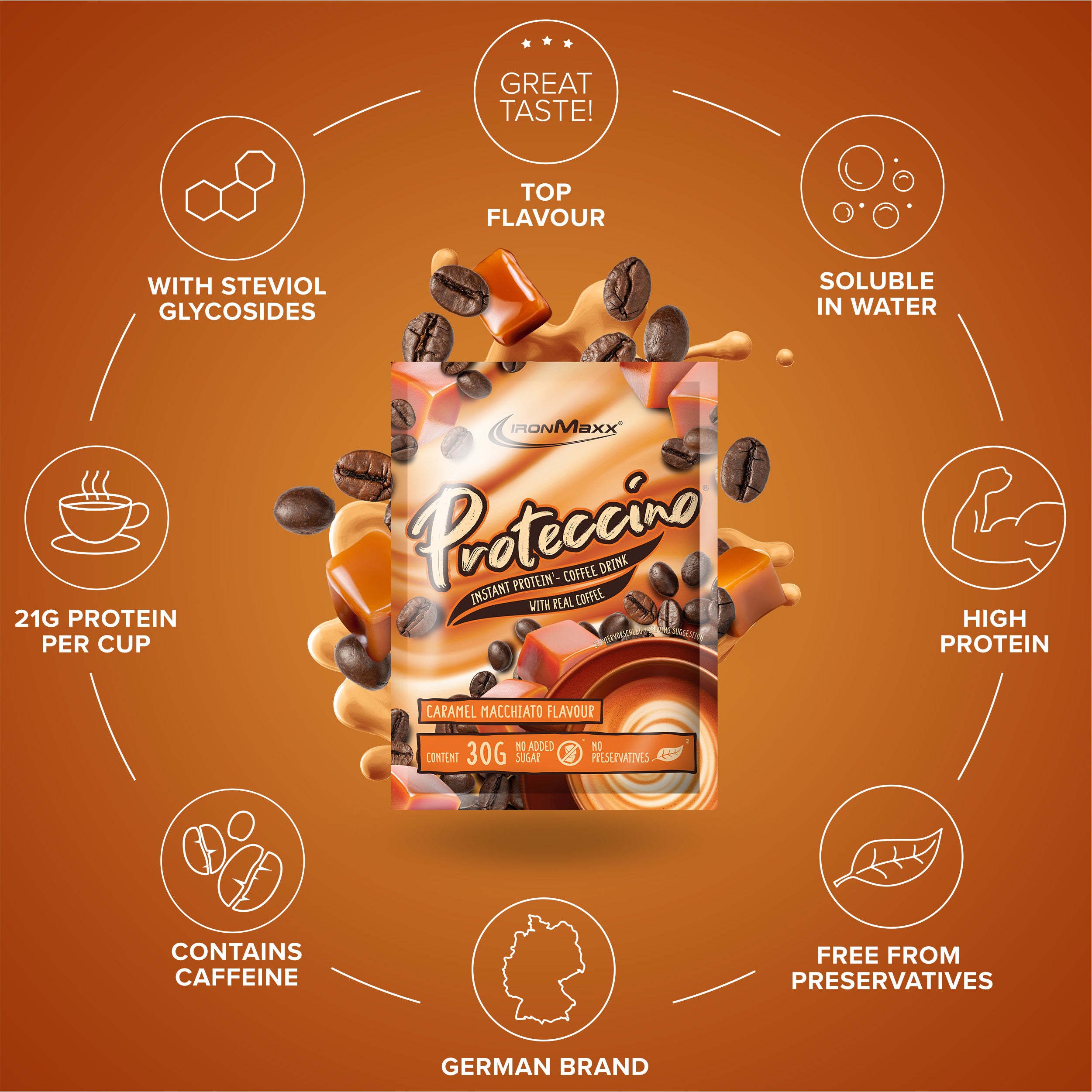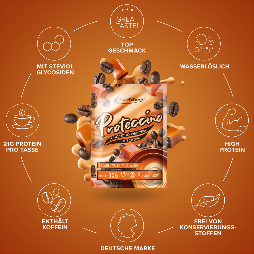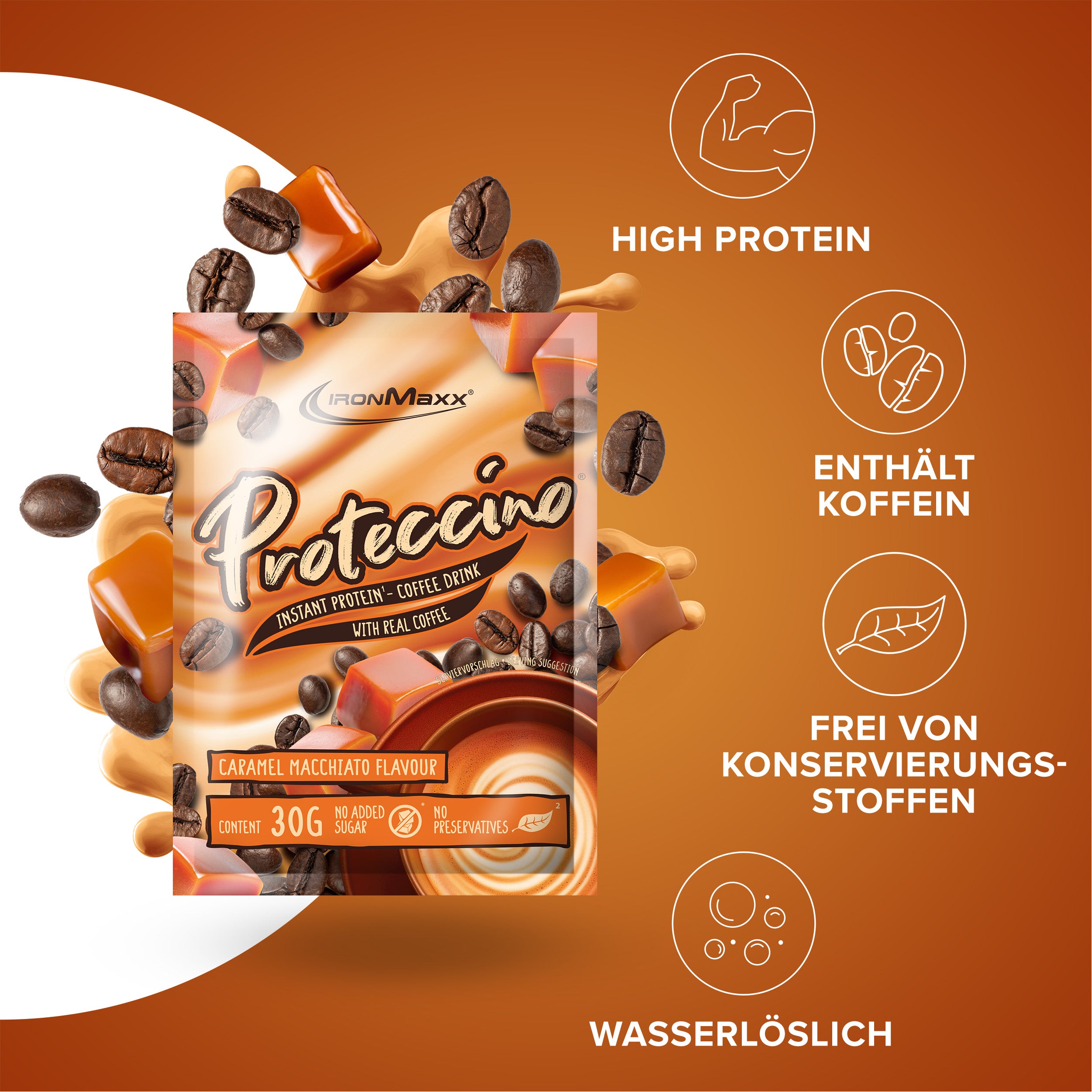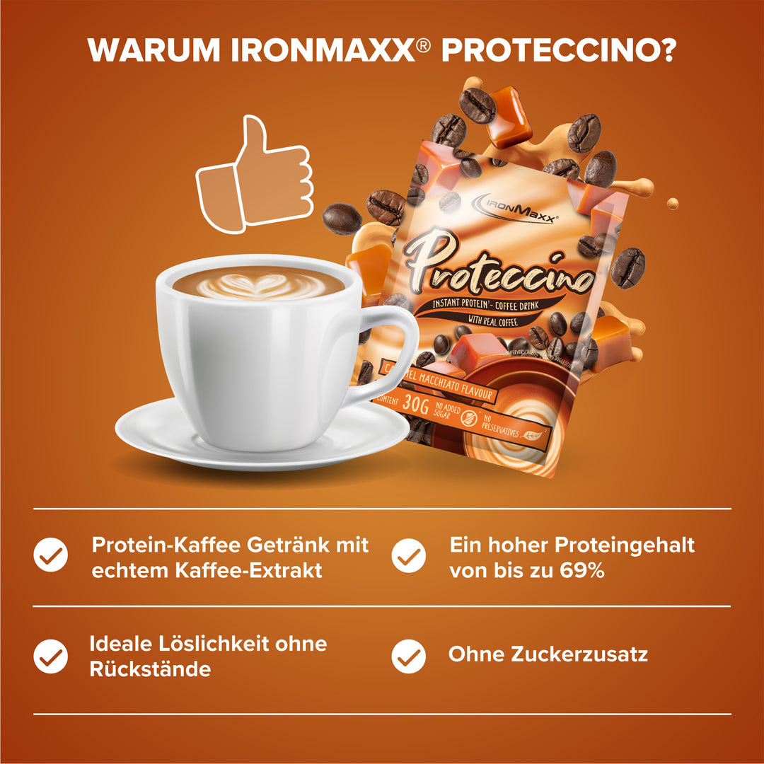 Kaffee oder Protein? Mit dem IronMaxx® Proteccino bekommst du beides – in einem cremigen Instant-Drink mit echtem Kaffee-Extrakt und bis zu 69 % Molkeneiweiß. Perfekt als Frühstücks-Booster, Pre-Workout-Drink oder proteinreicher Genussmoment.