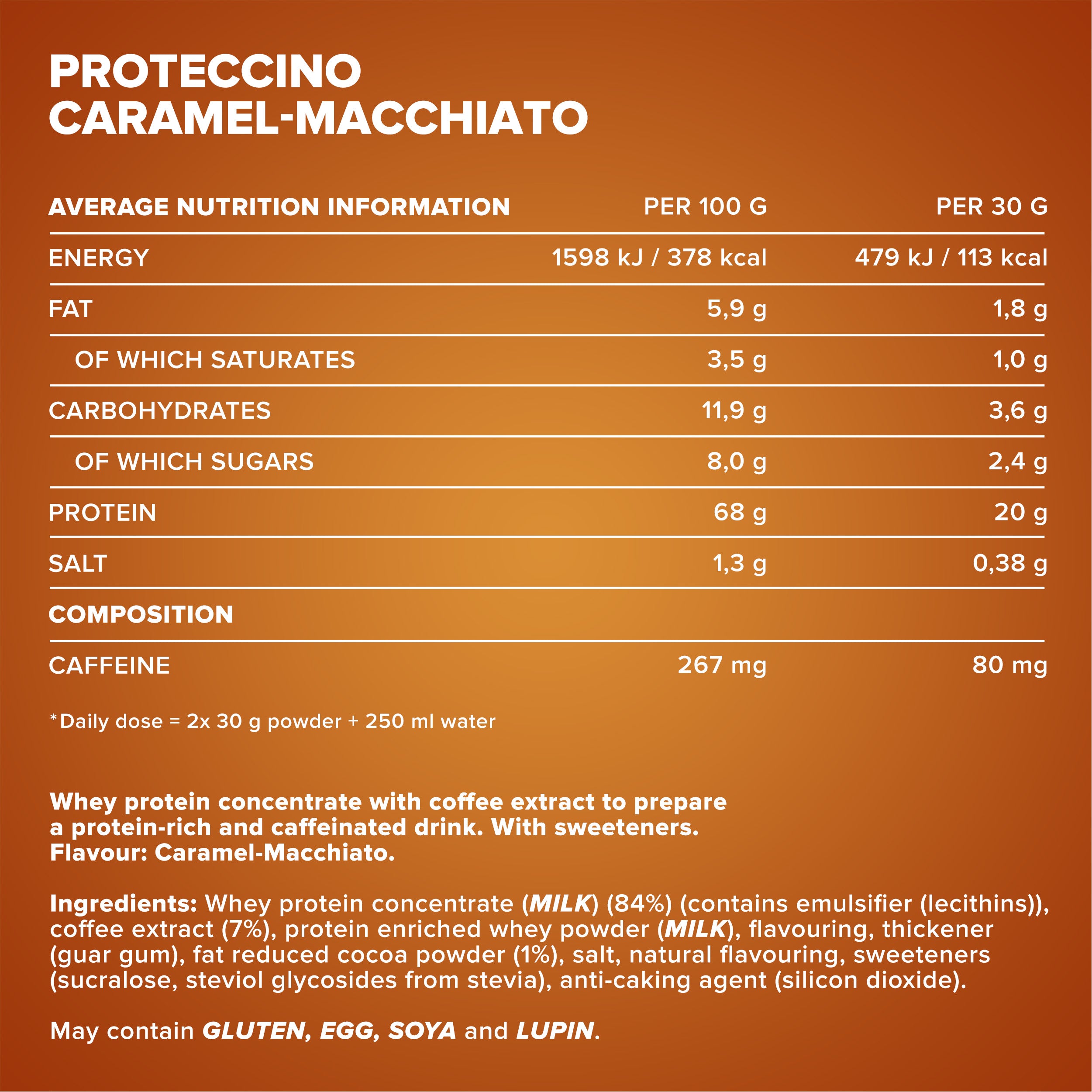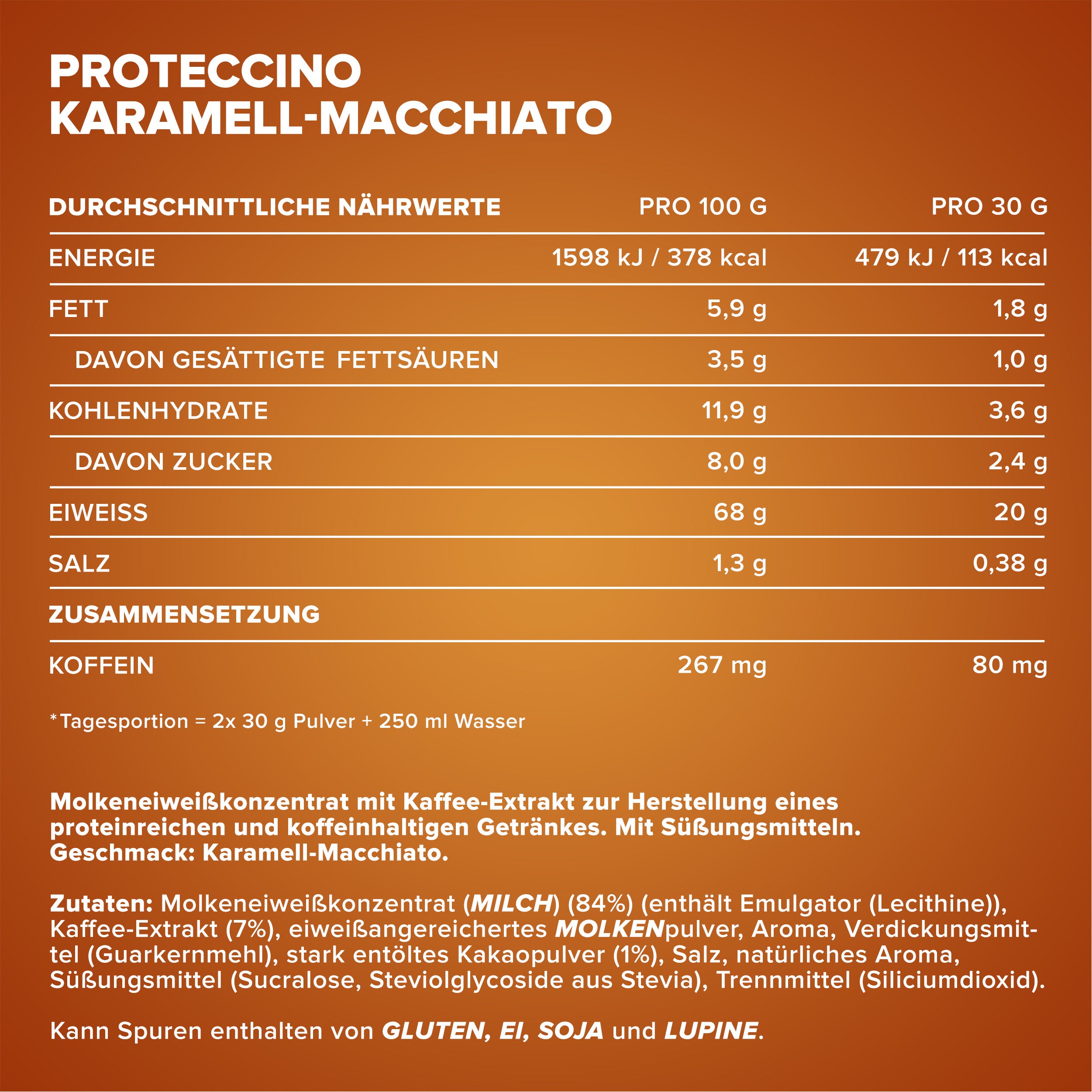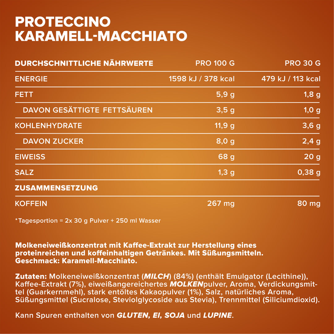 Verkehrsbezeichnung: Molkeneiweißkonzentrat mit Kaffee-Extrakt zur Herstellung eines proteinreichen und koffeinhaltigen Getränkes. Mit Süßungsmitteln. Geschmack: Karamell-Macchiato.