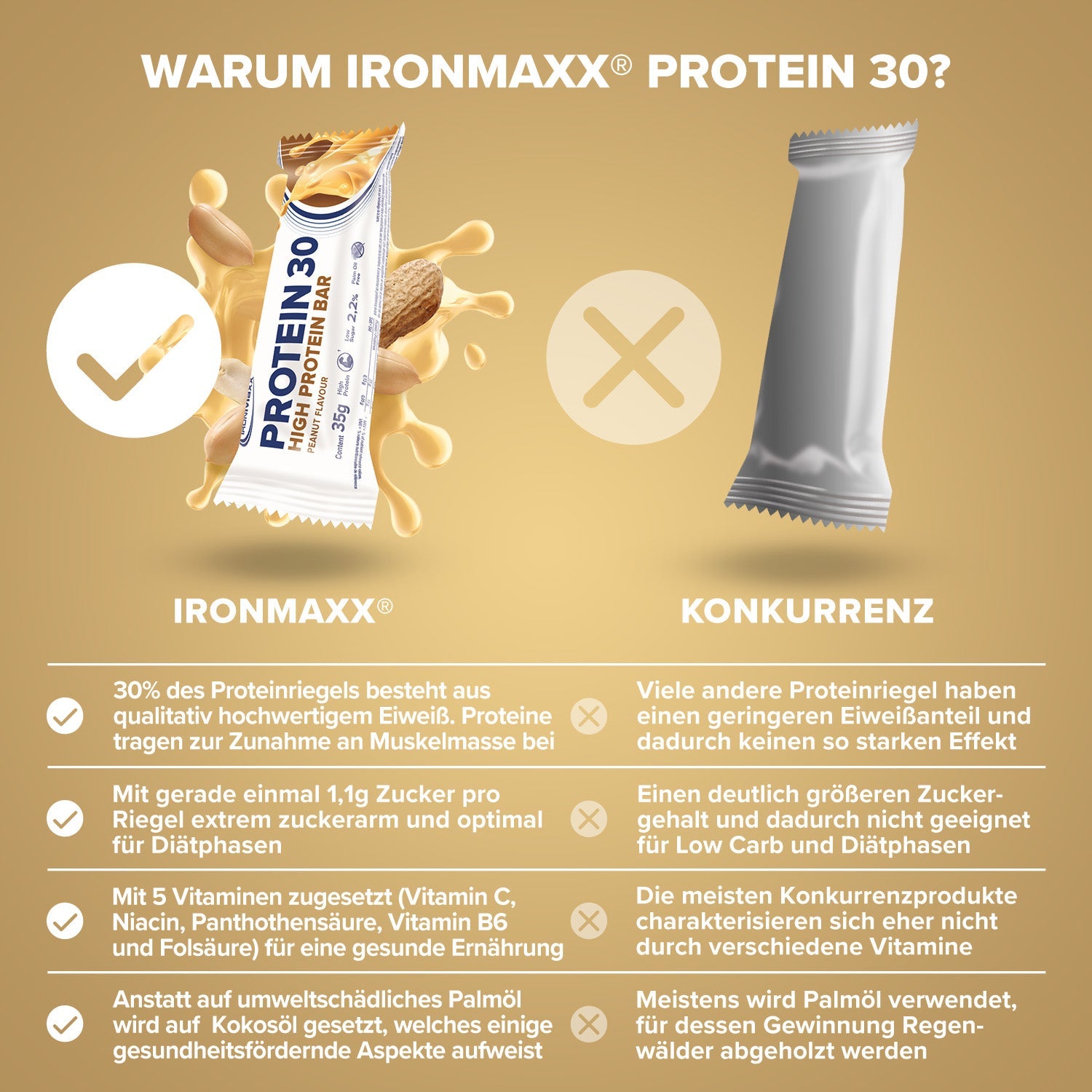 Du suchst einen praktischen Eiweißriegel für unterwegs oder als schnellen Snack zu Hause? Dann ist der IronMaxx® Protein Bar 30 genau das Richtige für dich! Mit 30 % hochwertigem Eiweiß aus Molken-, Soja- und Milcheiweiß unterstützt er Muskelaufbau und Regeneration – ideal als Pre-, Intra- oder Post-Workout-Snack.