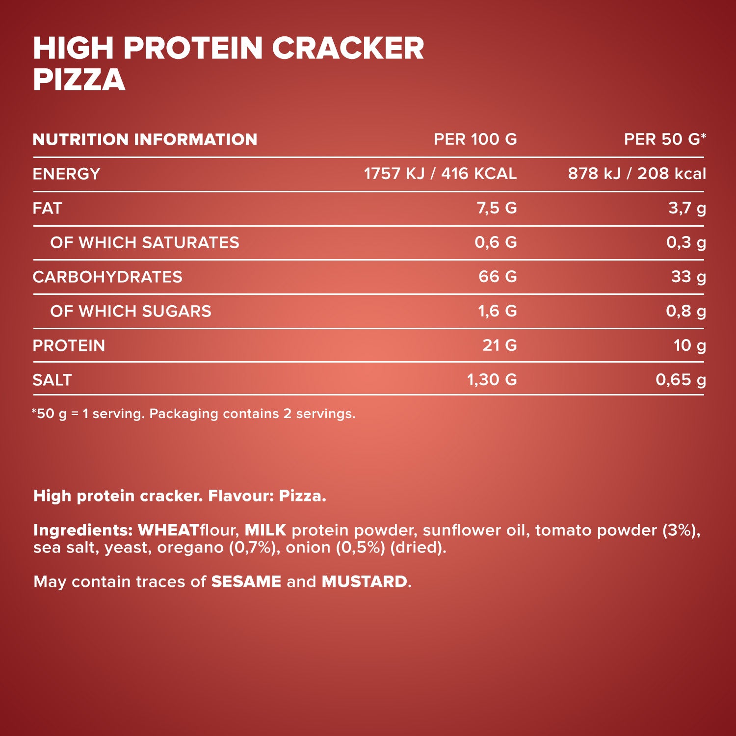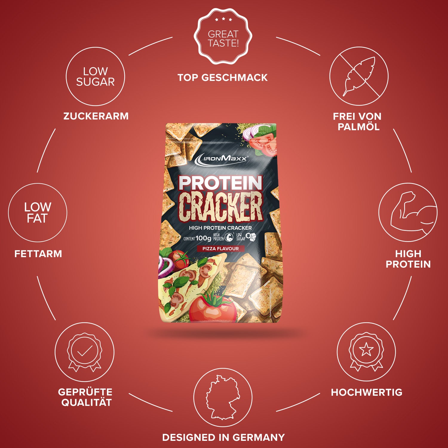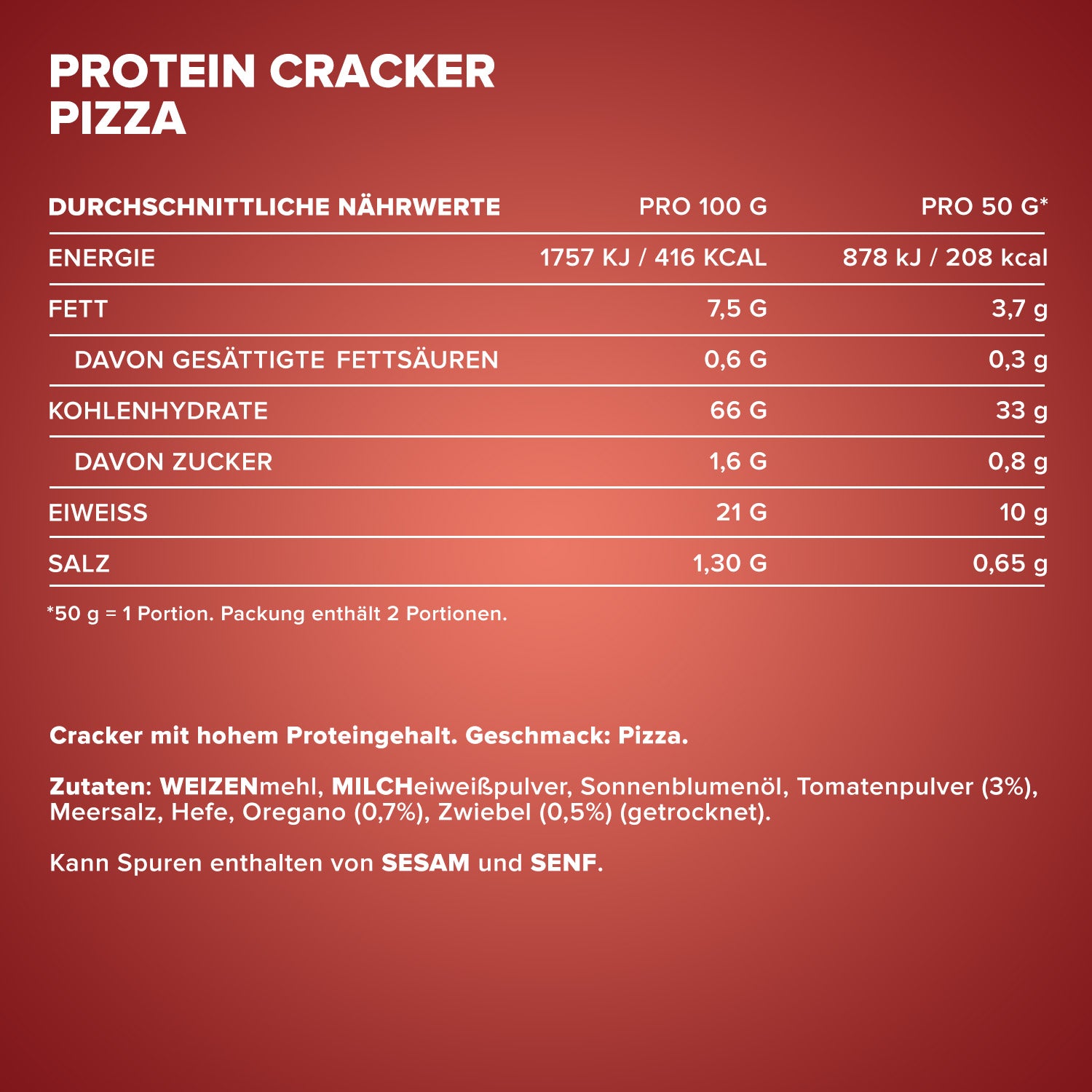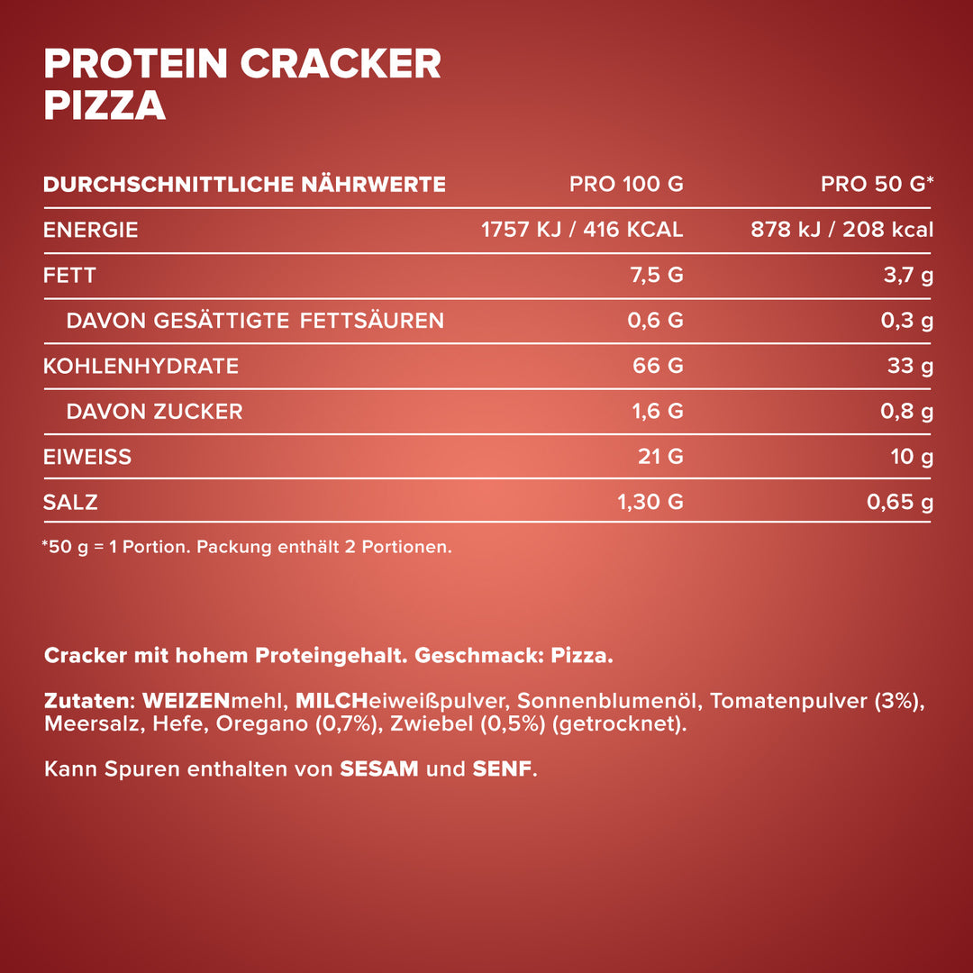 Verkehrsbezeichnung: Cracker mit hohem Proteingehalt. Geschmack: Pizza.