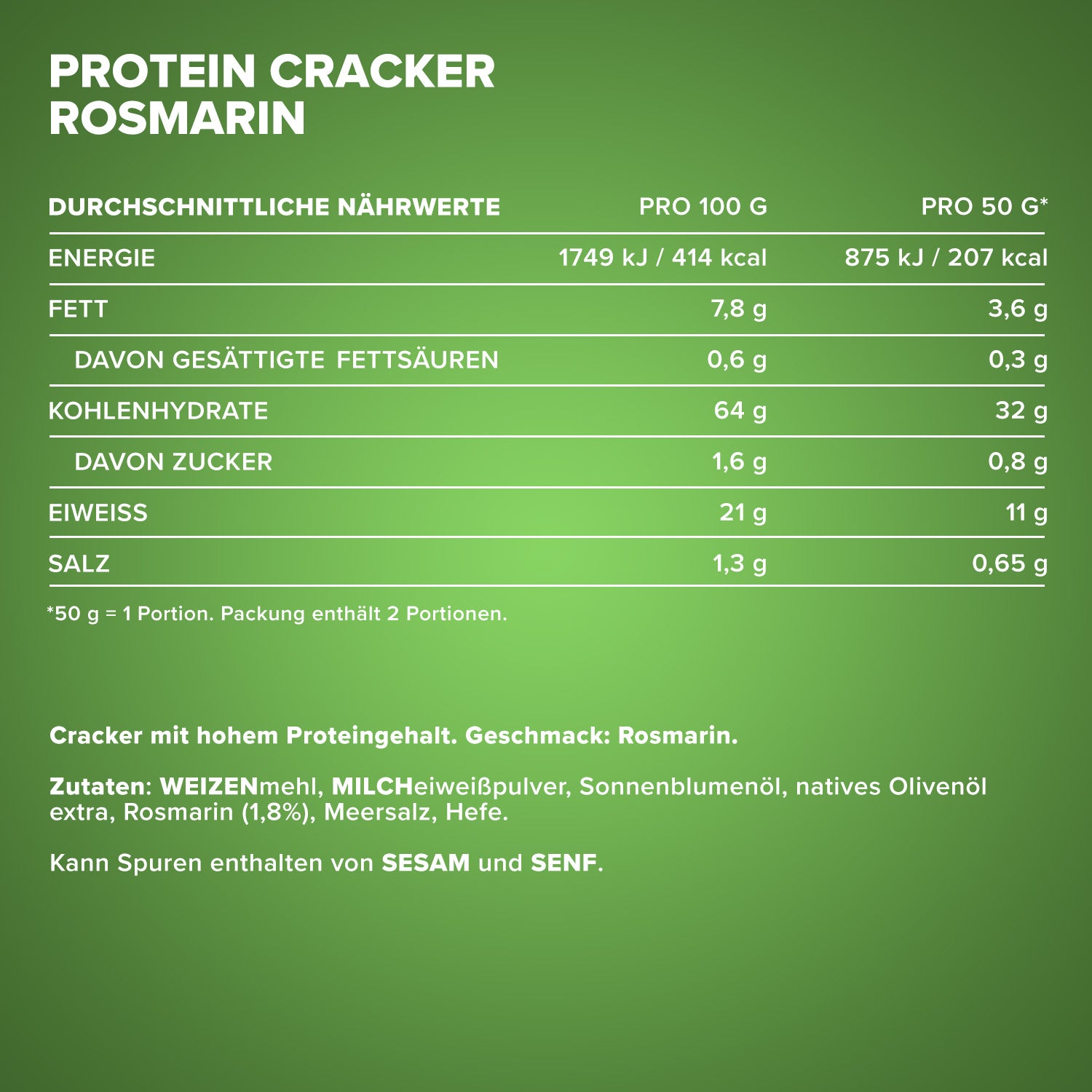 Verkehrsbezeichnung: Cracker mit hohem Proteingehalt. Geschmack: Rosmarin.