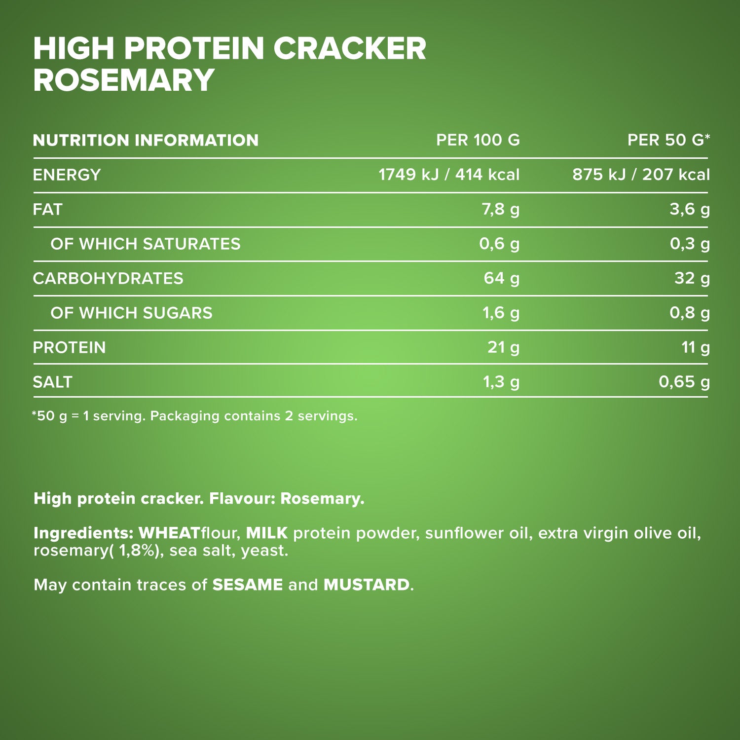 WEIZENmehl, MILCHeiweißpulver, Sonnenblumenöl, natives Olivenöl extra, Rosmarin (1,8%), Meersalz, Hefe.