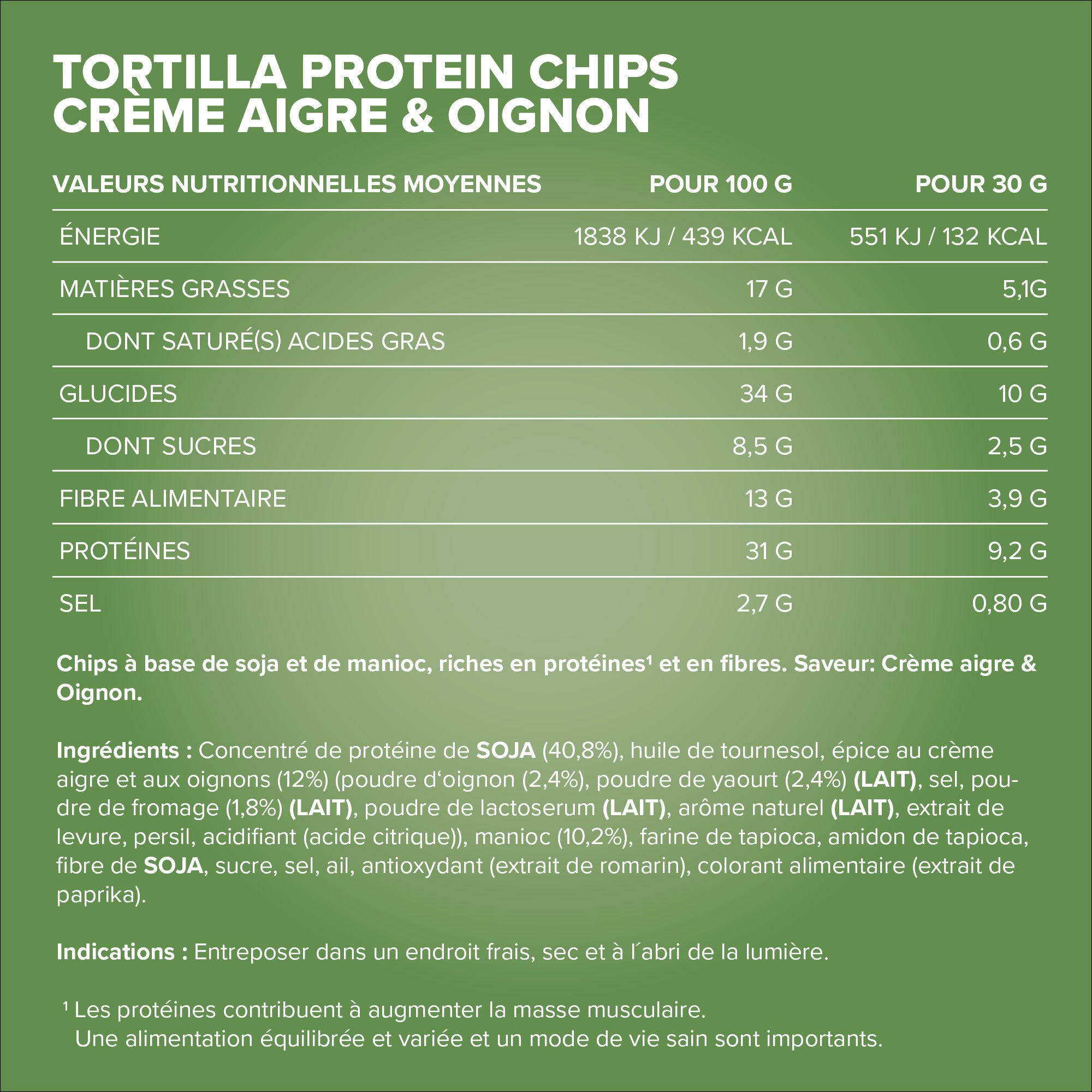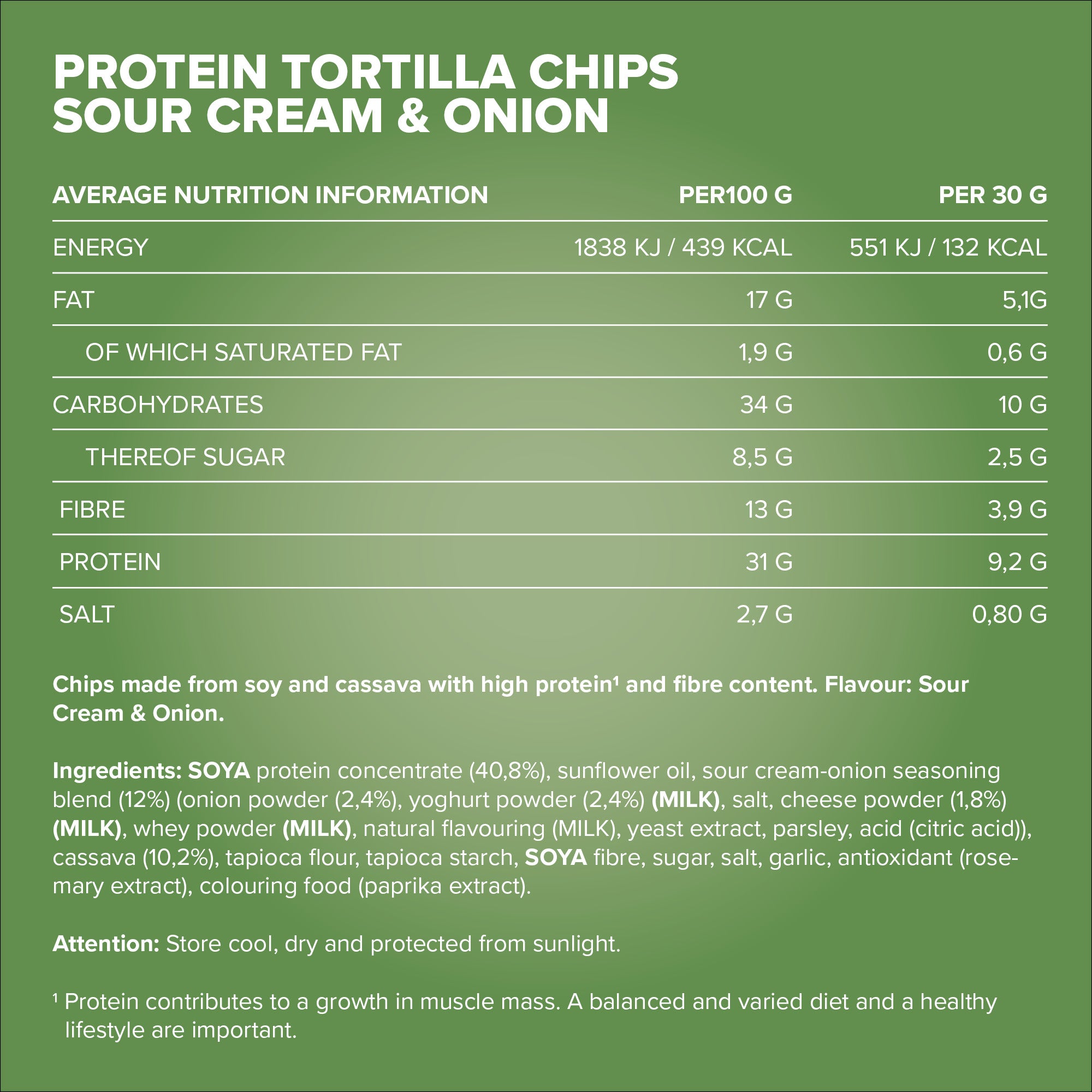 SOJAeiweißkonzentrat (40,8%), Sonnenblumenöl, Saure Sahne-Zwiebel-Würzmischung (12%) (Zwiebelpulver (2,4%), Joghurtpulver (2,4%) (MILCH), Salz, Käsepulver (1,8%) (MILCH), Molkenpulver (MILCH), natürliches Aroma (MILCH), Hefe-Extrakt, Petersilie, Säuerungmittel (Citronensäure)), Maniok (10,2%), Tapiokamehl, Tapiokastärke, SOJAfaser, Zucker, Salz, Knoblauch, Antioxidationsmittel (Rosmarin-Extrakt), färbendes Lebensmittel (Paprika-Extrakt).