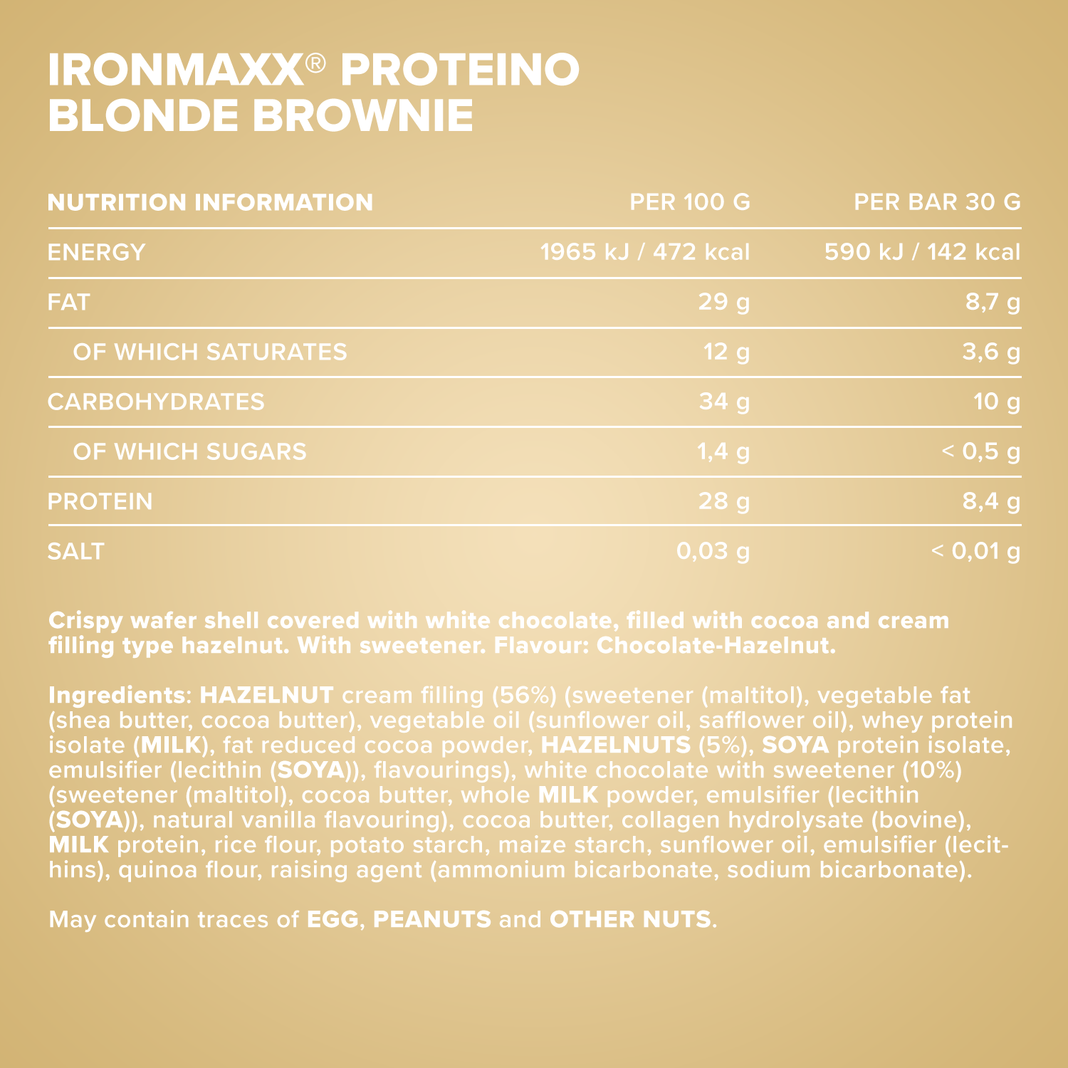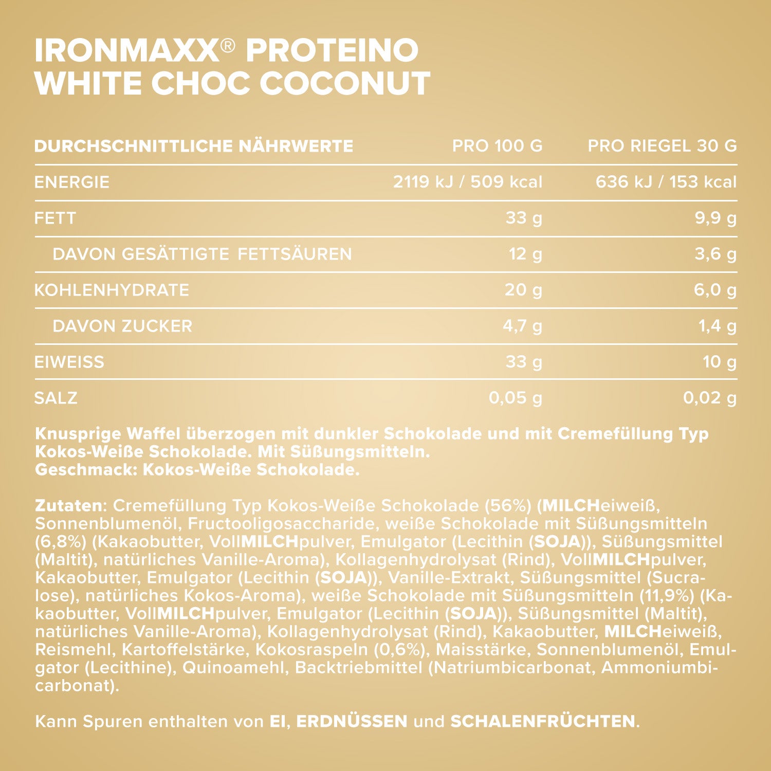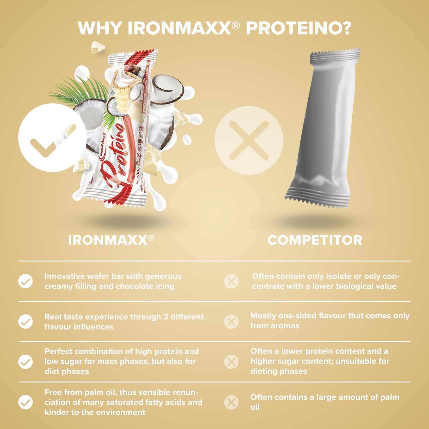 Der Proteino® von IronMaxx® ist der Proteinriegel, auf den Schoko-Fans gewartet haben: Knusprige Waffel, zart-cremige Füllung und ein feiner Schokoladenüberzug machen ihn zum echten Highlight – bei weniger als 1,5 g Zucker pro Riegel.