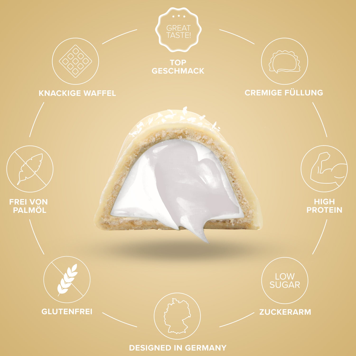 Cremefüllung Typ Kokos-Weiße Schokolade (56%) (MILCHeiweiß, Sonnenblumenöl, Fructooligosaccharide, weiße Schokolade mit Süßungsmitteln (6,8%) (Kakaobutter, VollMILCHpulver, Emulgator (Lecithin (SOJA)), Süßungsmittel (Maltit), natürliches Vanille-Aroma), Kollagenhydrolysat (Rind), VollMILCHpulver, Kakaobutter, Emulgator (Lecithin (SOJA)), Vanille-Extrakt, Süßungsmittel (Sucralose), natürliches Kokos-Aroma), weiße Schokolade mit Süßungsmitteln (11,9%) (Kakaobutter, Emulgator (Lecithin (SOJA)), VollMILCHpulver, Süßungsmittel (Maltit), natürliches Vanille-Aroma), Kollagenhydrolysat (Rind), Kakaobutter, MILCHeiweiß, Reismehl, Kartoffelstärke, Kokosraspeln (0,6%), Maisstärke, Sonnenblumenöl, Emulgator (Lecithine), Quinoamehl, Backtriebmittel (Natriumbicarbonat, Ammoniumbicarbonat).